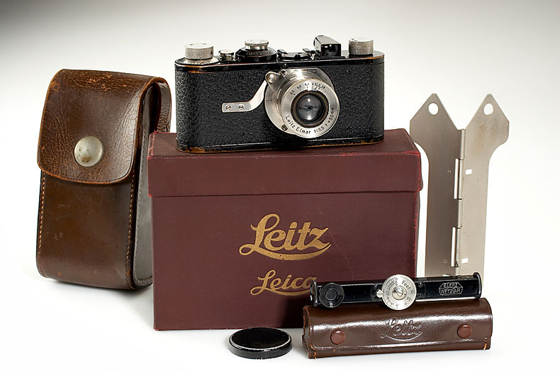 very nice, clean, rare and very early export version with close-focus Elmar 3.5/50mm, all features original (feathered arrows on knobs, mushroom release button, early leather and base plate), rare unmarked lens cap, special leather case ETRUX first version, FODIS rangefinder in Feet (engraved: Germany, with leather case), ABLON nickel template, red maker's box with gold imprinting 'Leitz Leica' and stamped 'GERMANY' in circle on base - a very unusual outfit especially in this condition, see also von Einem: 'Die 10 Varianten der klassischen Leica I A mit Elmar 1:3.5 F=50mm'