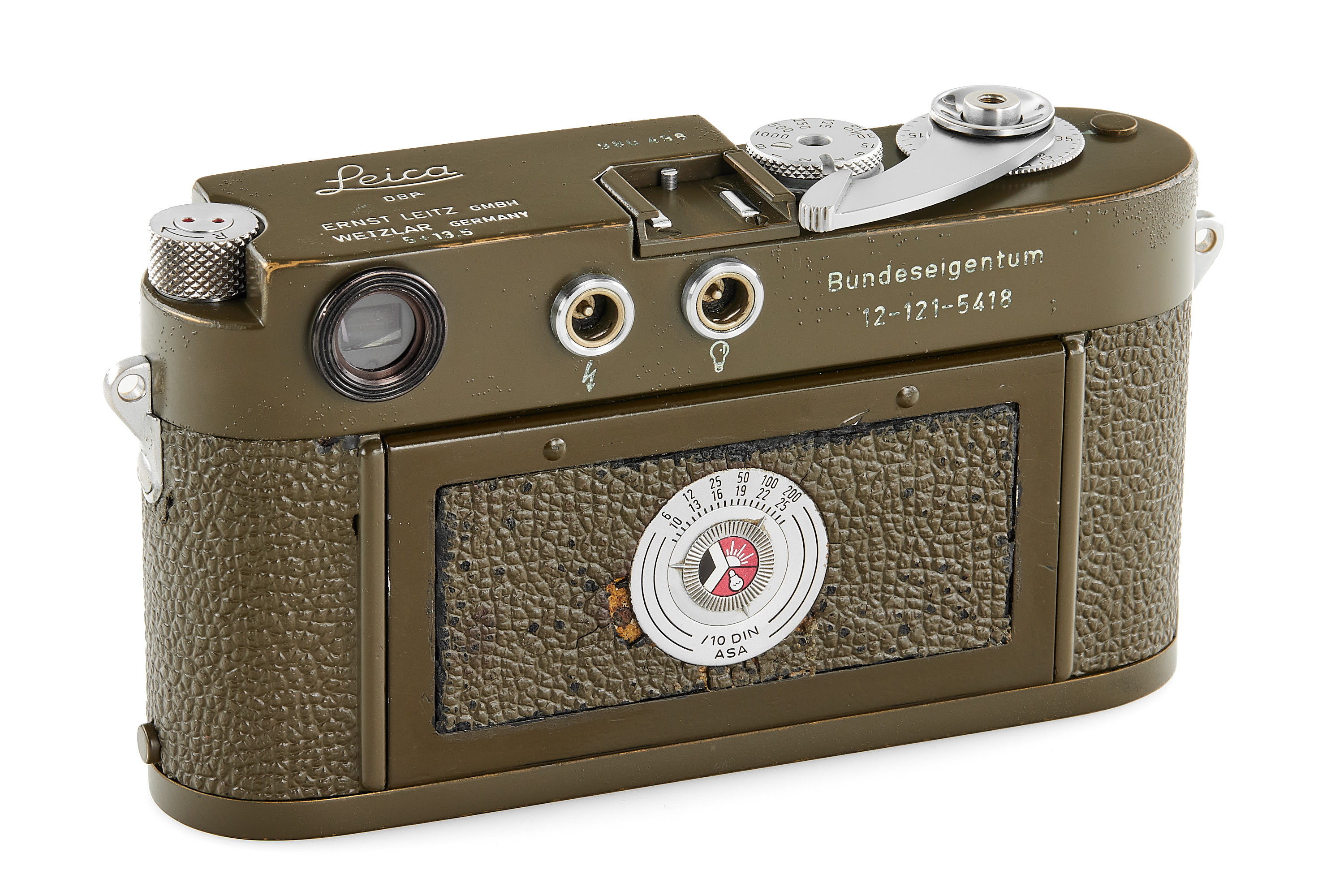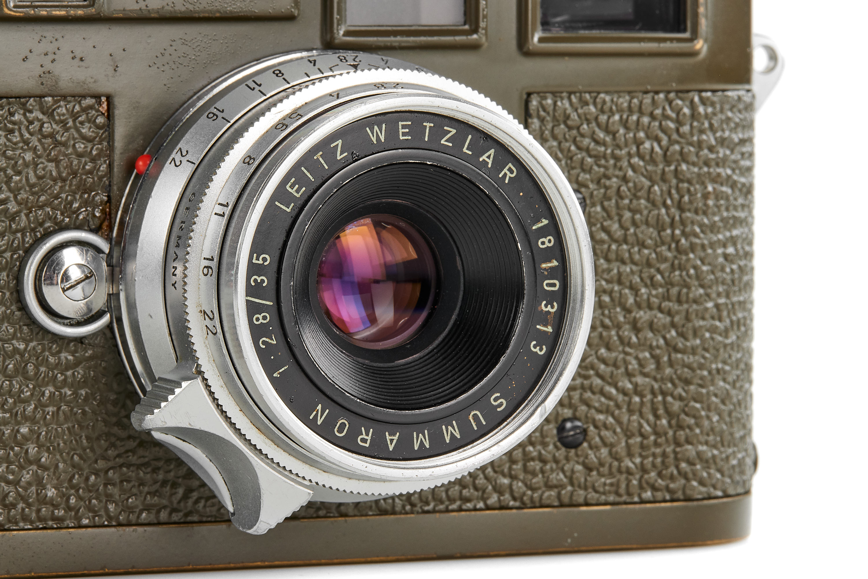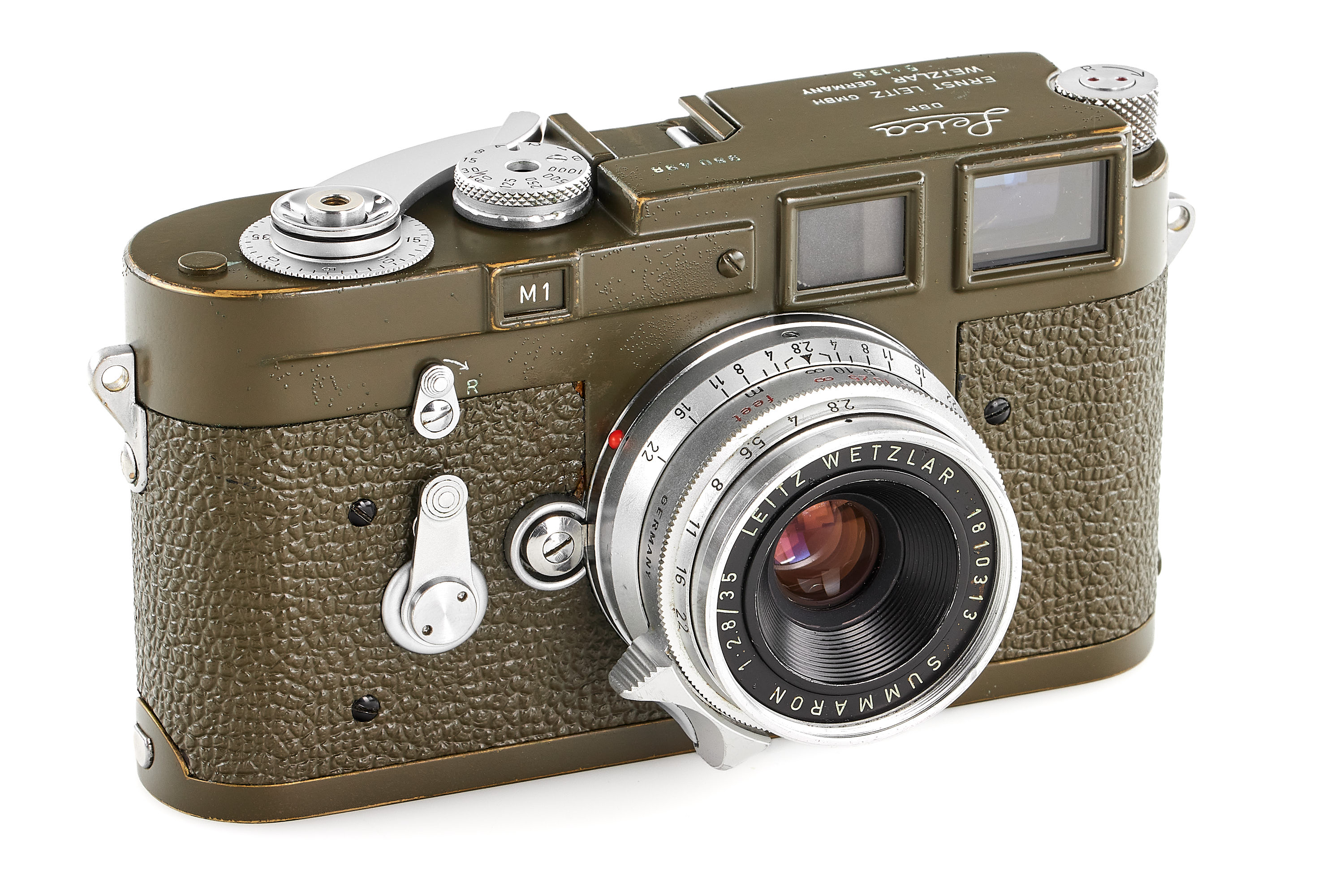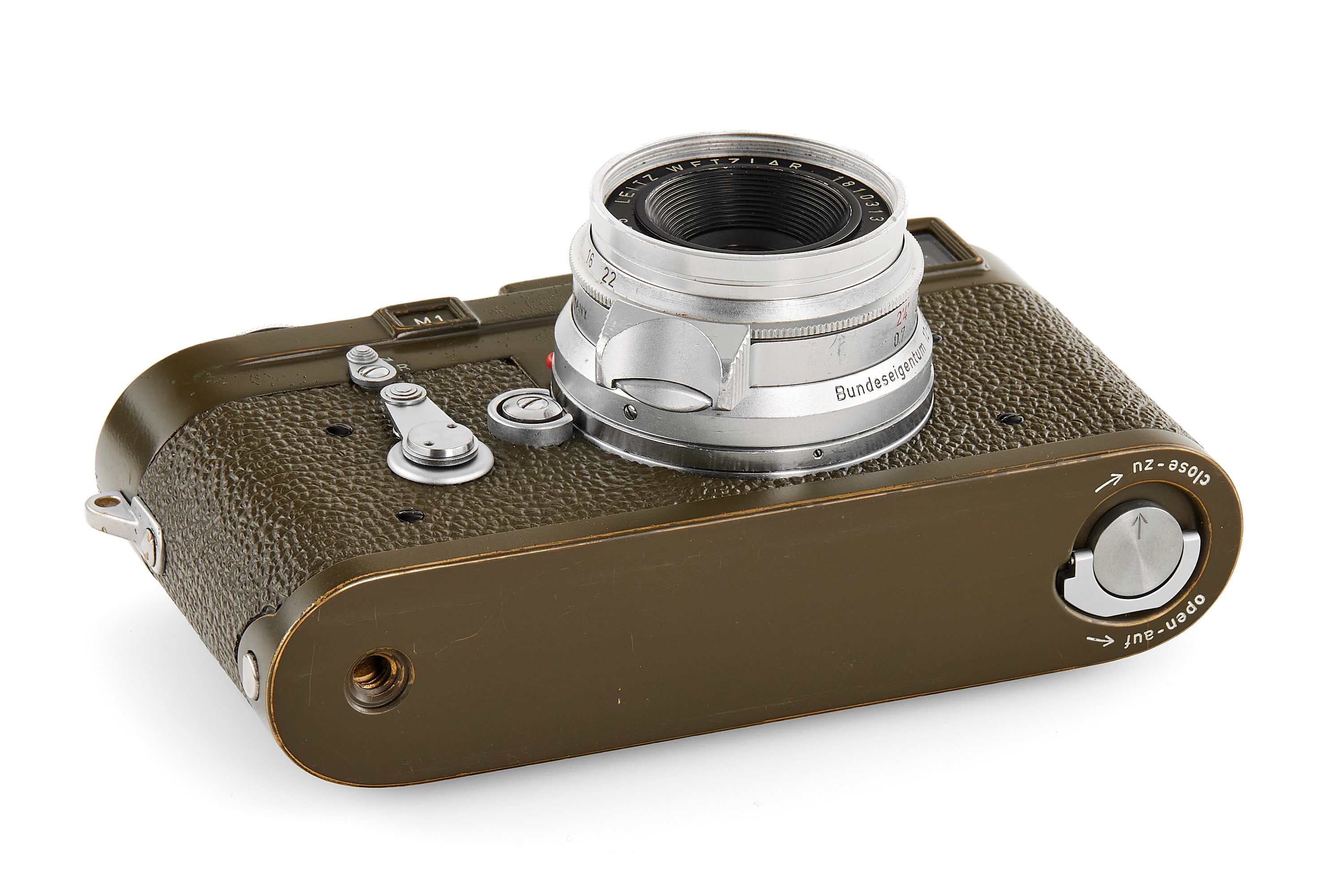 Original, first batch Leica M1 olive engraved "Bundeseigentum 12-121-5418", rare version with '5+13.5cm' engraving near the eyepiece, with MP top plate (only 75 of these cameras were produced and delivered to Wilhelmshaven and Kiel in 1960/61), in very good condition, showing typical small bubbles in paint, the vulcanite was once replaced and the camera was modified by Leica with 35mm frames, it also comes with a matching 'Bundeseigentum' Summaron 2.8/35mm no.1810313, this rare lens was delivered to German Marine, Kiel on 25.10.1961.