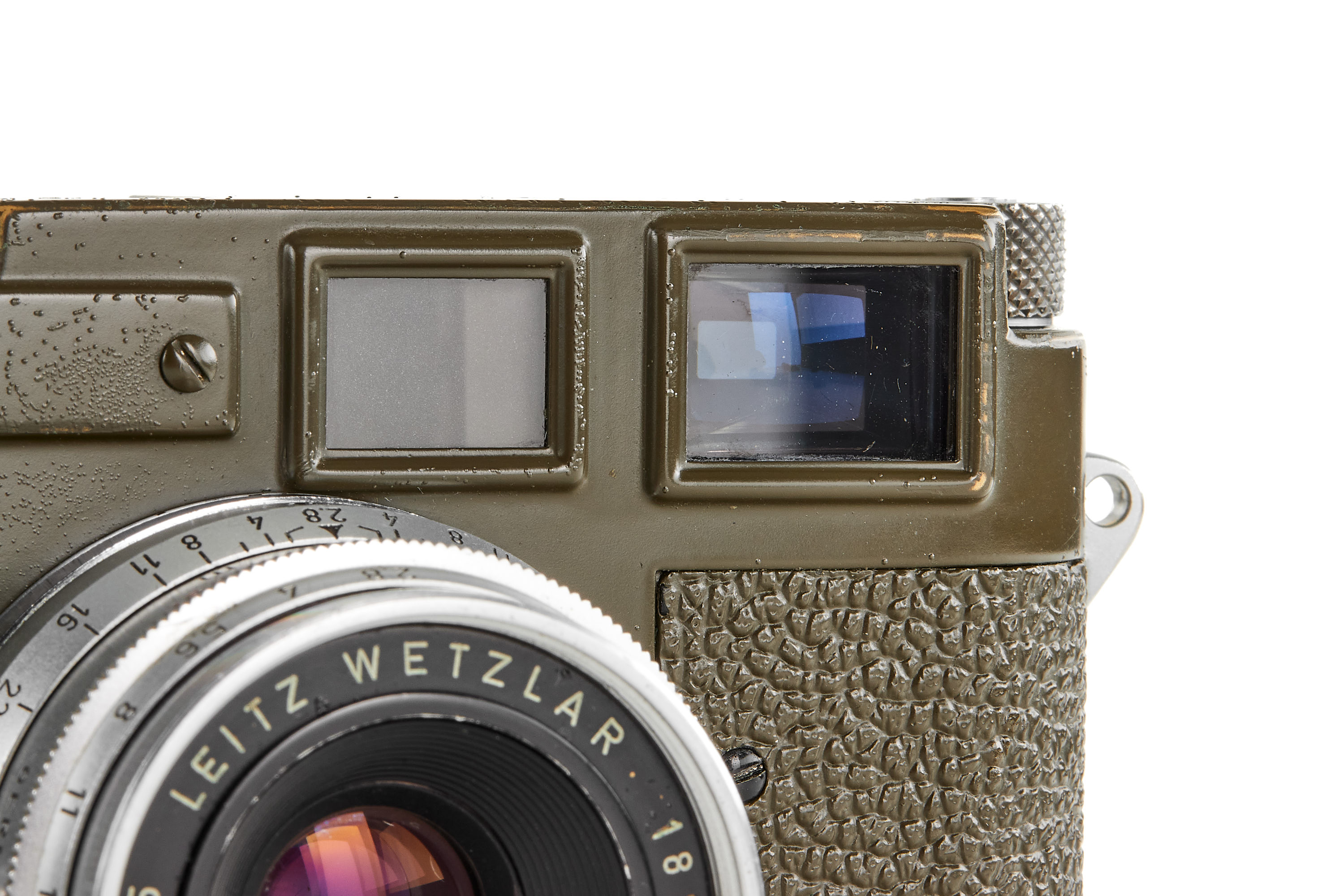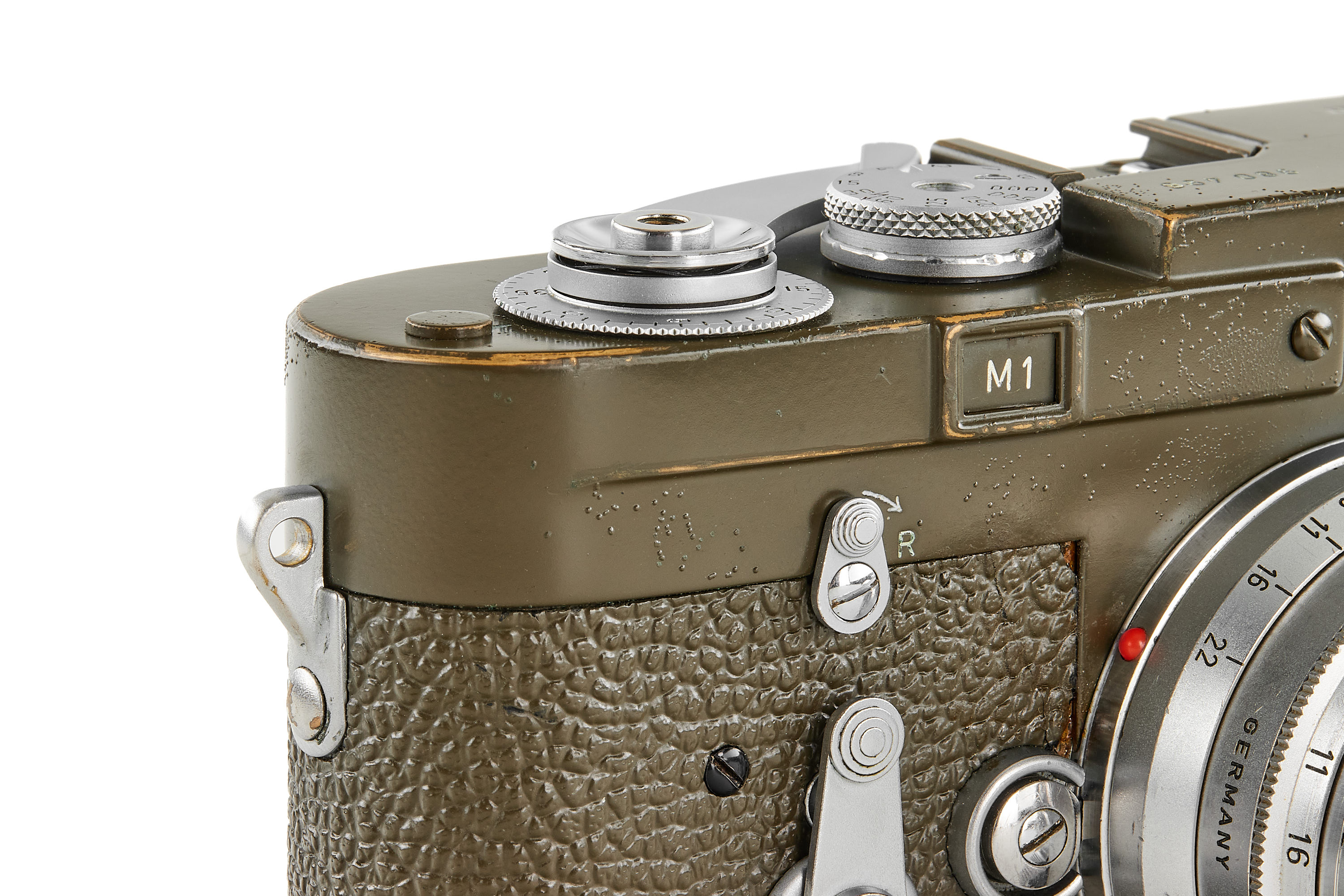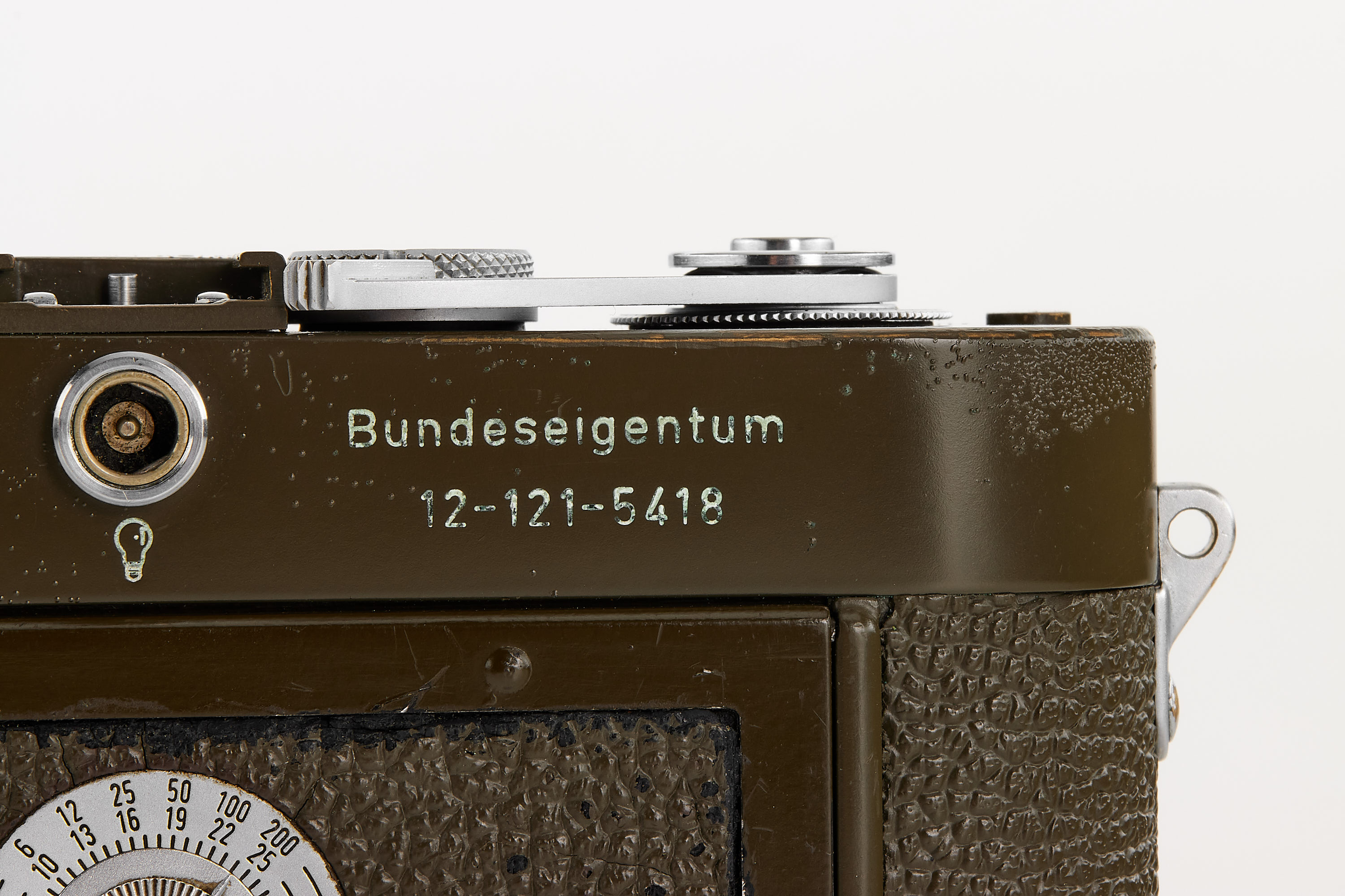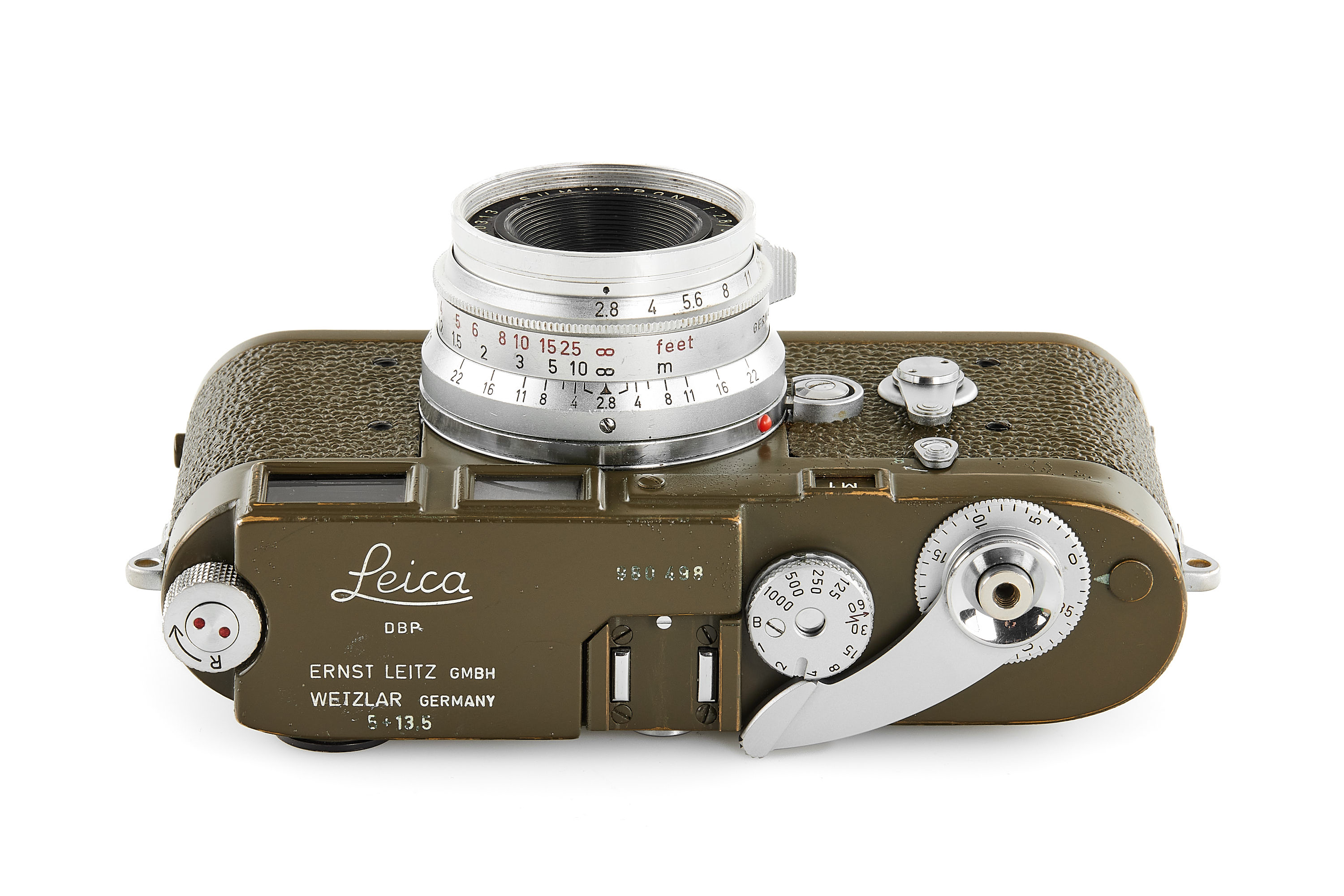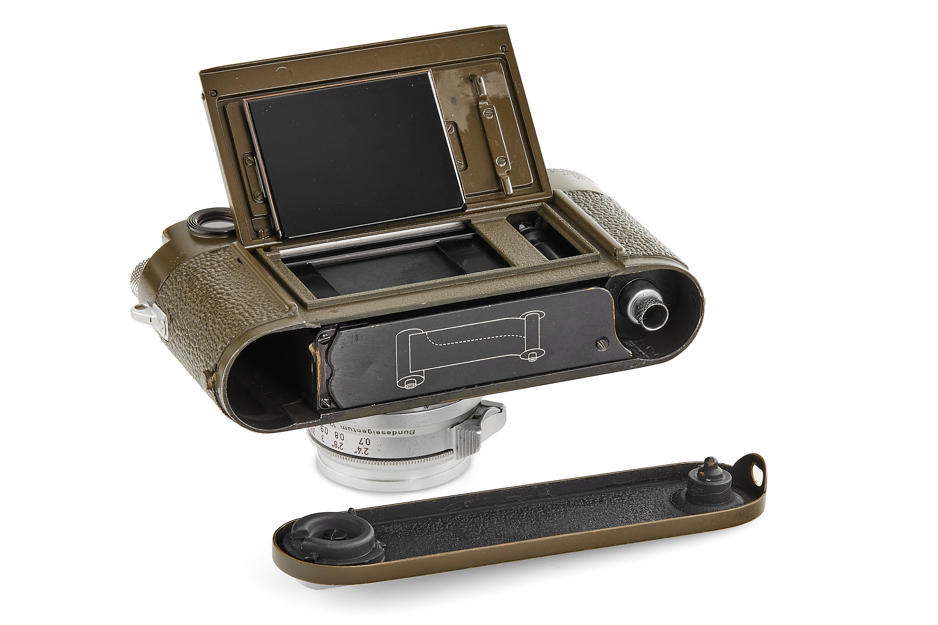 Original, first batch Leica M1 olive engraved "Bundeseigentum 12-121-5418", rare version with '5+13.5cm' engraving near the eyepiece, with MP top plate (only 75 of these cameras were produced and delivered to Wilhelmshaven and Kiel in 1960/61), in very good condition, showing typical small bubbles in paint, the vulcanite was once replaced and the camera was modified by Leica with 35mm frames, it also comes with a matching 'Bundeseigentum' Summaron 2.8/35mm no.1810313, this rare lens was delivered to German Marine, Kiel on 25.10.1961.