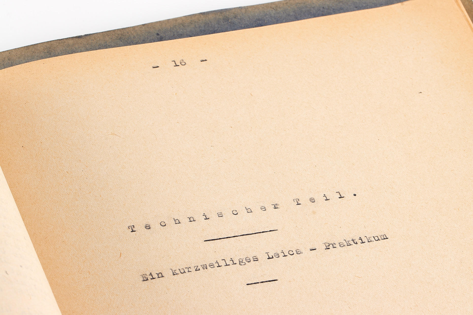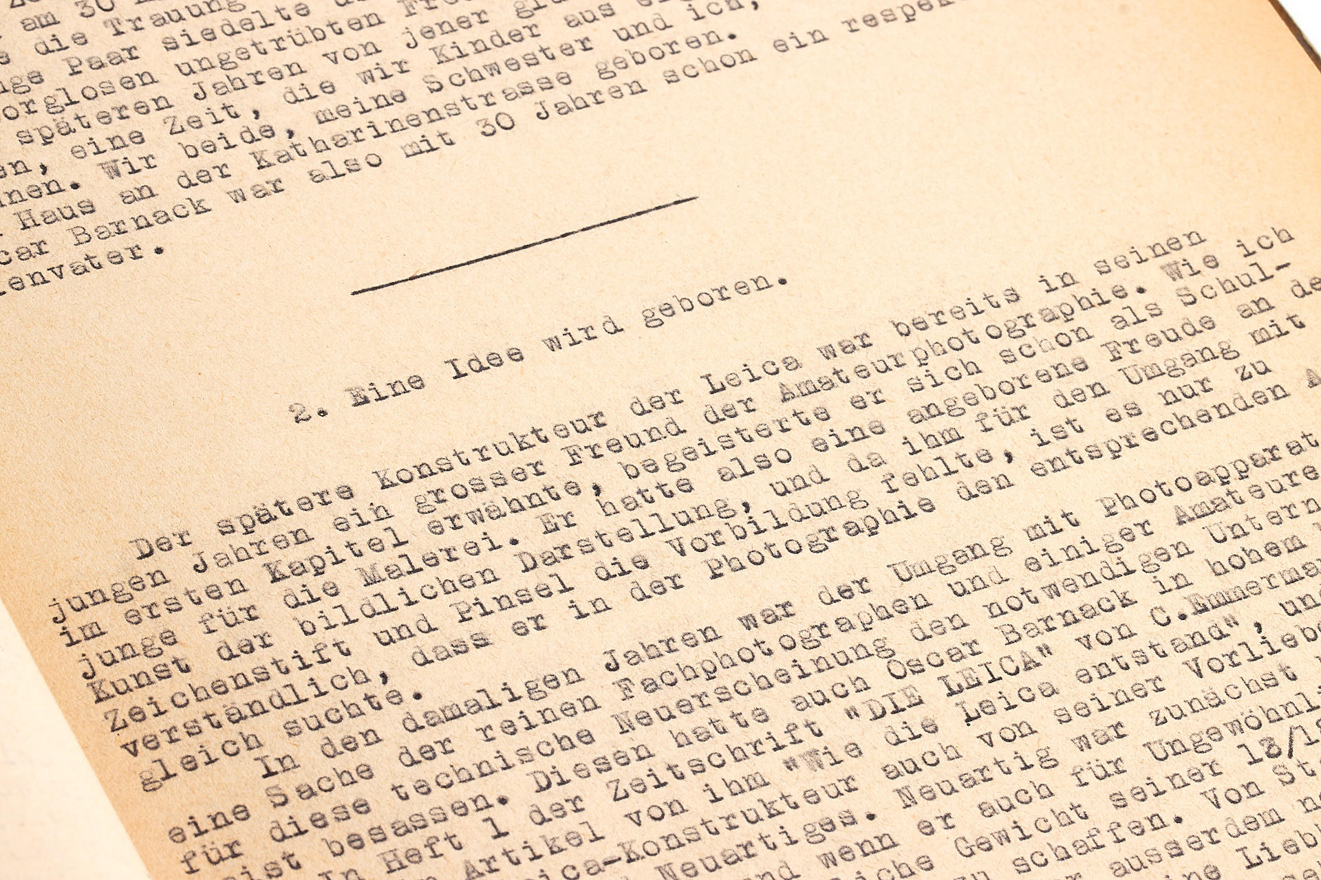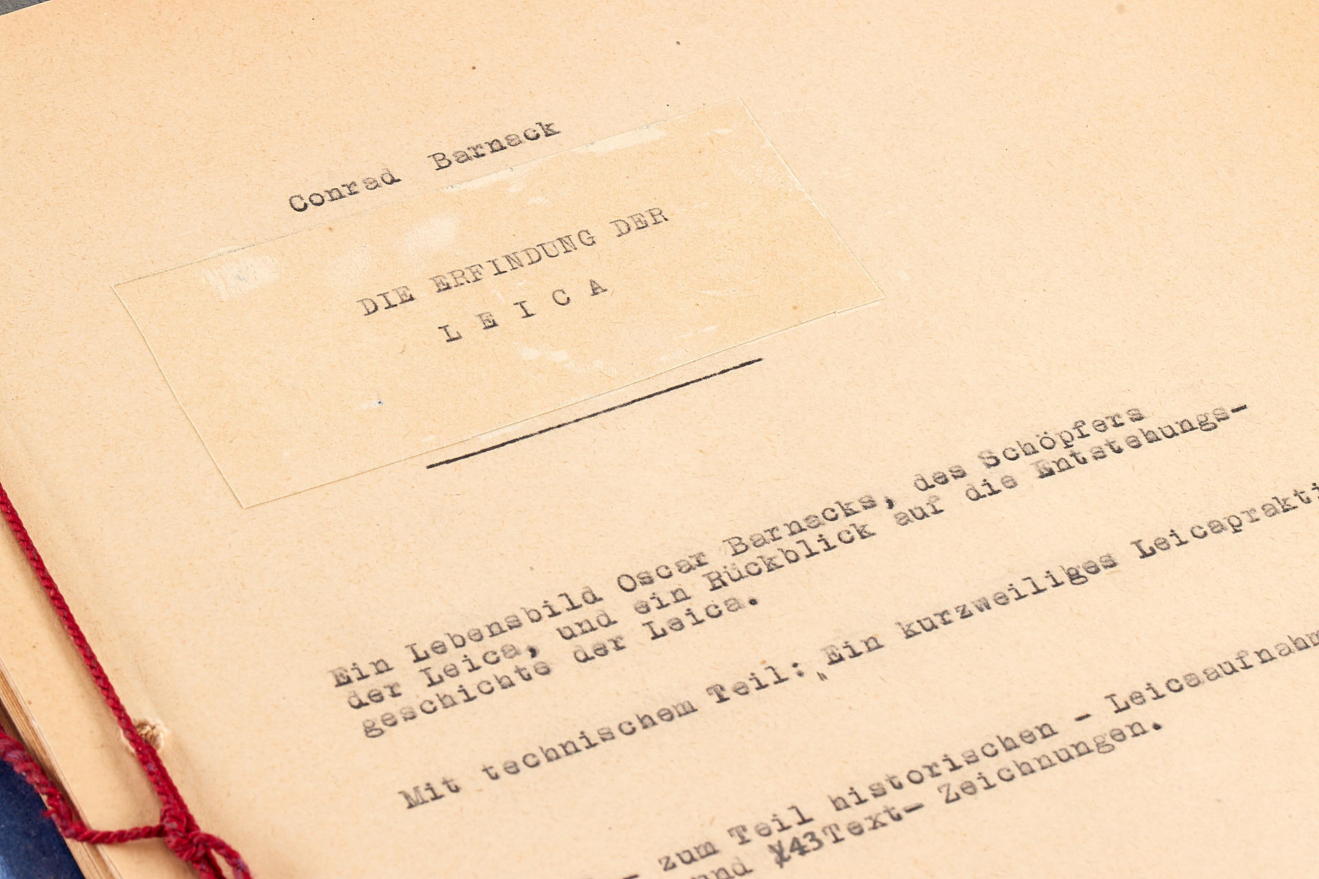 An original manuscript of a never-published book written by the son of Oskar Barnack. Written in German, the book bears two titles: on the cover of the order it is called 'Das Buch von der Leica' (The Book of Leica), on the first page it was corrected to 'Die Erfindung der Leica' (The invention of the Leica). The author describes the content of the book as 'A portrait of the life of Oscar Barnack, the creator of the Leica, and a look back at the history of the Leica'. The manuscript contains 45 pages with 1 to 15 being a biographic story of Oskar Barnack and 17-45 a witty written practical manual. The book was never published and is widely unknown, it is an important document from the history of Leica and its inventor - Oskar Barnack.