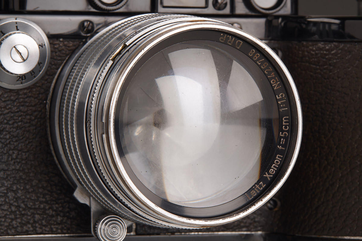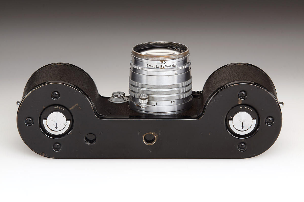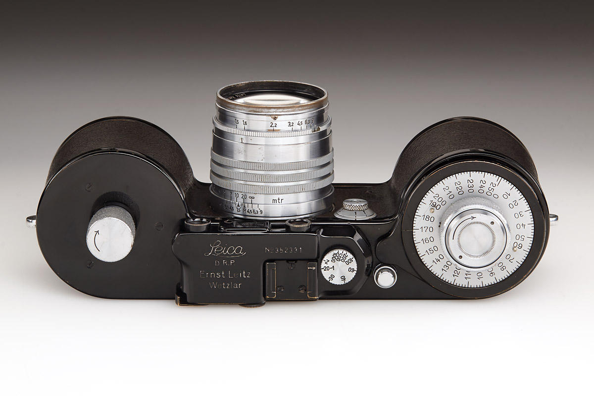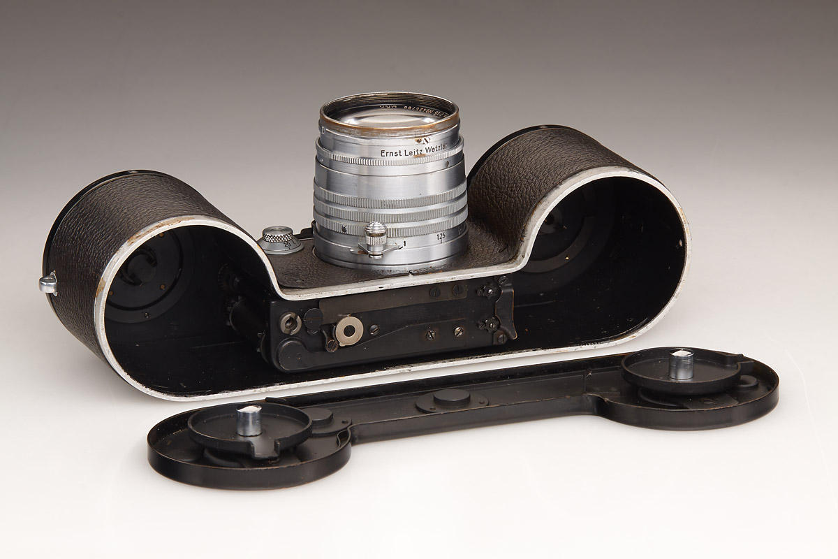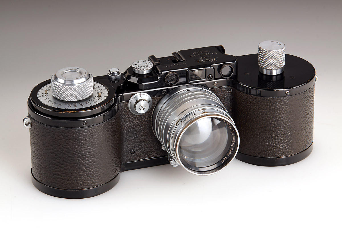 Wartime camera in beautiful original condition, with Xenon 1.5/5 cm no.426788, ESFOO everready case. The Leica 250 or Reporter was introduced in 1934, bearing serial numbers from 130001 (1934) to 359916 (1953); total production is less than one thousand cameras. The unusually shaped Leica produced 250 photographs on 33 feet of film in special cassettes. The characteristic of the 250 are the enlarged film chambers at each end of the camera. Two variations were available: the first version (FF model) had a top speed of 1/500 second, the second version (GG model) a top speed of 1/1000 second. The Leica Reporter is highly valued by collectors, especially in this very fine condition. Die Leica 250 oder Reporter wurde 1934 auf den Markt gebracht mit Seriennummern von 130.001 (1934) bis 359.916 (1953), die Gesamtproduktion betrug weniger als 1.000 Kameras. Die ungewöhnlich geformte Leica ermöglicht 250 Aufnahmen auf 10m Film in Spezialkassetten. Charakteristisch für die 250 sind die vergrößerten Filmkammern auf beiden Seiten der Kamera. Es wurden zwei Modelle gebaut: Die erste Version FF (basierend auf der Leica III) mit Verschlusszeiten bis 1/500 Sekunde, die zweite Version GG (Leica IIIa) mit Verschlusszeiten bis 1/1000 Sekunde. Die Leica Reporter ist eine sehr gesuchte Kamera unter Sammlern, besonders in diesem hervorragenden Zustand.
