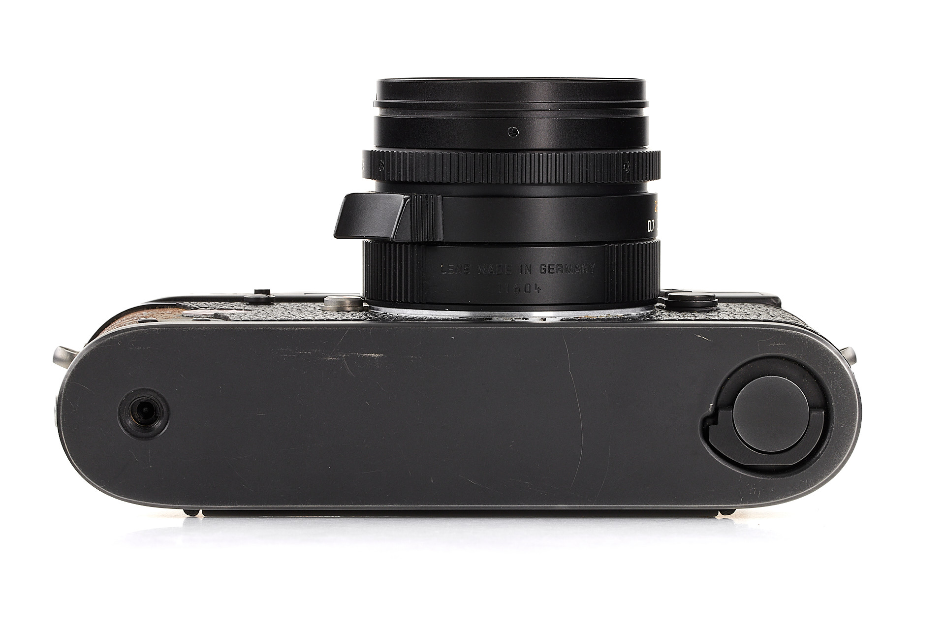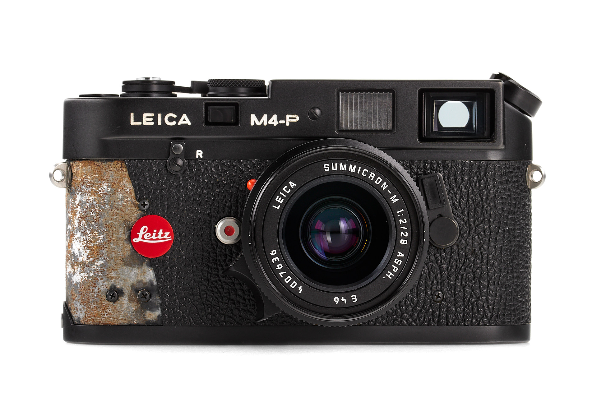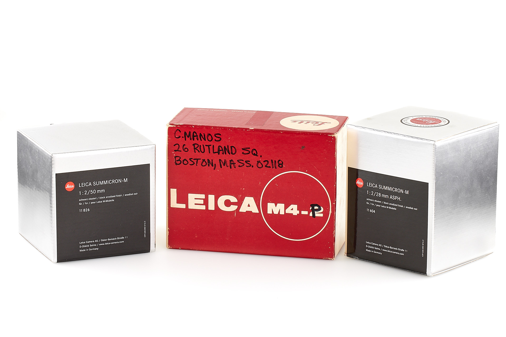 Leica M4-P camera outfit owned and used by award-winning Magnum photographer Constantine Manos. The camera shows signs of years of professional use, a part of the vulcanite covering is missing. This analogue set is complete with two classic reportage lenses — a Summicron-M 2/50mm no.3706684 and Summicron-M 2/28mm ASPH. no.4007636 — as well as a Rapidwinder, Rapidgrip, Sekonic light meter, UV filters and photographer's own camera bag.