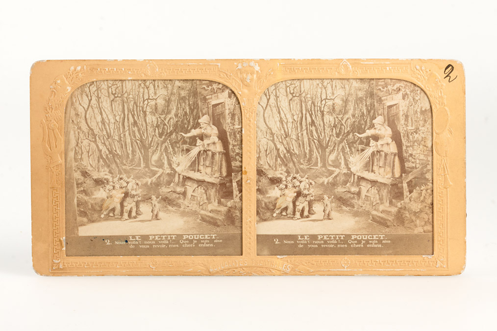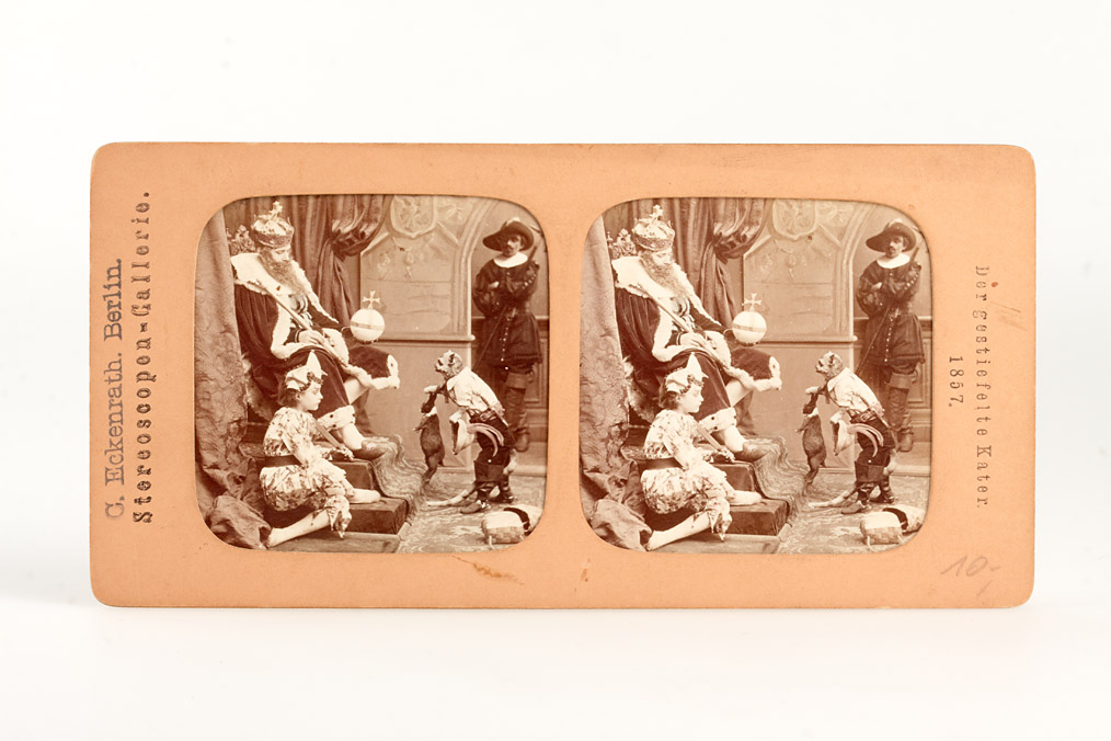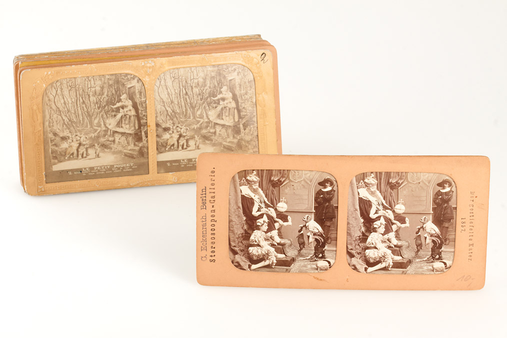 two sets of albumen tissue prints (1) six cards of the set 'Der gestiefelte Kater' (Puss in Boots) by C. Eckenrath Berlin, extremely charming and in very good condition, (2) complete French set 'Le petit Pocet' (Tom Thumb), 6 cards, slightly faded but otherwise in good condition, (3) and 3 French cards with hand-coloured puppet scenes from La Fontaine's tales in good condition.(15)