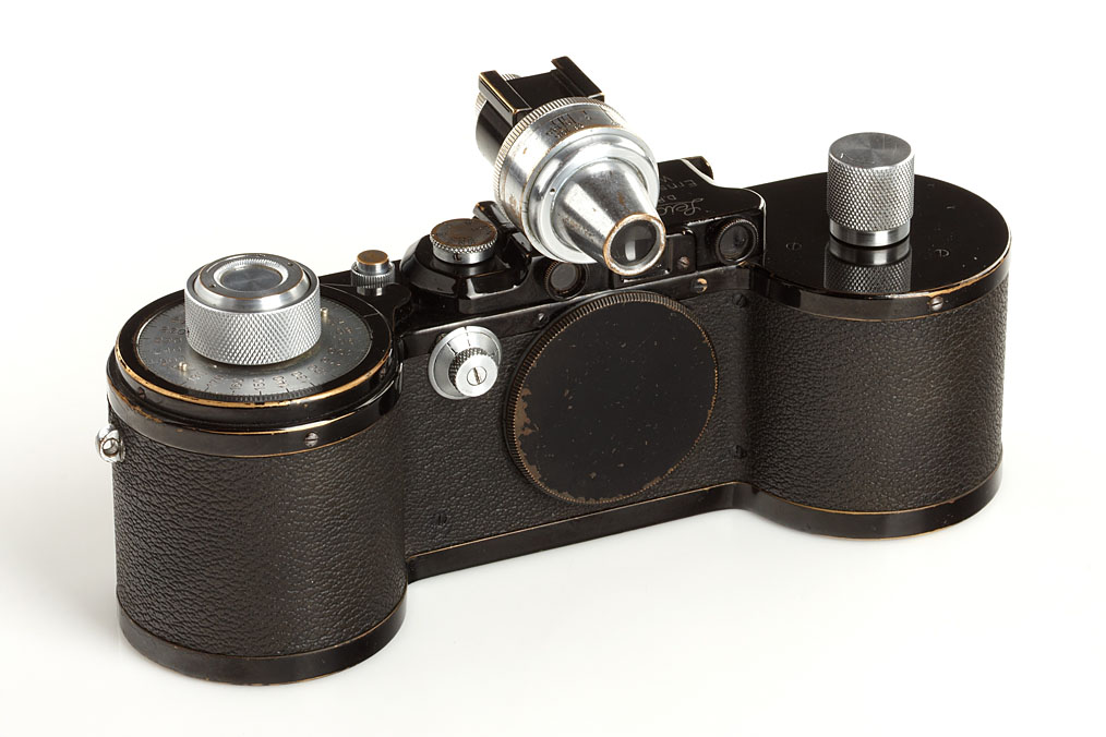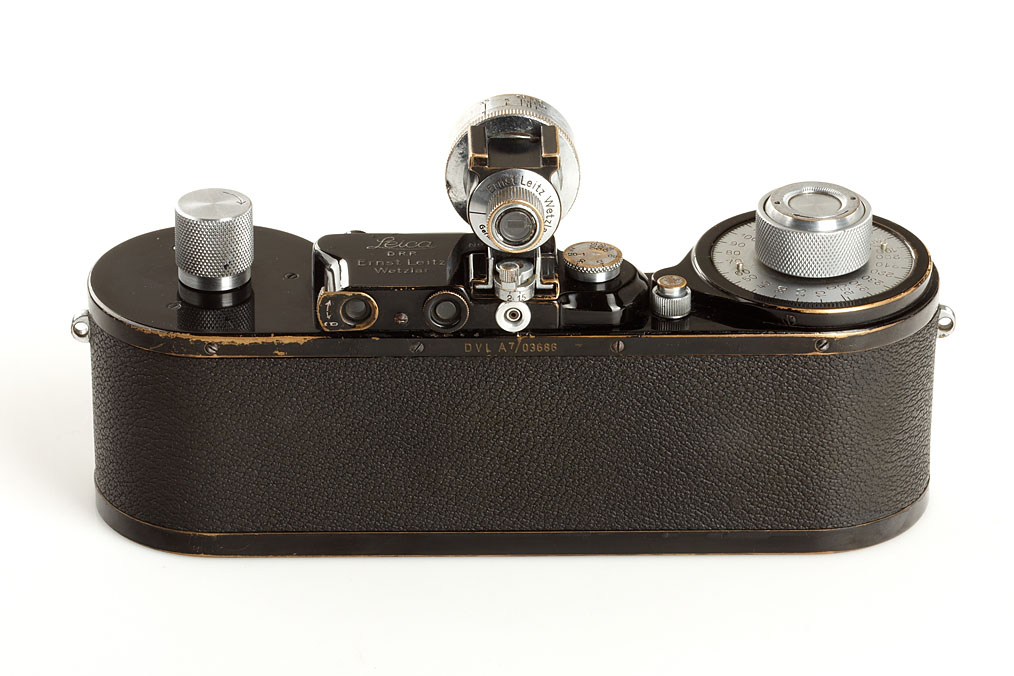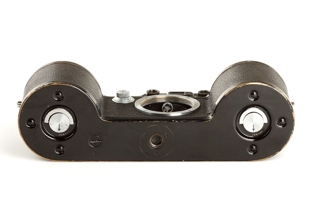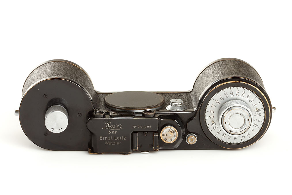 war-time Leica Reporter for 250 exposures in good working condition (shutter speeds to 1/500), chrome knobs, professionally synchronised, some small parts repainted, back of top plate engraved: DVL A7/03686, cap, unusual chrome/black VIDOM finder (33 engraved on rear), rare ESFOO ever-ready case (custom made detachable front part)