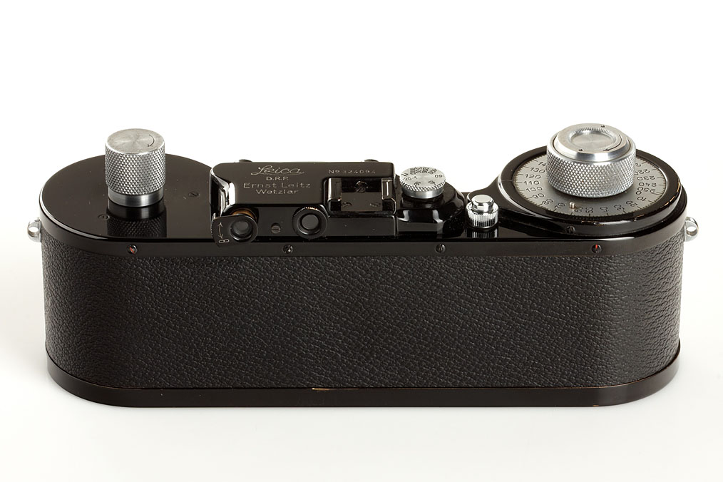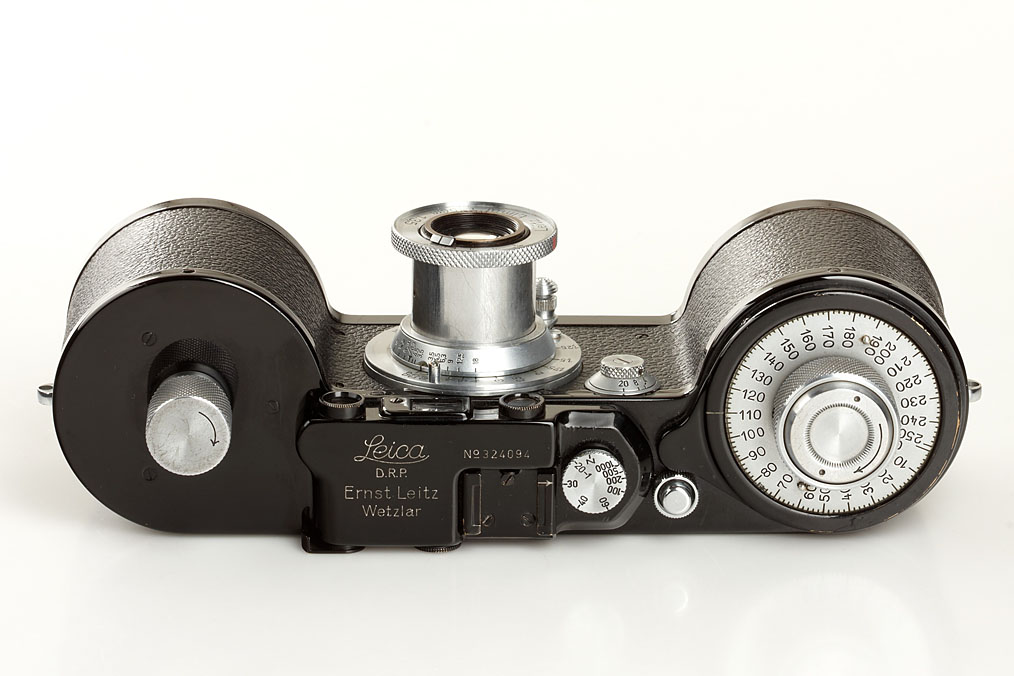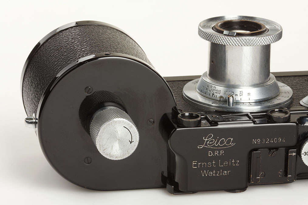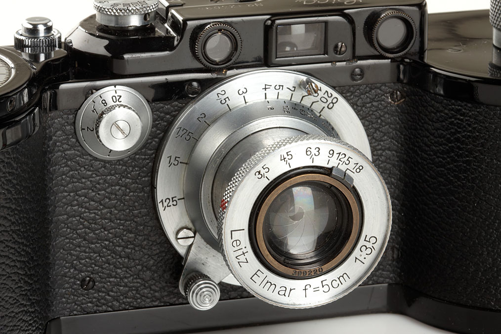 war-time Reporter Leica in fantastic condition (all original except some minimal repaint on the right film chamber), base plate engraved: auf - zu, with matching Elmar 3.5/5cm no.399220 (meter scale), the codeword for this outfit was LOOYE (Leica 250 + Elmar 5cm), with original Leica 250 instruction book (Liste Photo Nr.7434c)