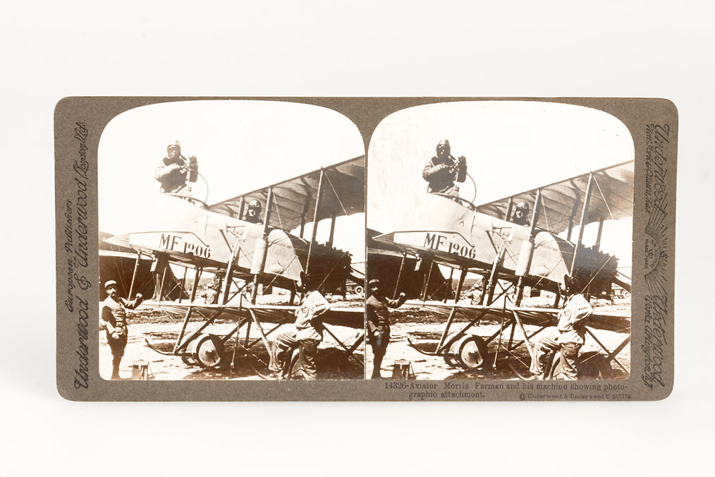 8 printing-out and gelatine silver prints, comprising (1) a view of a bicyclist who has crashed into a group of woman one of whom is holding a folding stereo camera, (2) a view entitled “A Party of camera ‘Friends’ in Yosemite Valley, Cal. U.S.A.”, (3) a view showing President McKinley giving a speech with a stereo-photographer in the foreground, (4) a view entitled 'The River Saguenay at Chicoutimi, Quebec' showing a man with a small folding camera, (5+6) two cards showing World War I aerial photographers in their planes, Together with two cards, (7) one imprinted with “no. 2 Stereo Kodak”, and the other (8) an advertisement for “The Stereo Weno'. Ex Spira Collection.