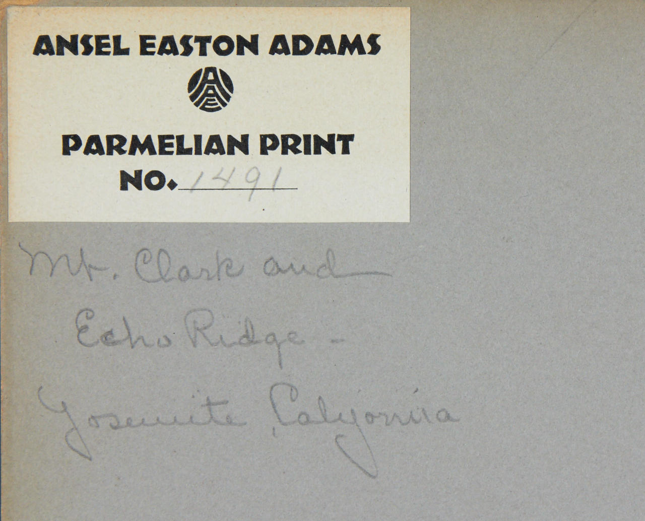 Vintage parmelian print, mounted in original passepartout 14,1 x 19,5 cm Signed by the photographer in pencil in the margin, titled and numbered “No. 1491” by him in pencil on “Ansel Easton Adams Parmelian Print” label affixed to the reverse of the passepartout PROVENANCE Collection Kaspar M. Fleischmann