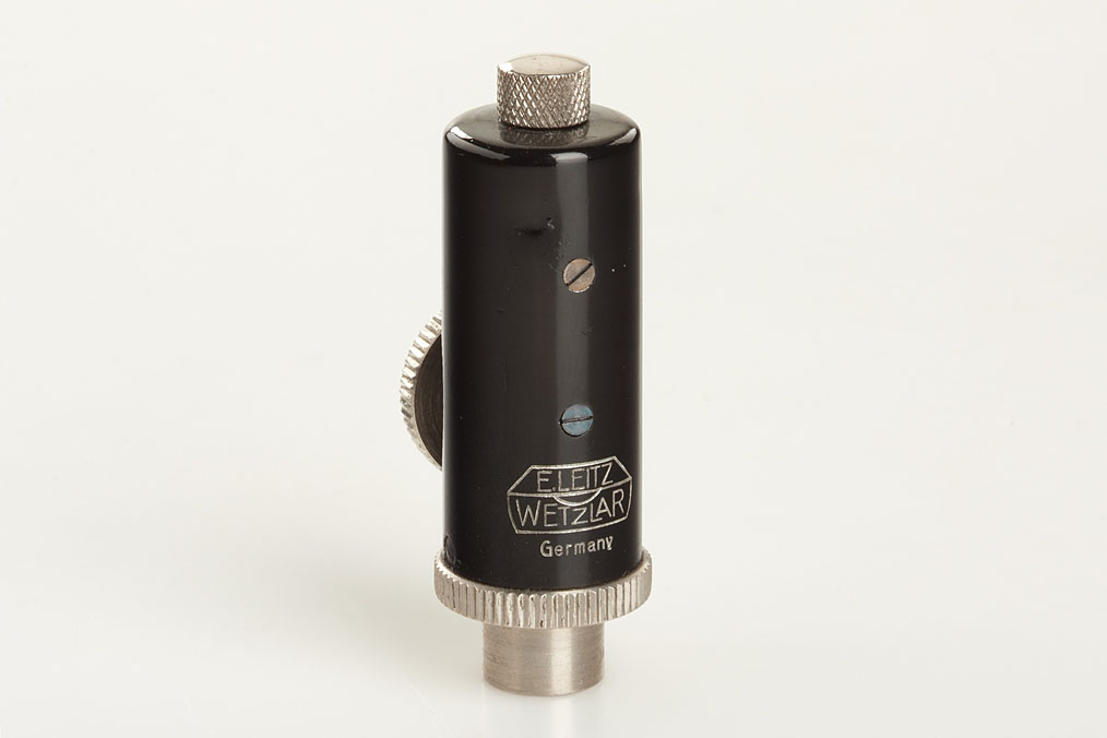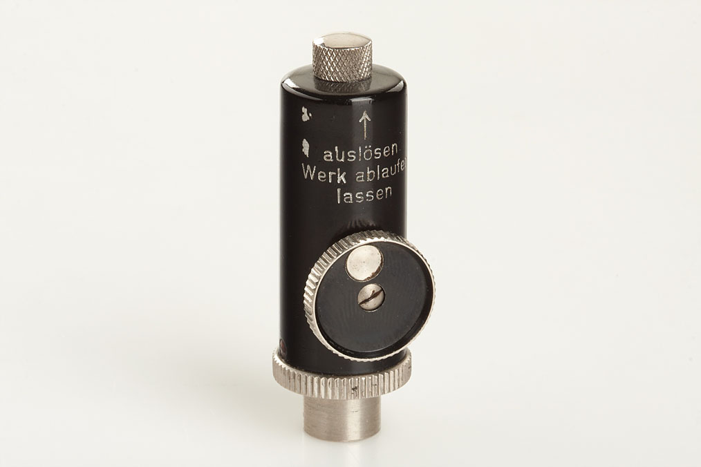 rare first version in black/nickel, engraved: “Auslösen Werk ablaufen lassen” in matching red maker's box
