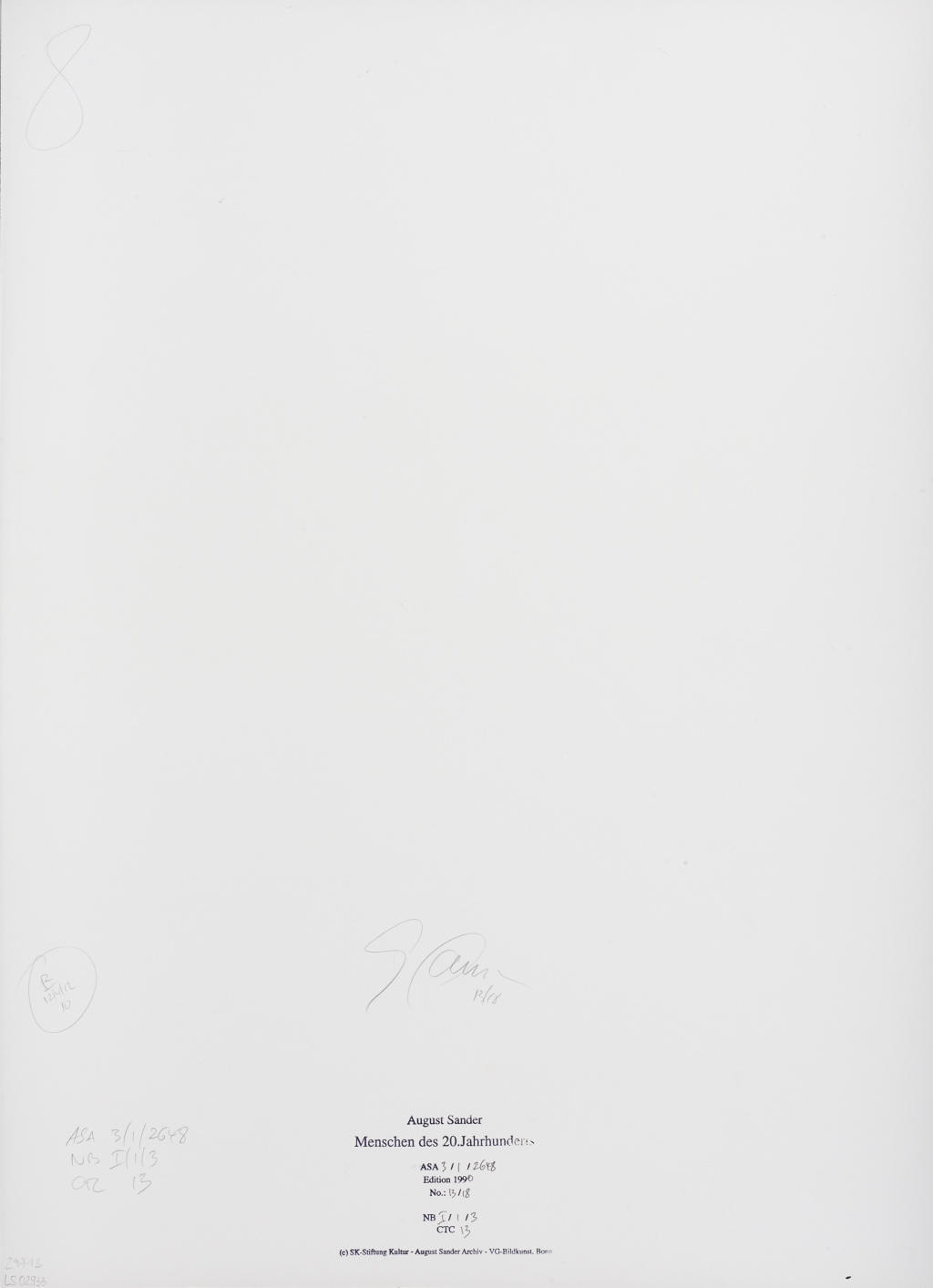 Gelatin silver print, printed 1990 by Gerd Sander 58,8 x 52,9 cm (23.1 x 20.8 in) With the “Aug. Sander Köln Lindenthal” blindstamp lower left, signed and dated by Gerd Sander in pencil on the reverse, stamped “August Sander Menschen des 20. Jahrhunderts [..]” with handwritten captions on the reverse, edition no. 13/18 LITERATURE August Sander, Antlitz der Zeit, Munich 1929, pl. 6; Gunther Sander (ed.), August Sander. Menschen des 20. Jahrhunderts, Munich 1980, p. 13.