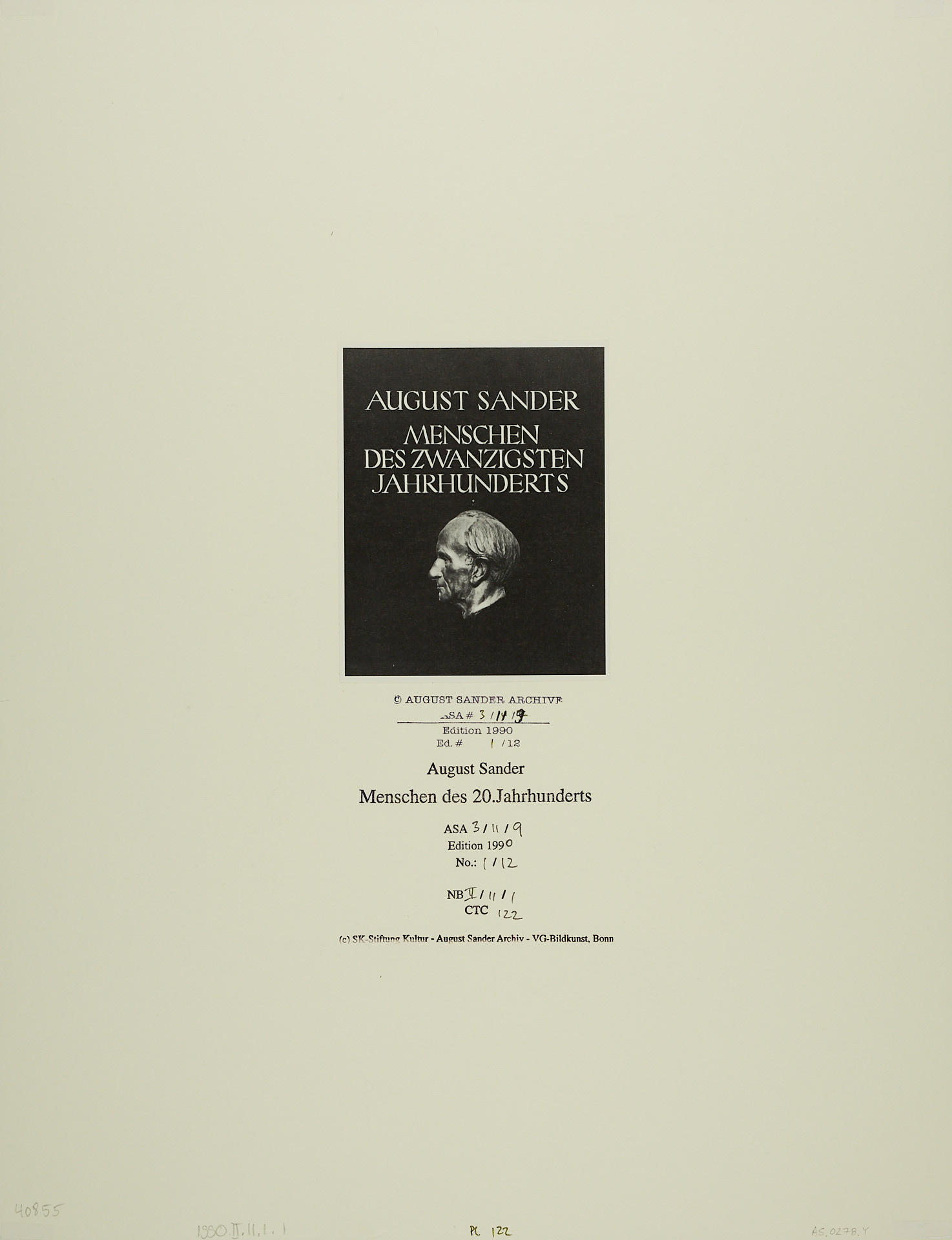 Gelatin silver print, printed in 1990 by Gerd Sander 25,7 x 18,9 cm Photographer's blindstamp in the image lower left, photographer's archive edition stamp with handwritten edition. no. on the reverse, edition no. 1/12, photographer's "Menschen des 20. Jahrhunderts" stamp on the reverse LITERATURE Susanne Lange (ed.), August Sander. Menschen des 20. Jahrhunderts, Munich 2002, VOL II / The Skilled Tradesman, p. 111.