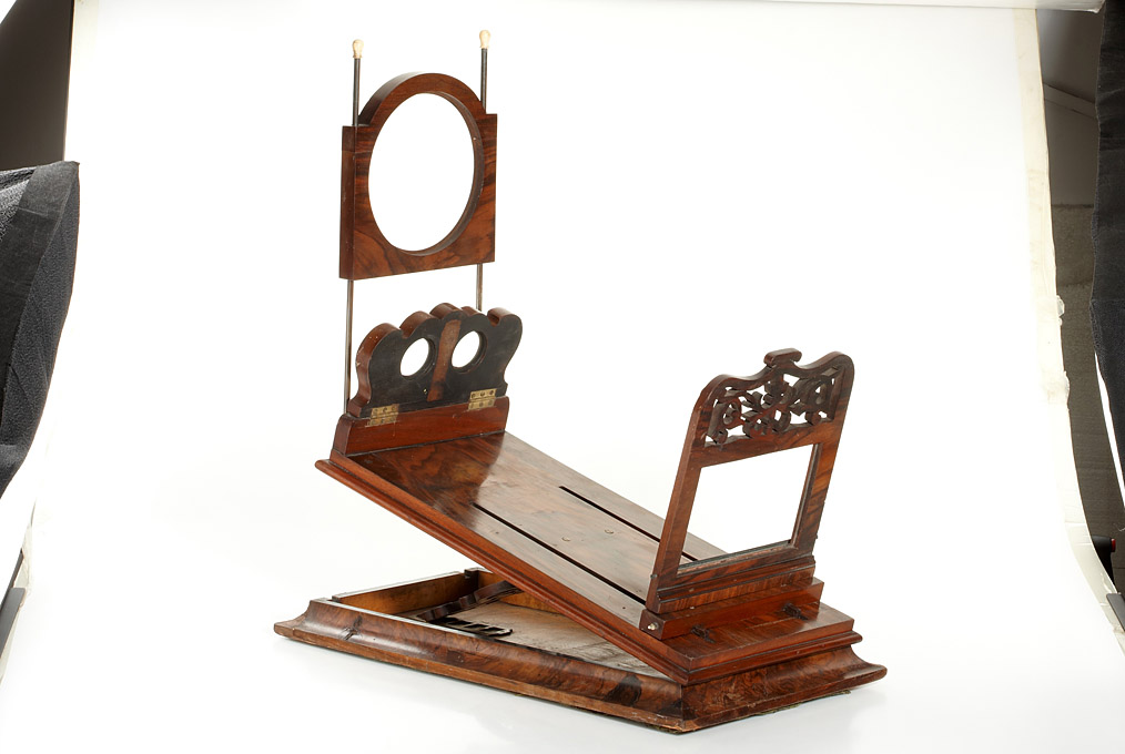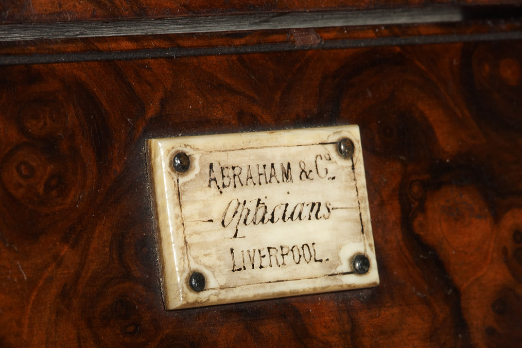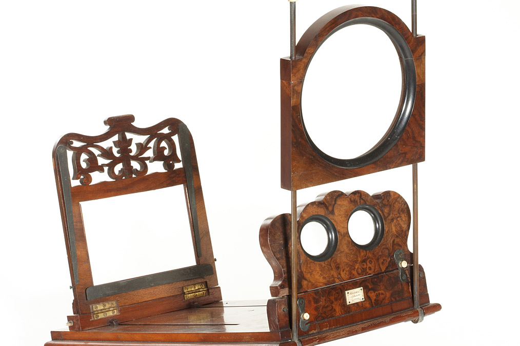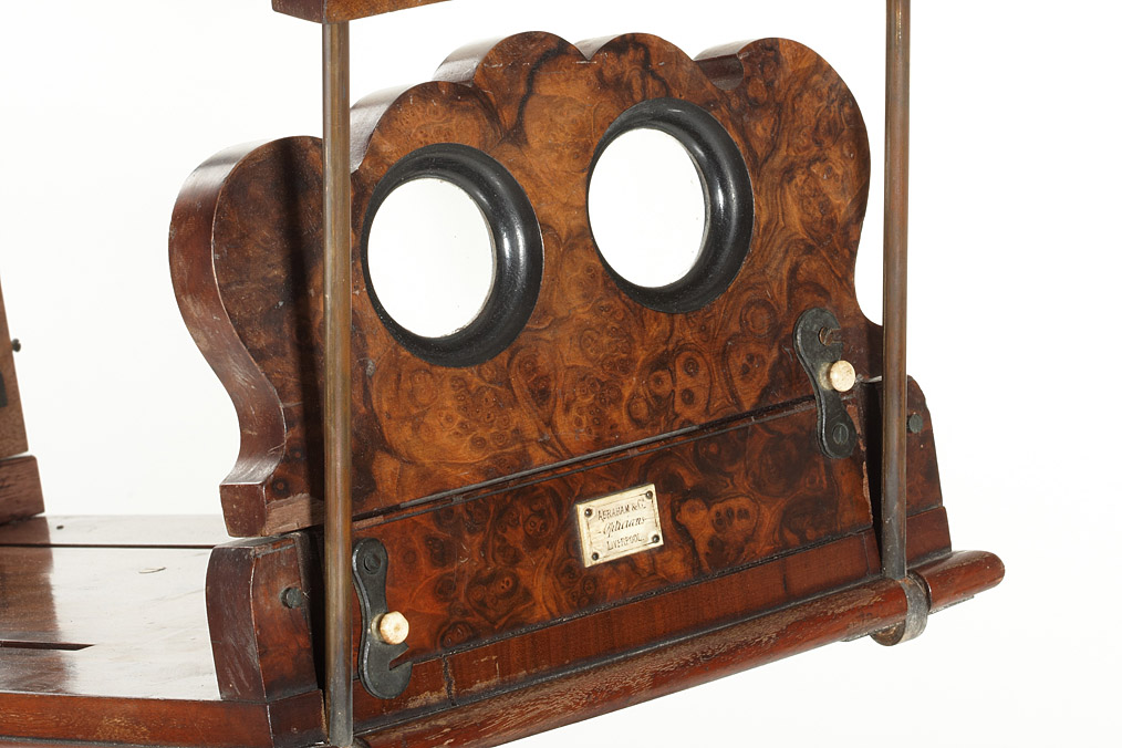 large British table stereo Graphoscope with fine root wood veneer finish, collapsible wooden construction folds to 59x31x28cm, the image holder is mounted on a slider and is ornamented with carving on the top, the round viewing glass is missing, dealer's plaque 'Abraham & Co. Opticians Liverpool'