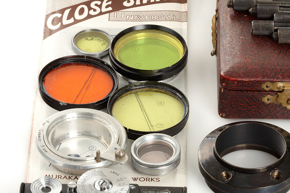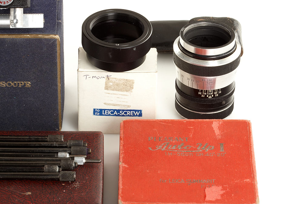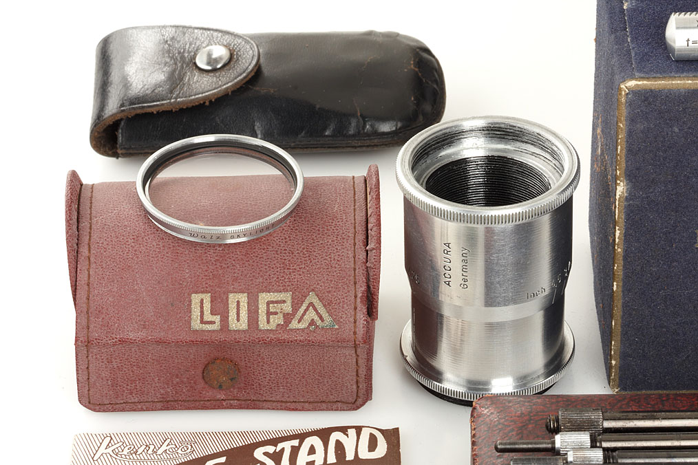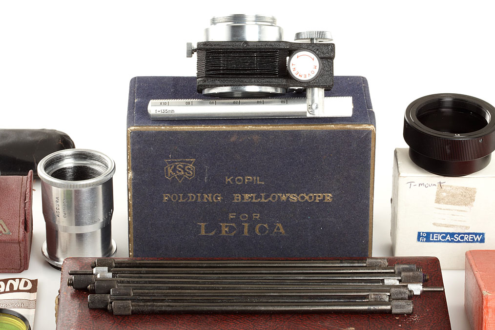 big lot of accessories made by other companies for Leica including: Kopil folding bellowscope in maker's box, Pleasant Auto-Up I close-up lens for Summarit 1.5/5cm, very rare Kenko close-up stand (similar to BEHOO) complete in maker's box, Accura universal focusing mount, Kilfitt focusing mount Ecude with 7mm extension ring, Jones base plate cover (to locate the tripod mount into the middle), TPI remoclip for all M models (except M5), three Saymon-Brown rangefinders (two with case), two Walz hoods for Summicron, Walz hood for Summar, four LIFA filters in case for Summitar, yellow filter and skylight filter for Elmar 3.5cm, Walz skylight filter for Summitar, focusing mount for Summar 5cm (similar to ZWTOO), T-mount adapter for M39 in maker's box (23)