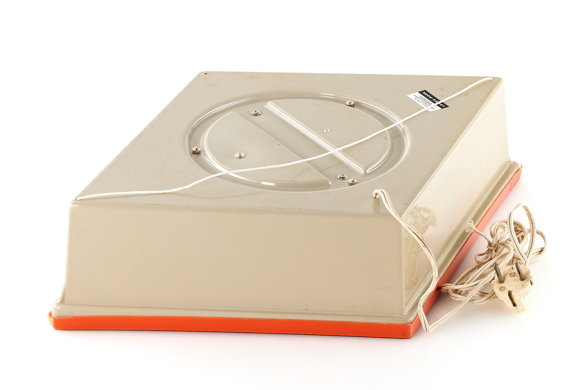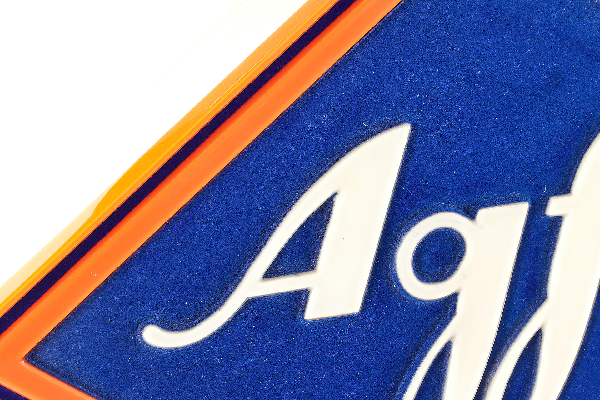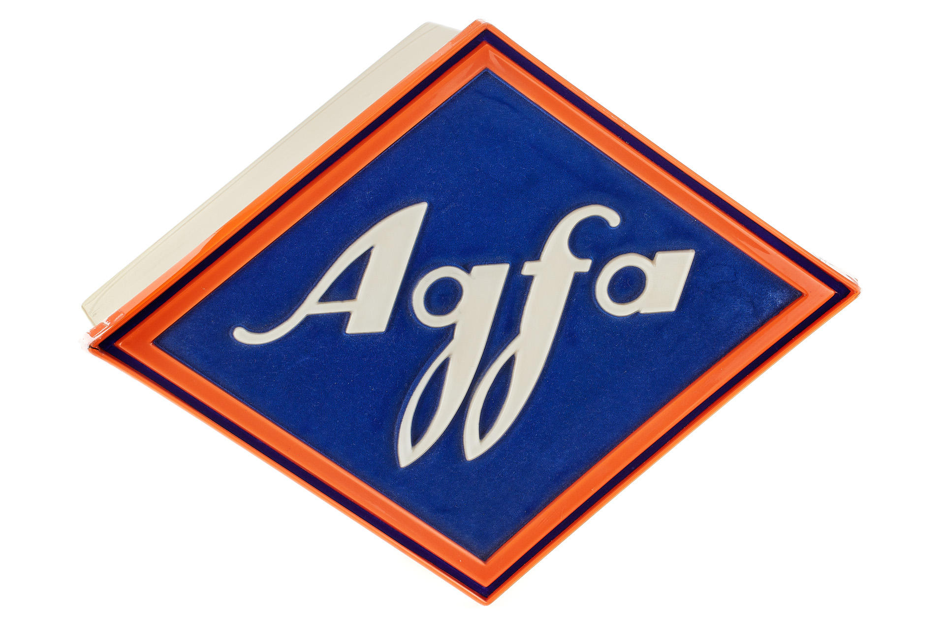 Beautiful advertising lamp with the iconic Agfa logo, in very good condition and working order, plastic and blue velvet 50 x 36 x 11cm, corners showing some repair