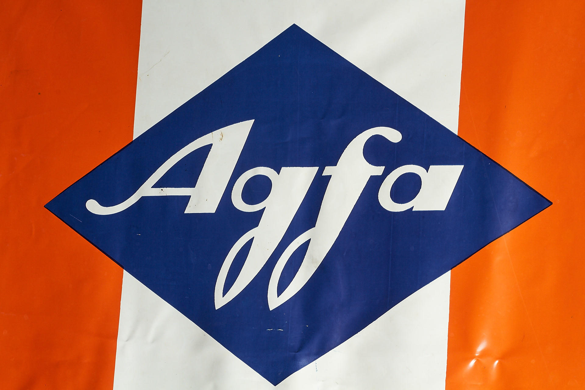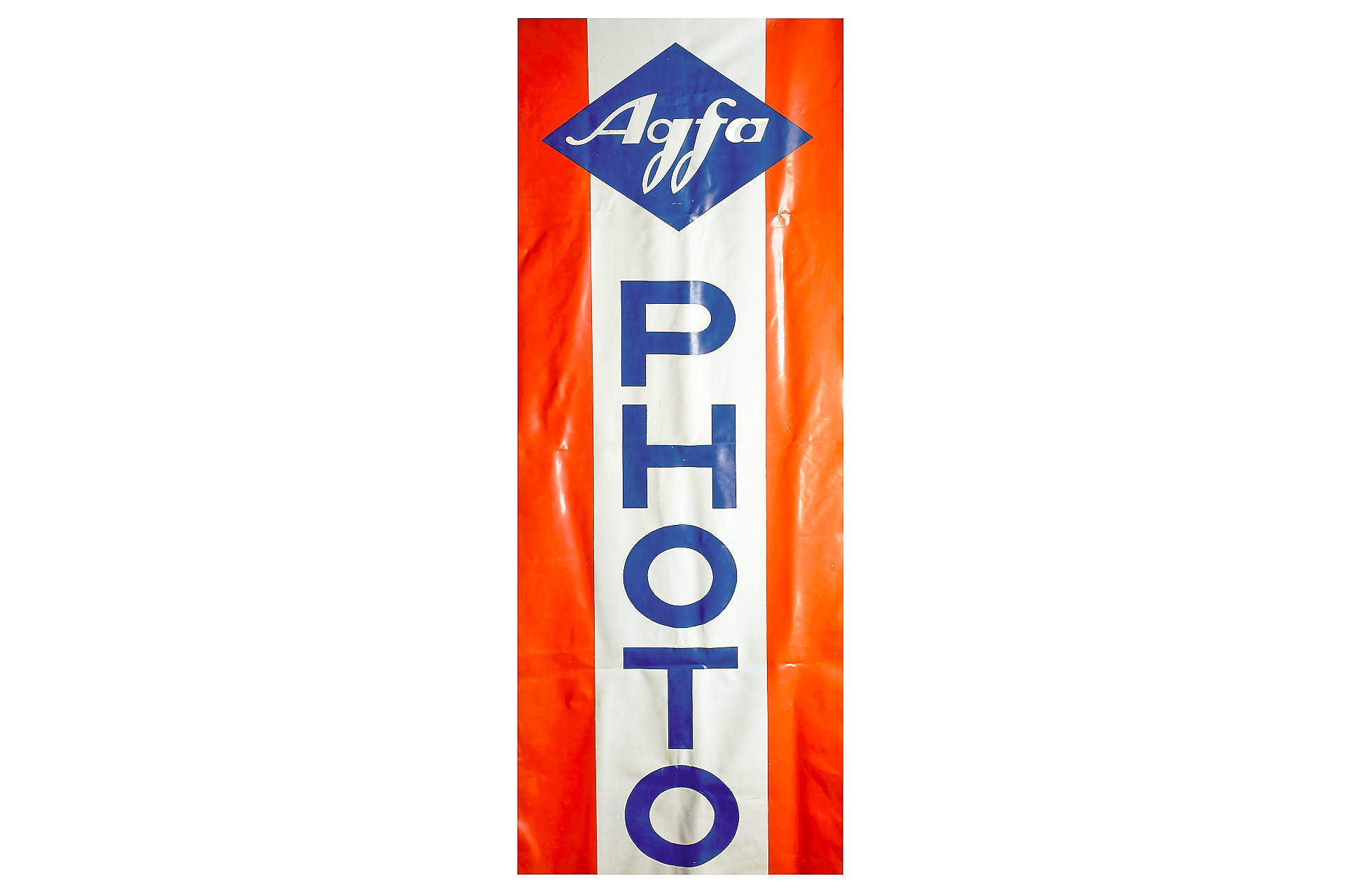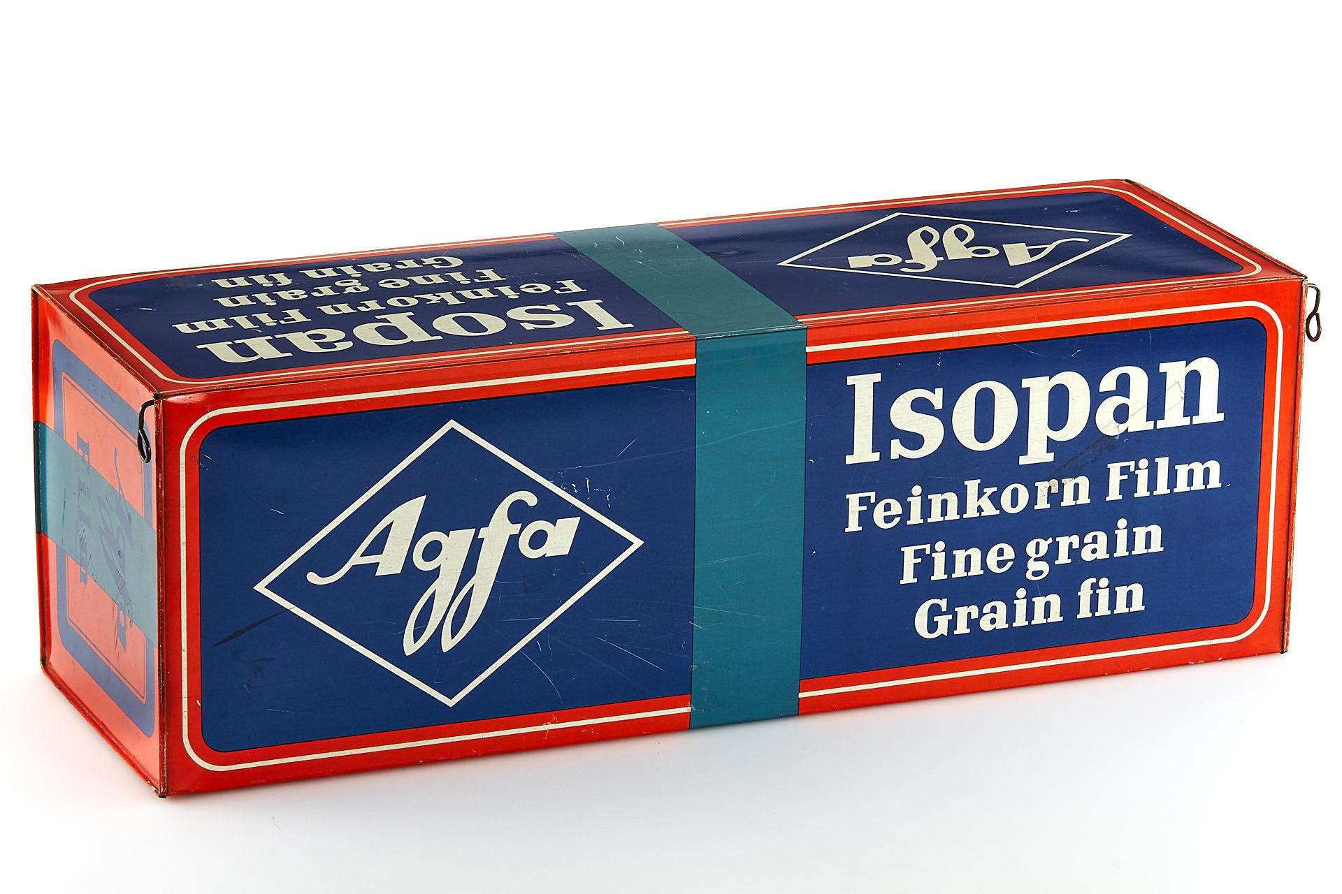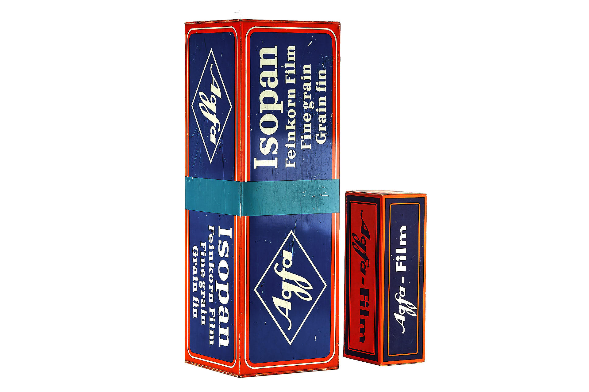 oversized Agfa Isopan metal film box (74cm long), with oversized cardboard Agfa Film box (36cm long) and uncommon large plastic Agfa flag (180cm long)