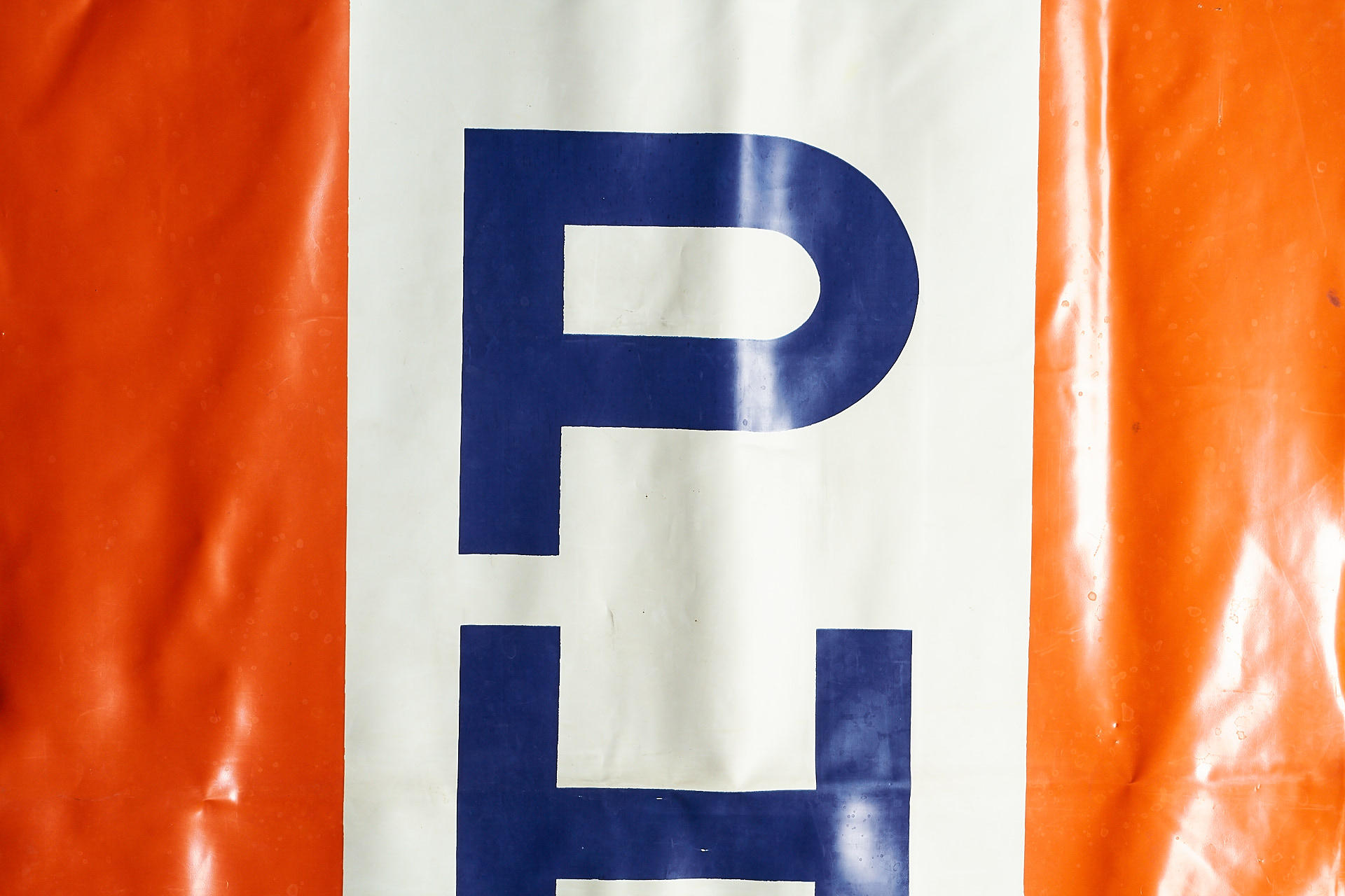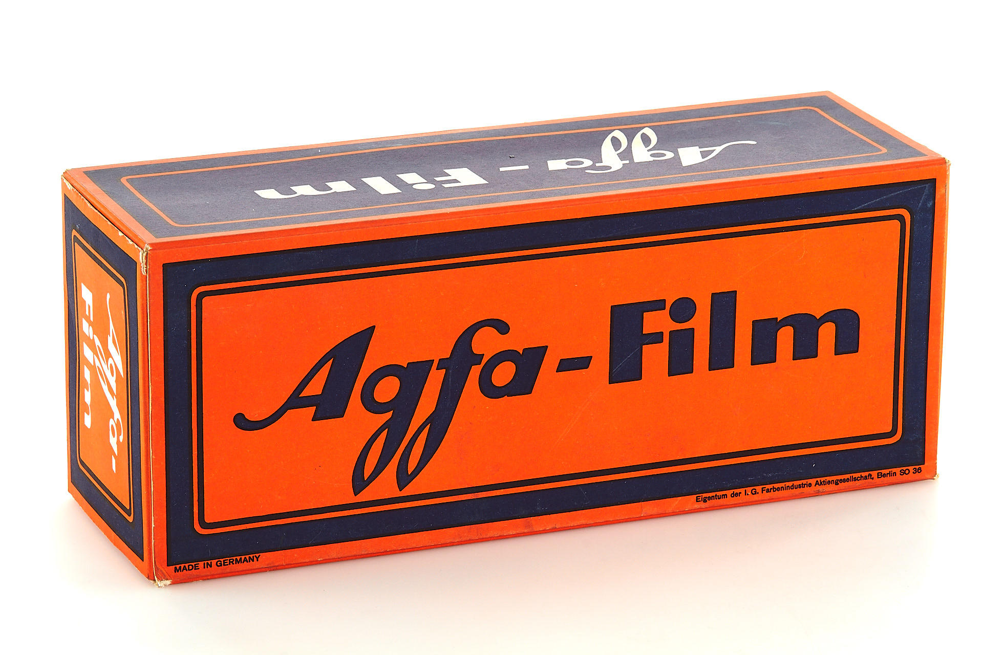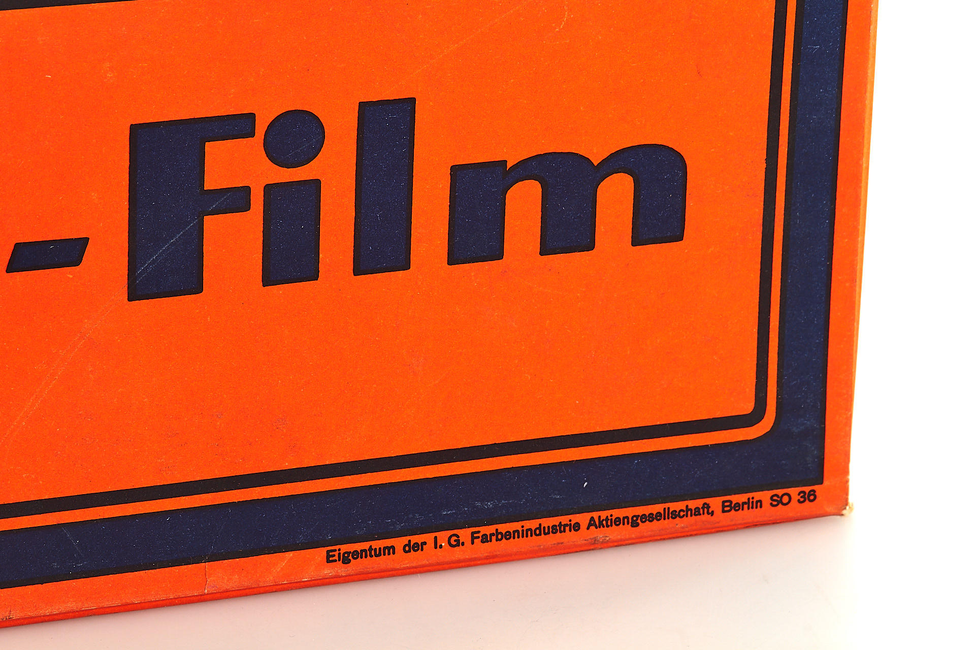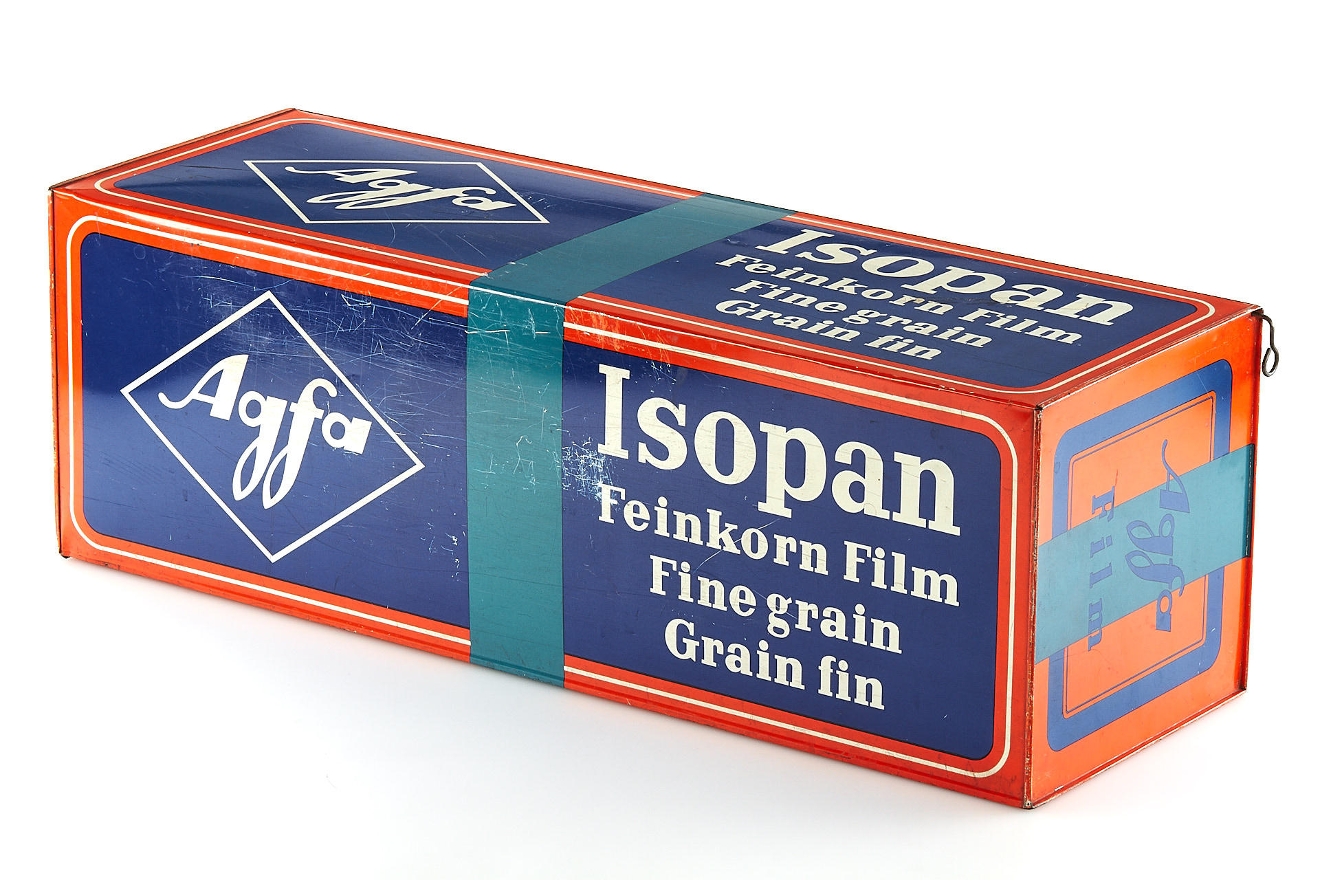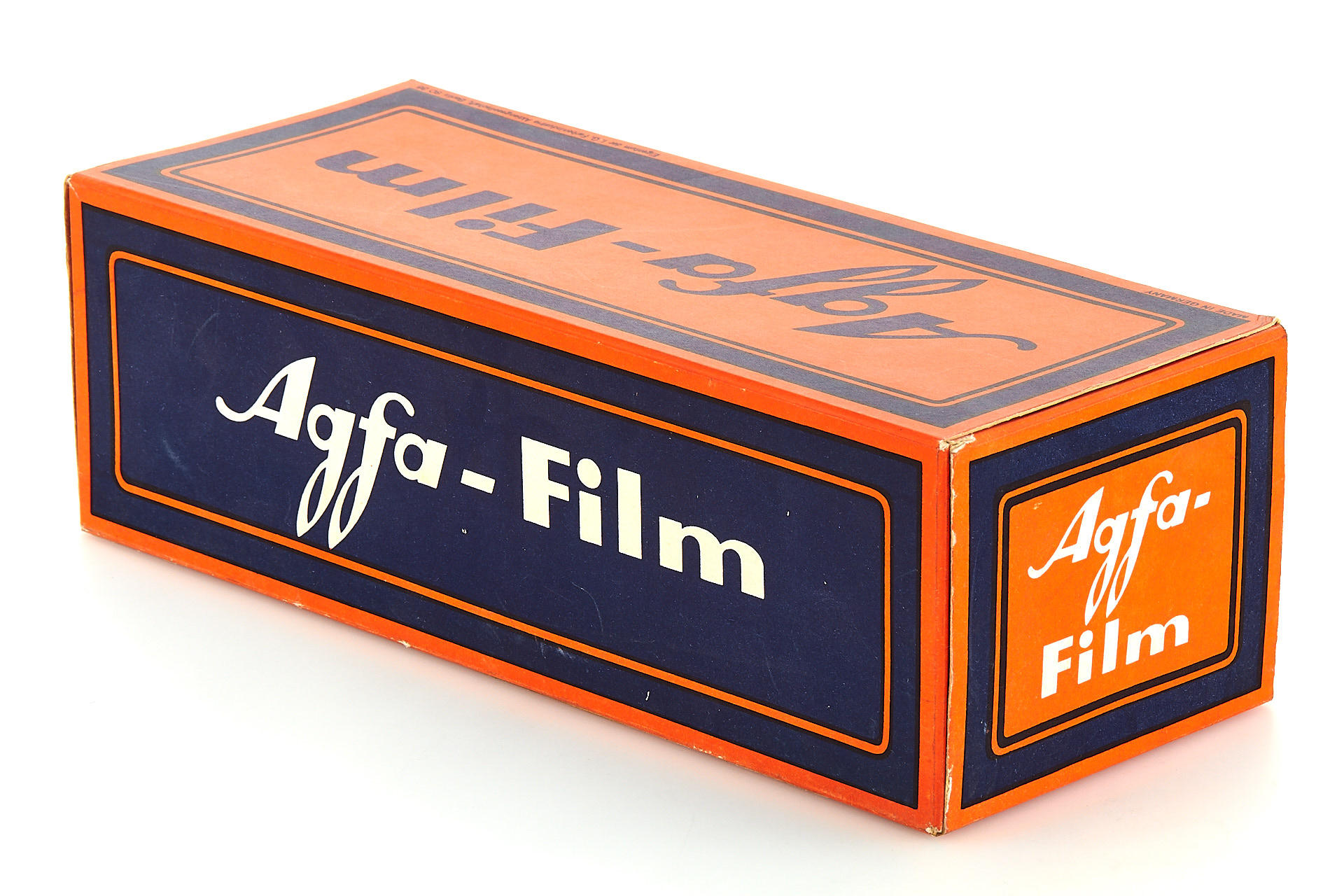 oversized Agfa Isopan metal film box (74cm long), with oversized cardboard Agfa Film box (36cm long) and uncommon large plastic Agfa flag (180cm long)