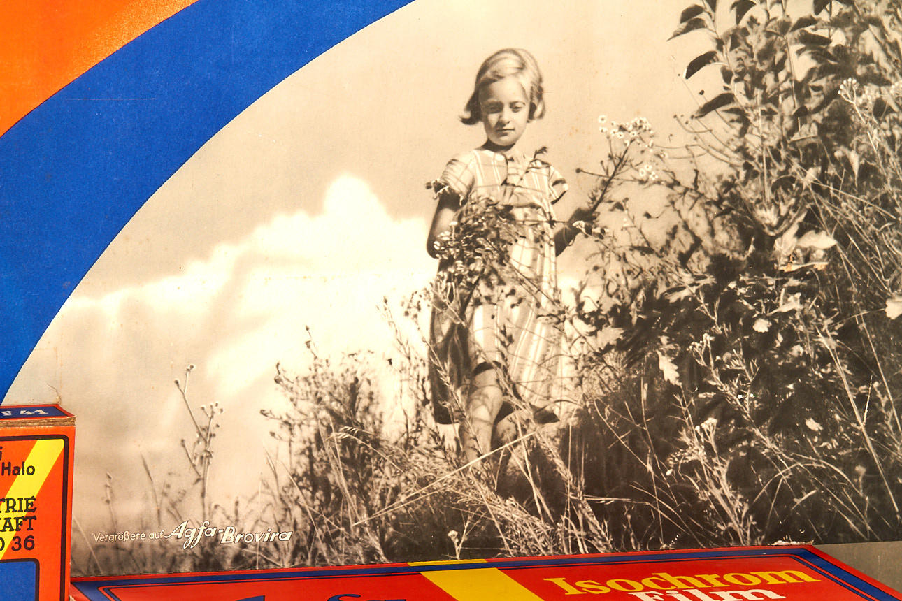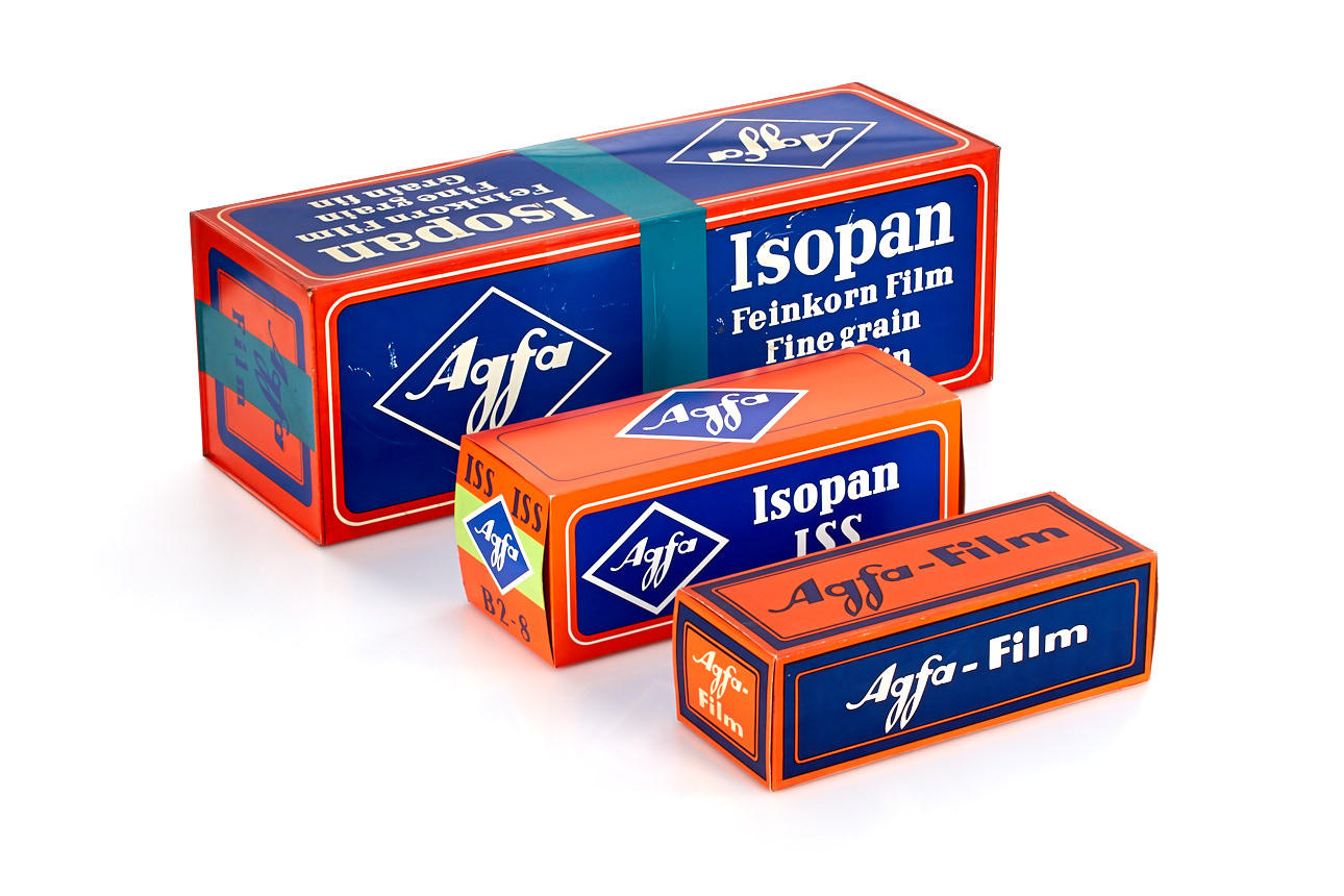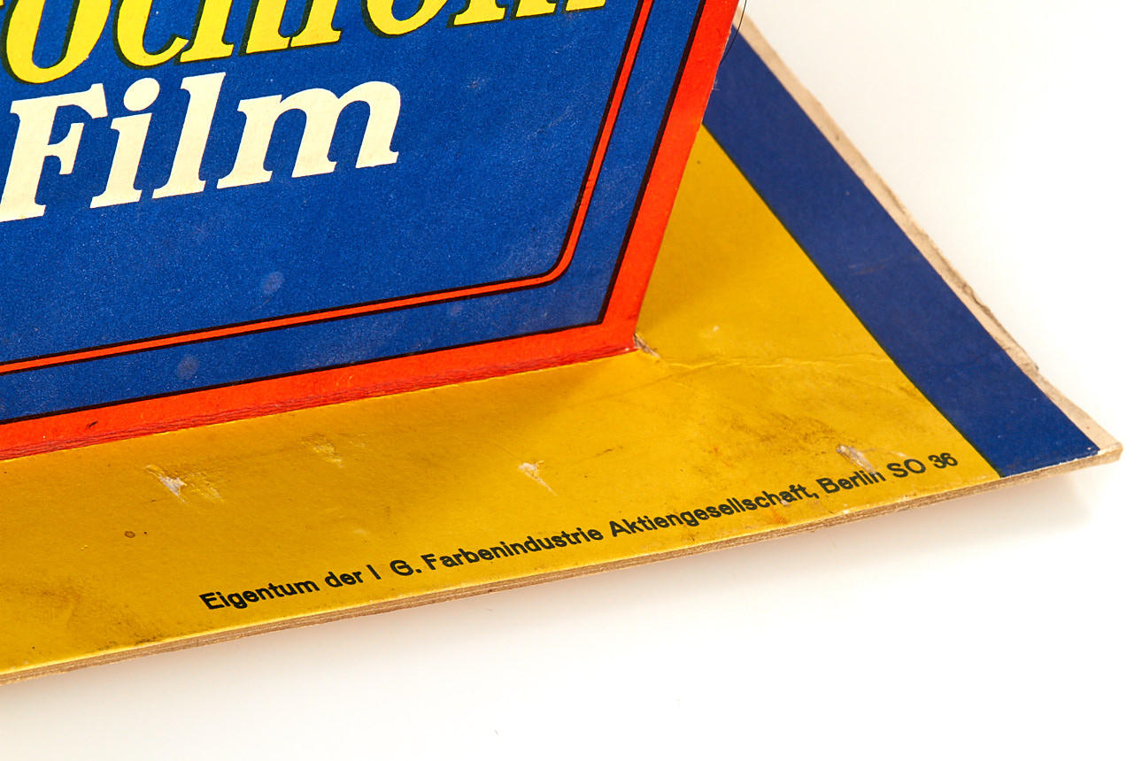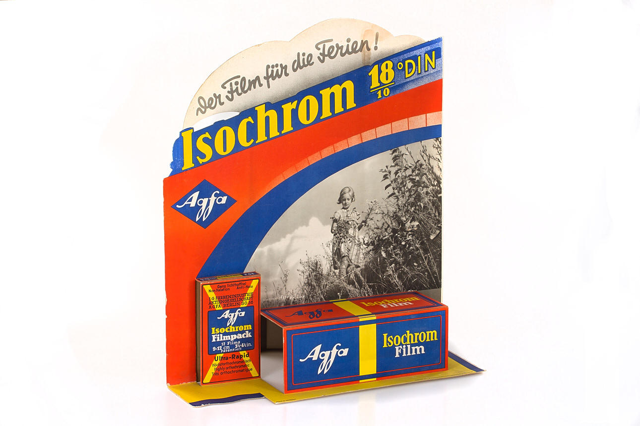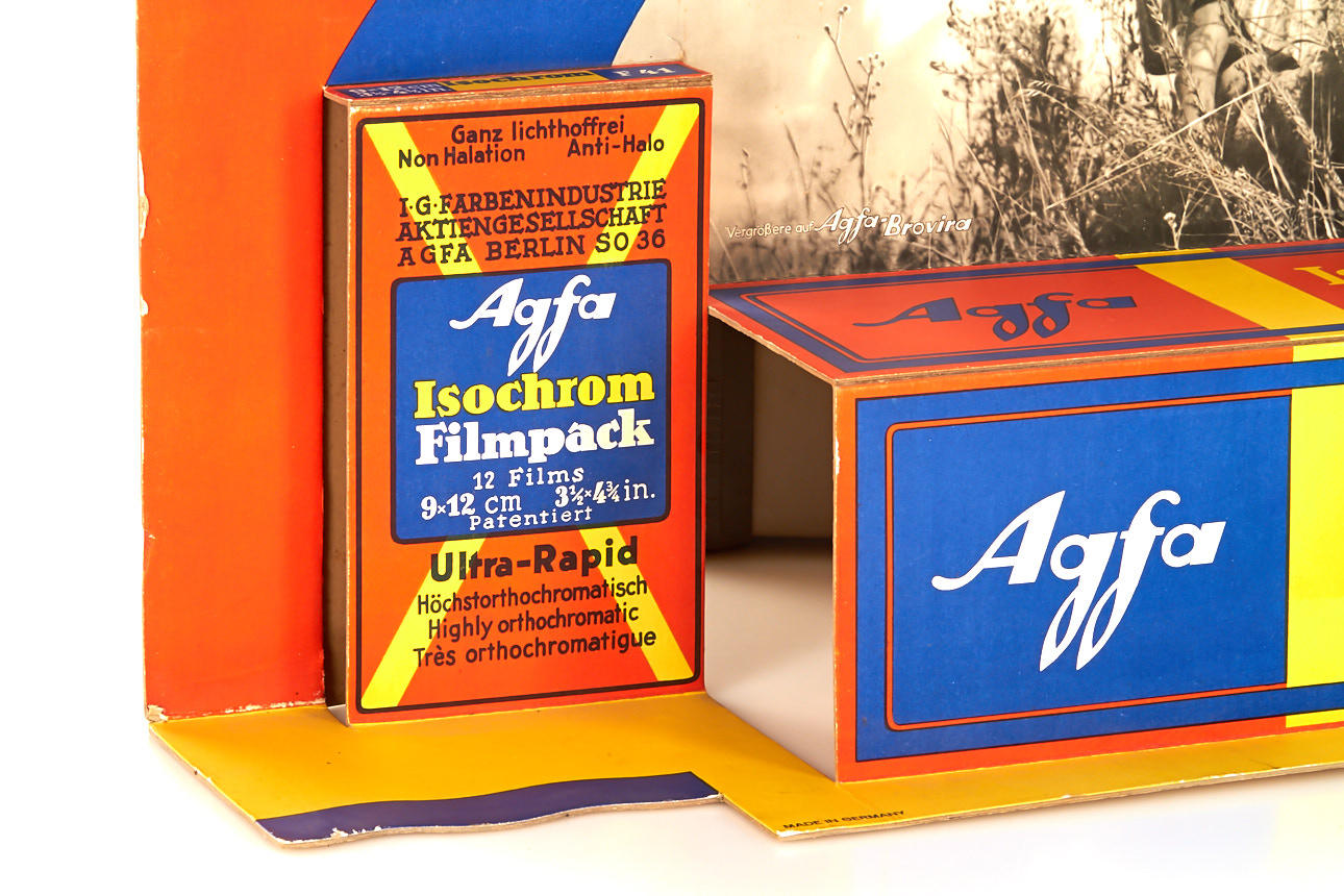 (1) large 65x73cm Agfa Isochrom shop-window cardboard display sign, (2) large 73cm long metal film box, (3+4) two cardboard boxes 40cm and 36cm long, all in excellent condition
