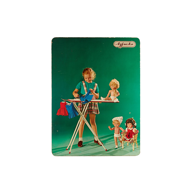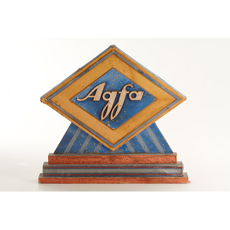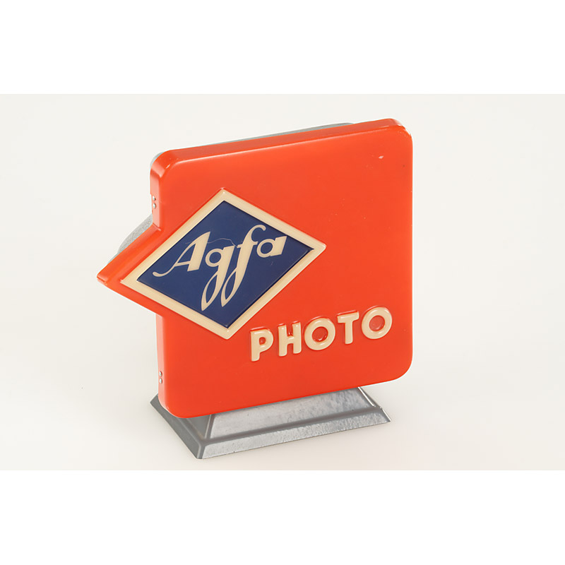 (1) large German Agfacolor display (c.59x79cm) in green colour, (2) cardboard and wood Agfa display stand (old vintage, c.50x46cm), (3) electronic Agfa PHOTO display (16.5x16.5cm) (3)