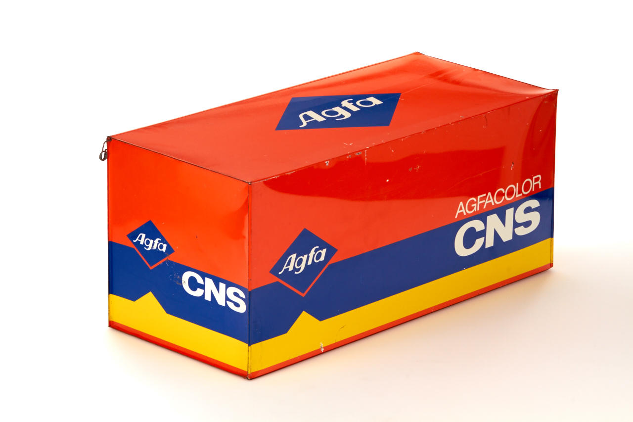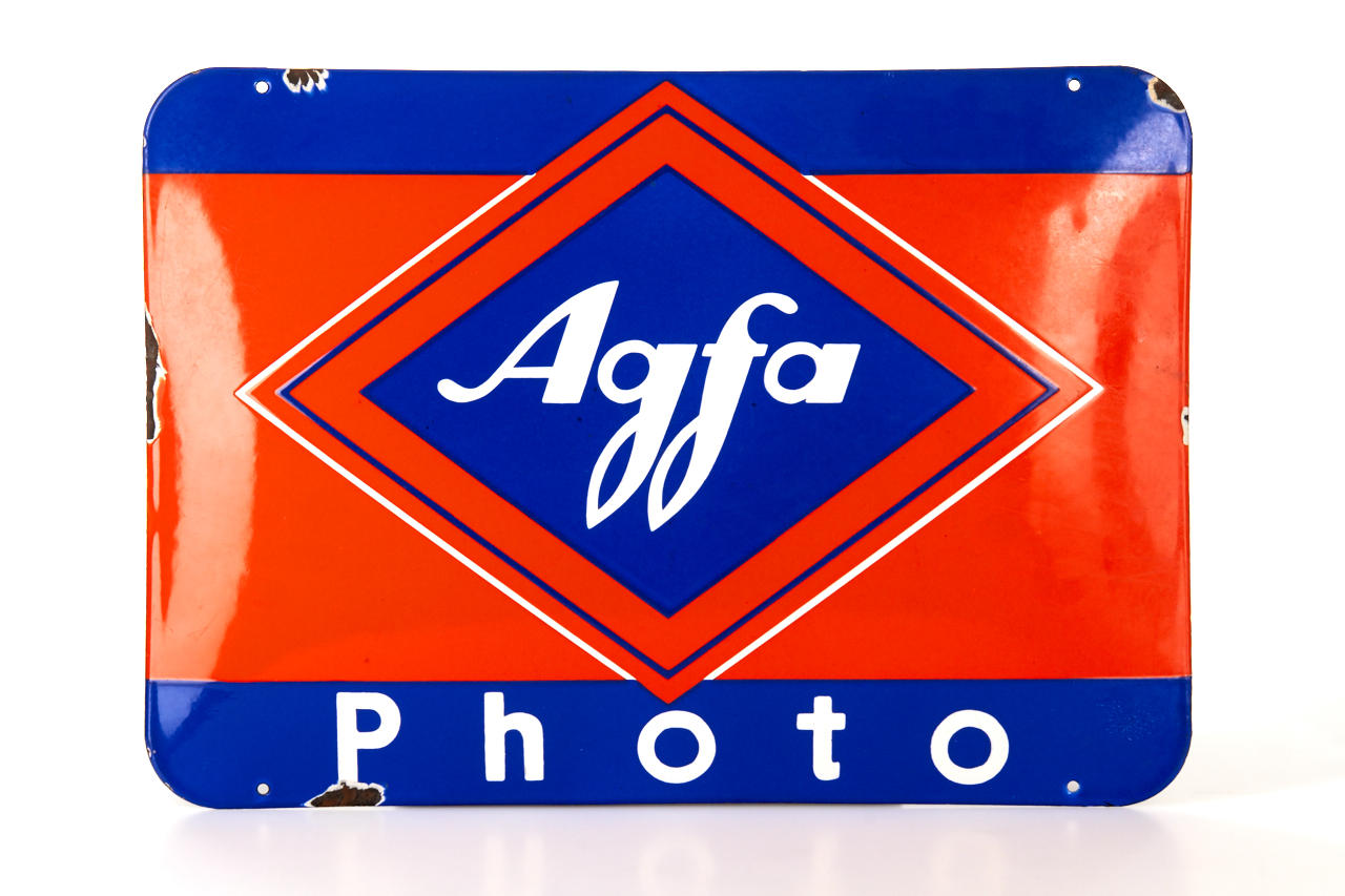 (1) Agfa Photo enamel sign 48x35cm, (2) Agfa CNS oversized film box, length 74cm