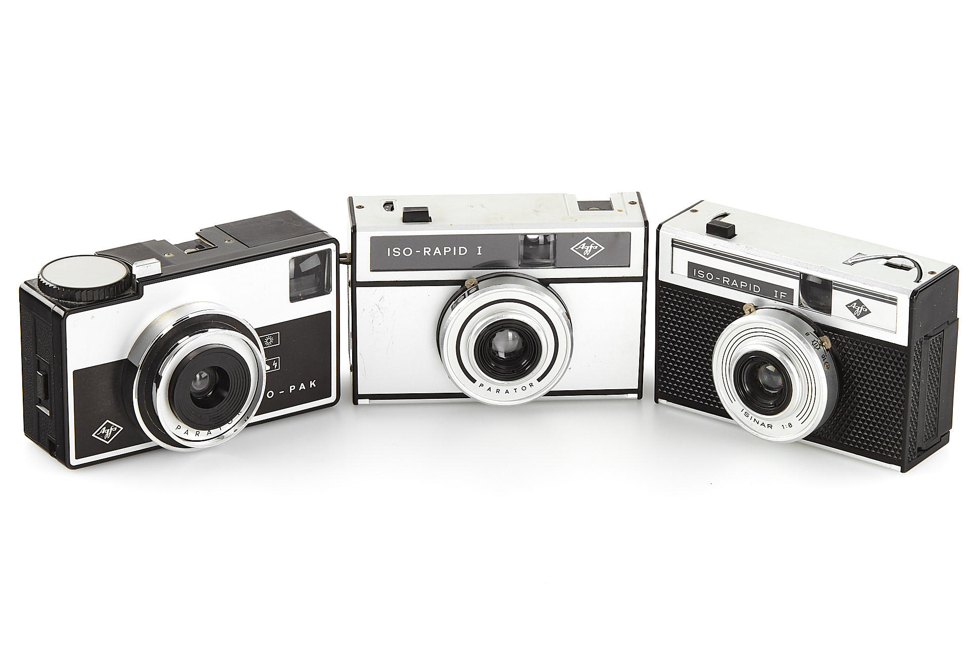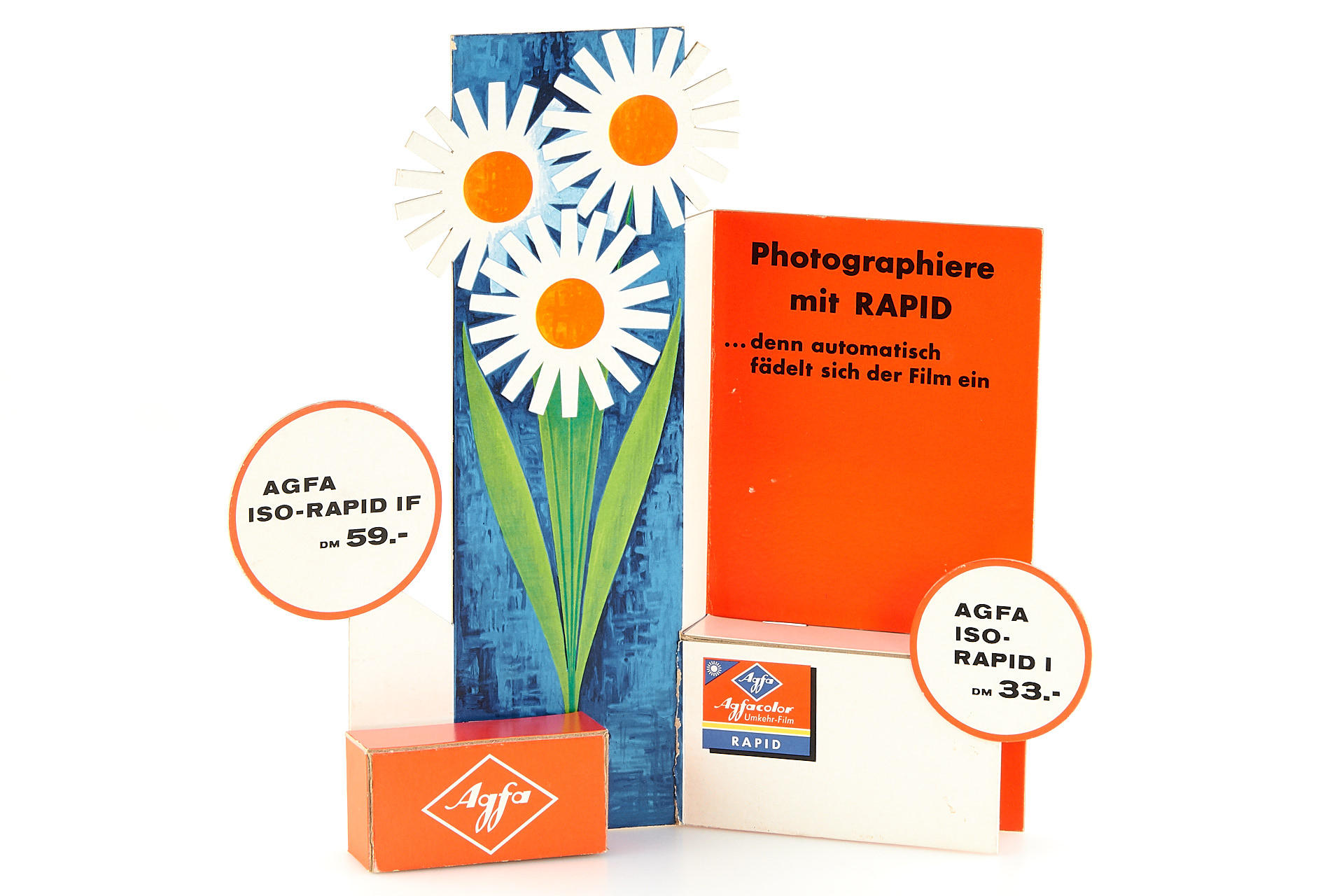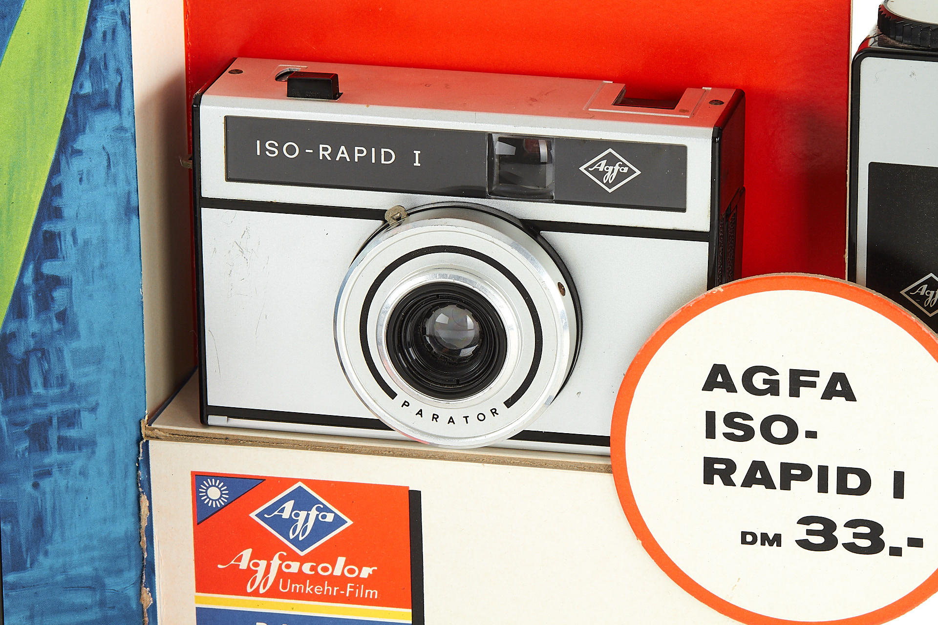 uncommon Agfa display stand, c.35cm high, 38cm wide, with three Agfa cameras: Iso-Rapid I, Iso-Rapid IF, Iso-Pak, everything in very good condition