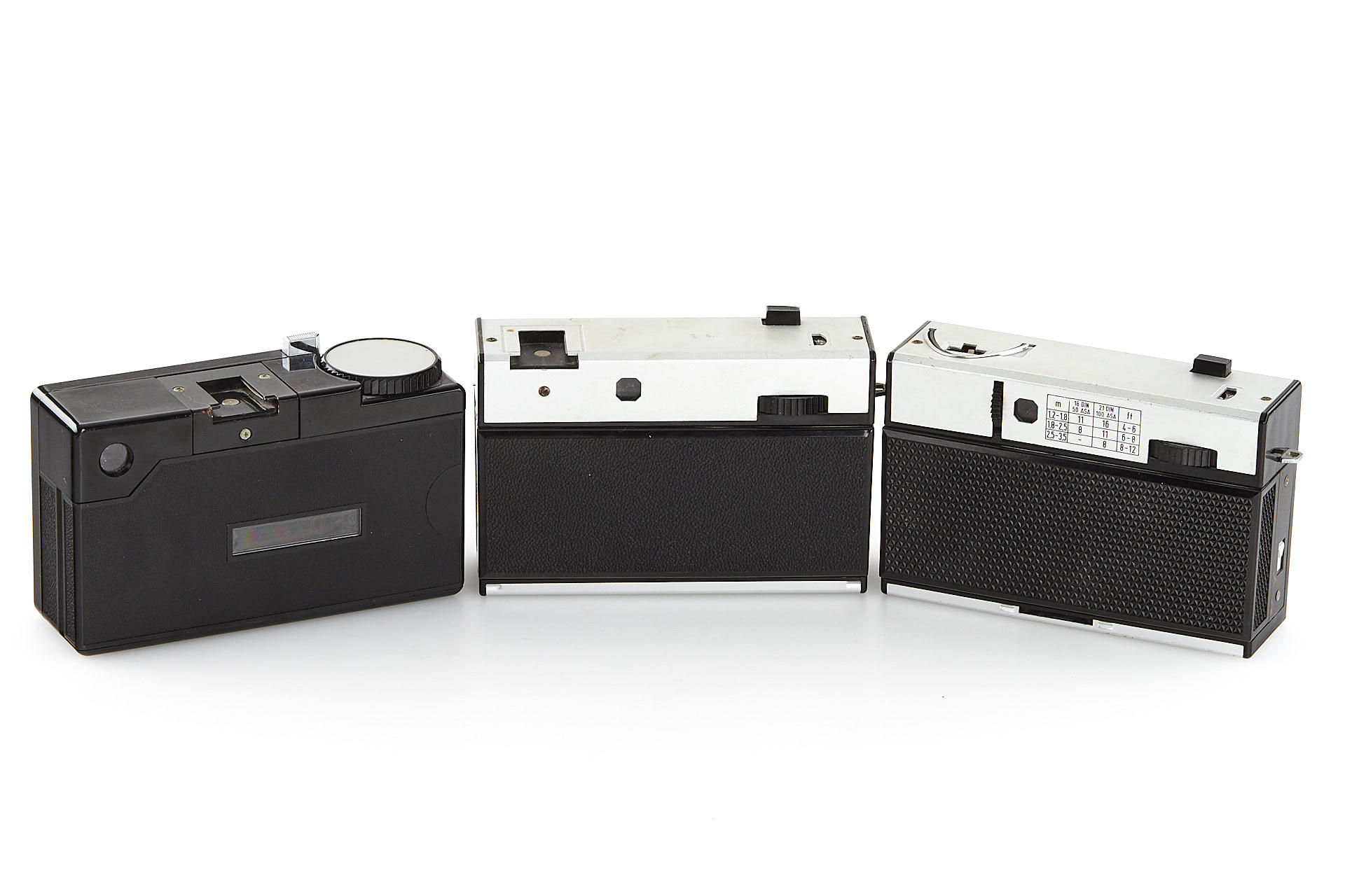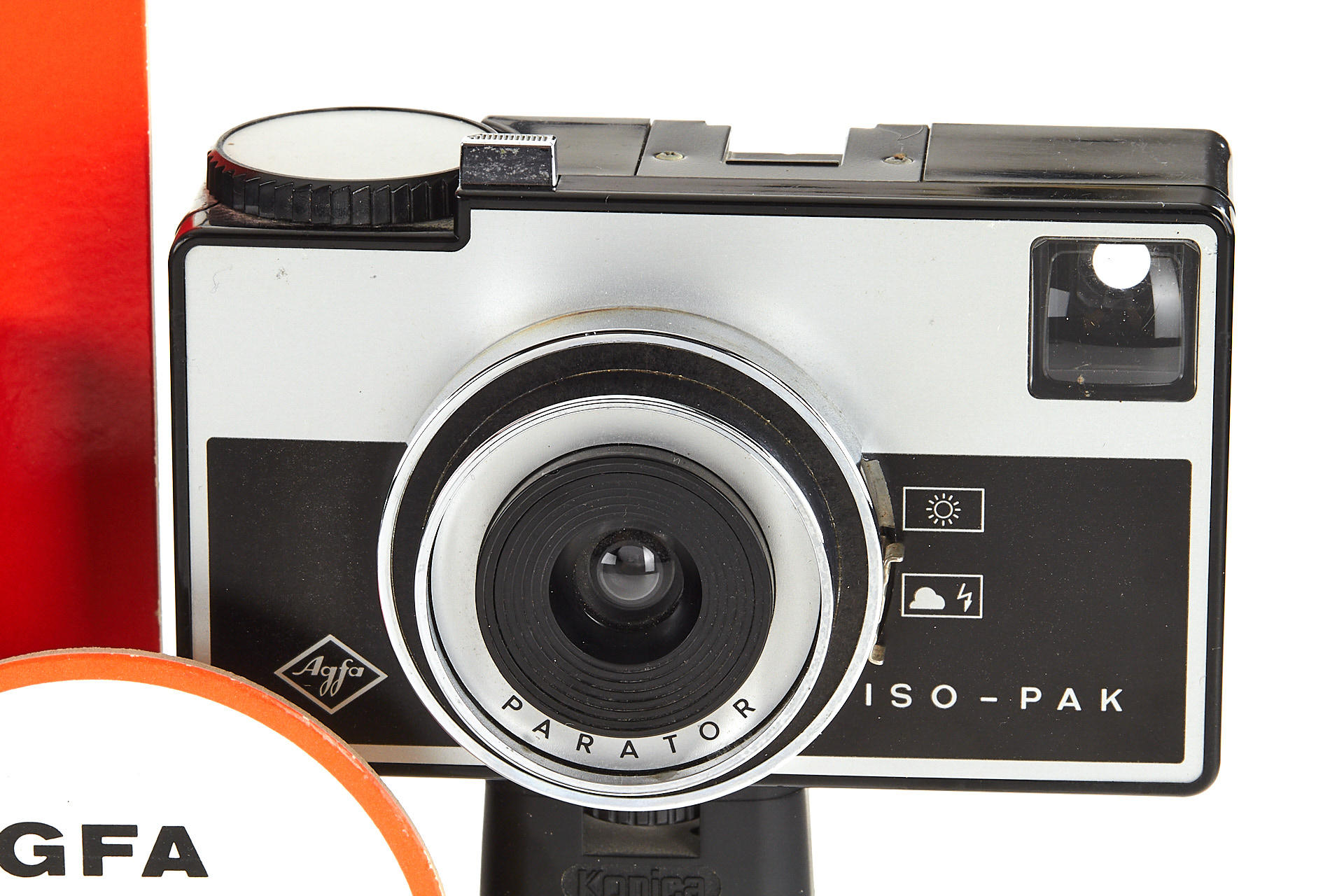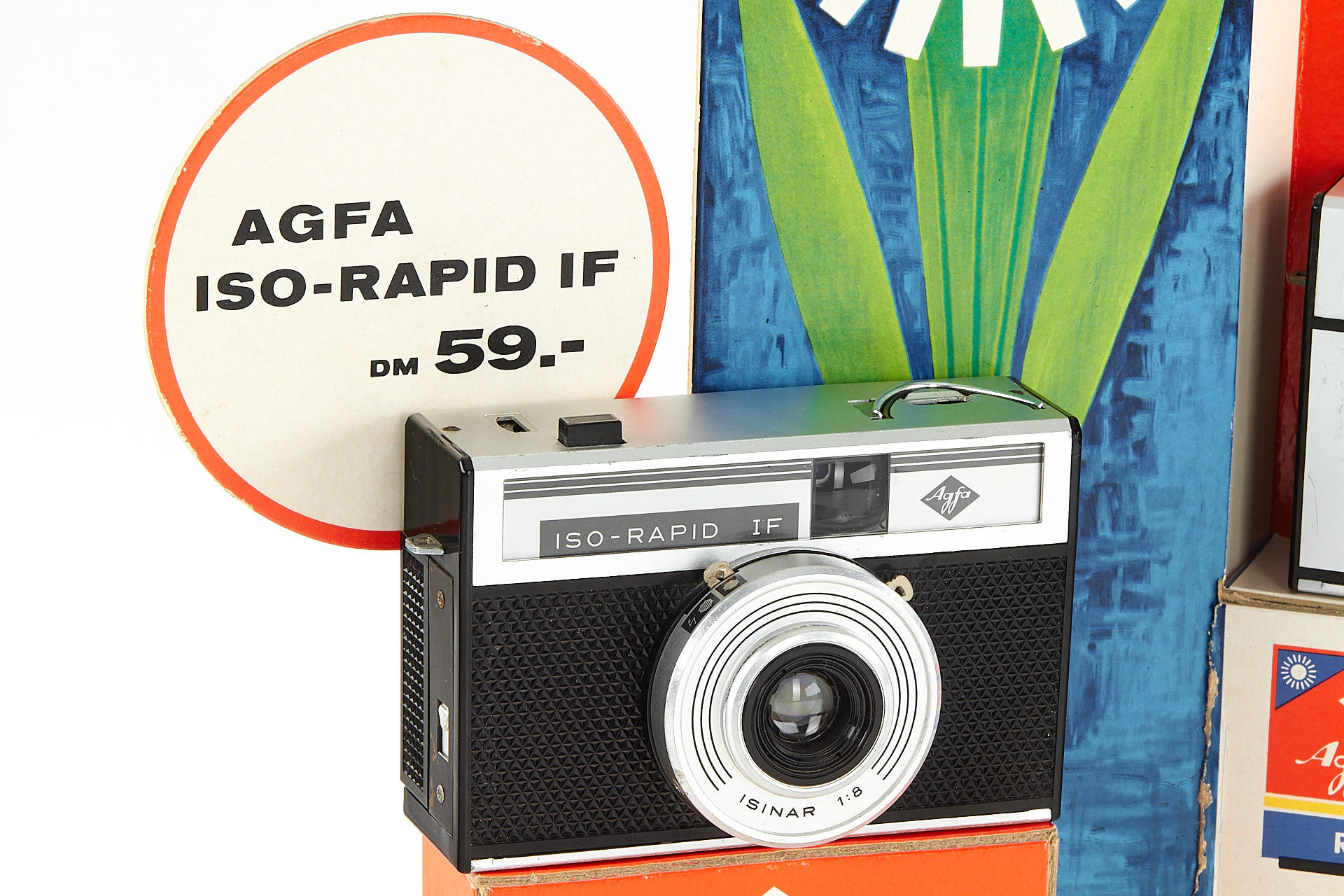 uncommon Agfa display stand, c.35cm high, 38cm wide, with three Agfa cameras: Iso-Rapid I, Iso-Rapid IF, Iso-Pak, everything in very good condition