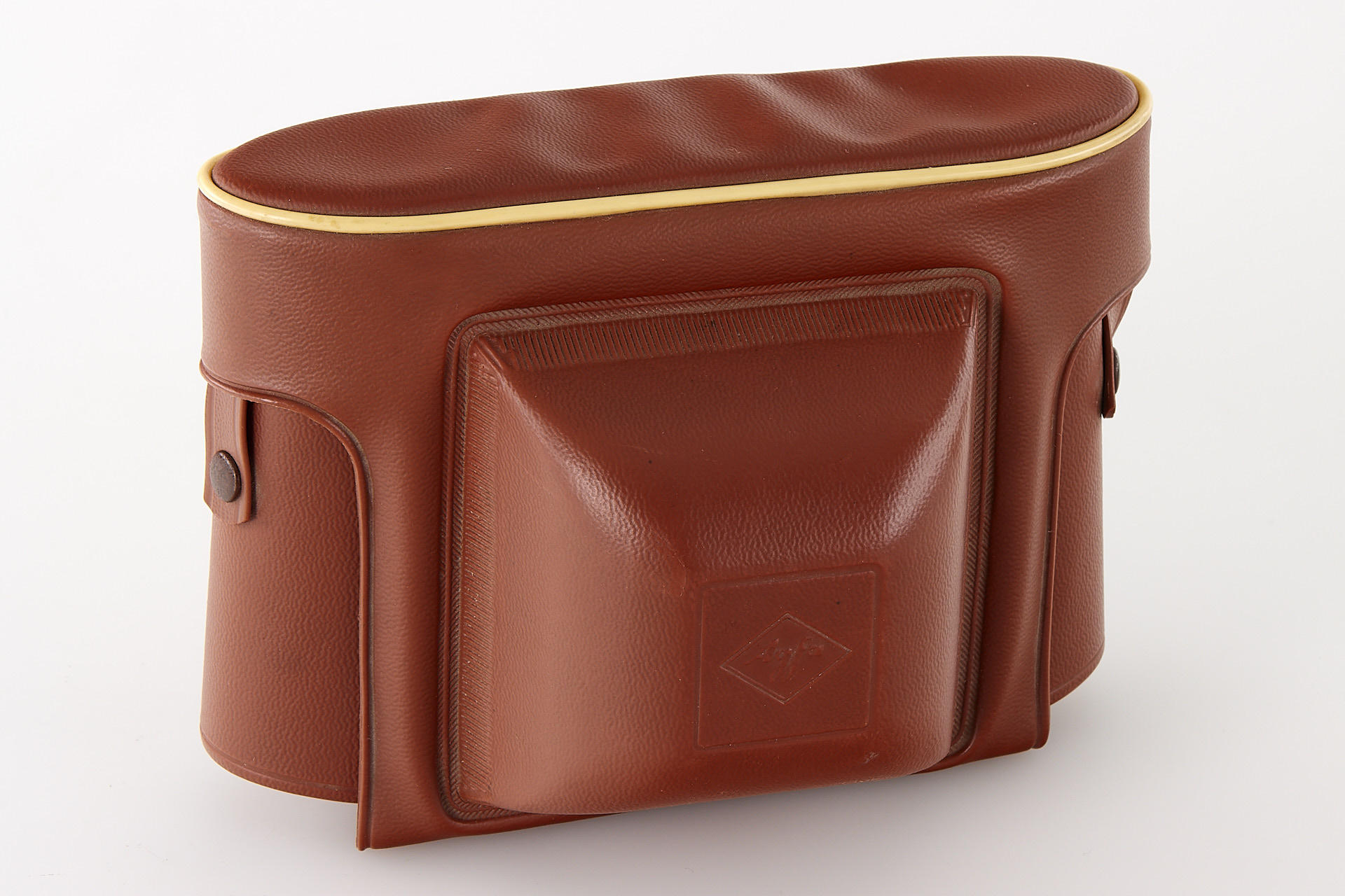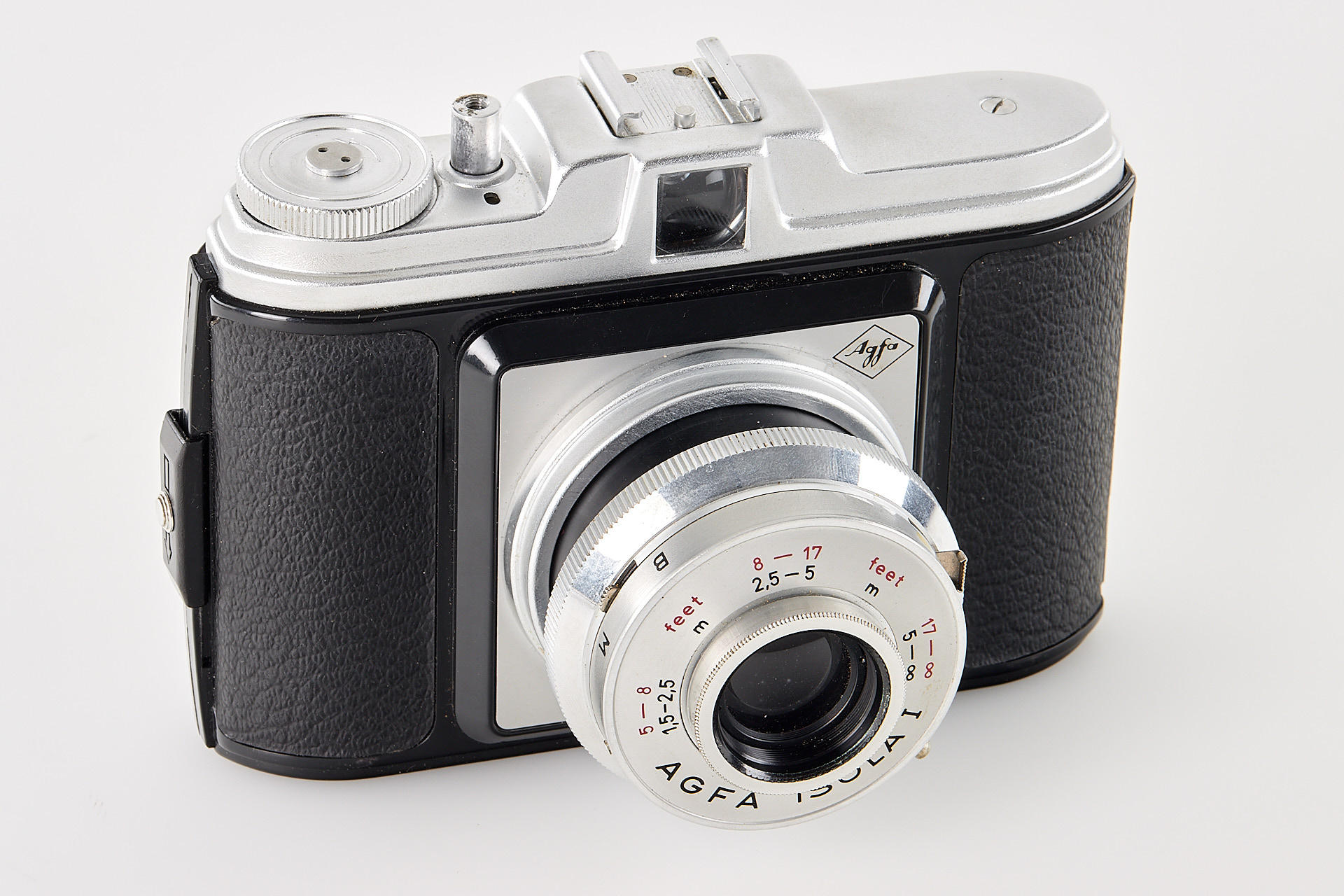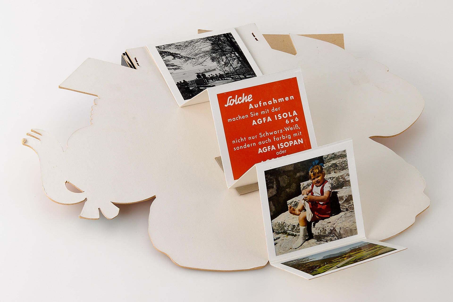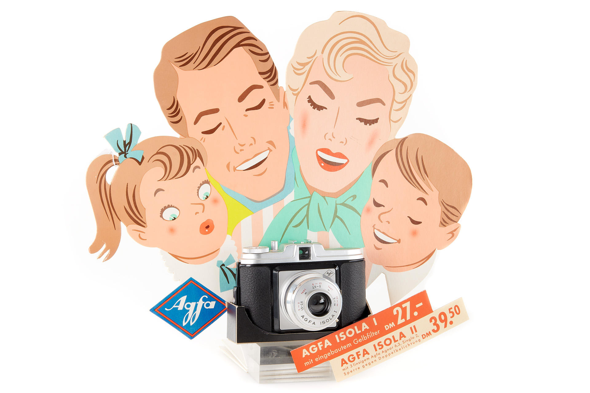 Beautiful German advertising stand for Agfa Isola I in mint condition, printed cardboard c.80cm unfold, with Isola I camera, mint and in working order, with ever ready case