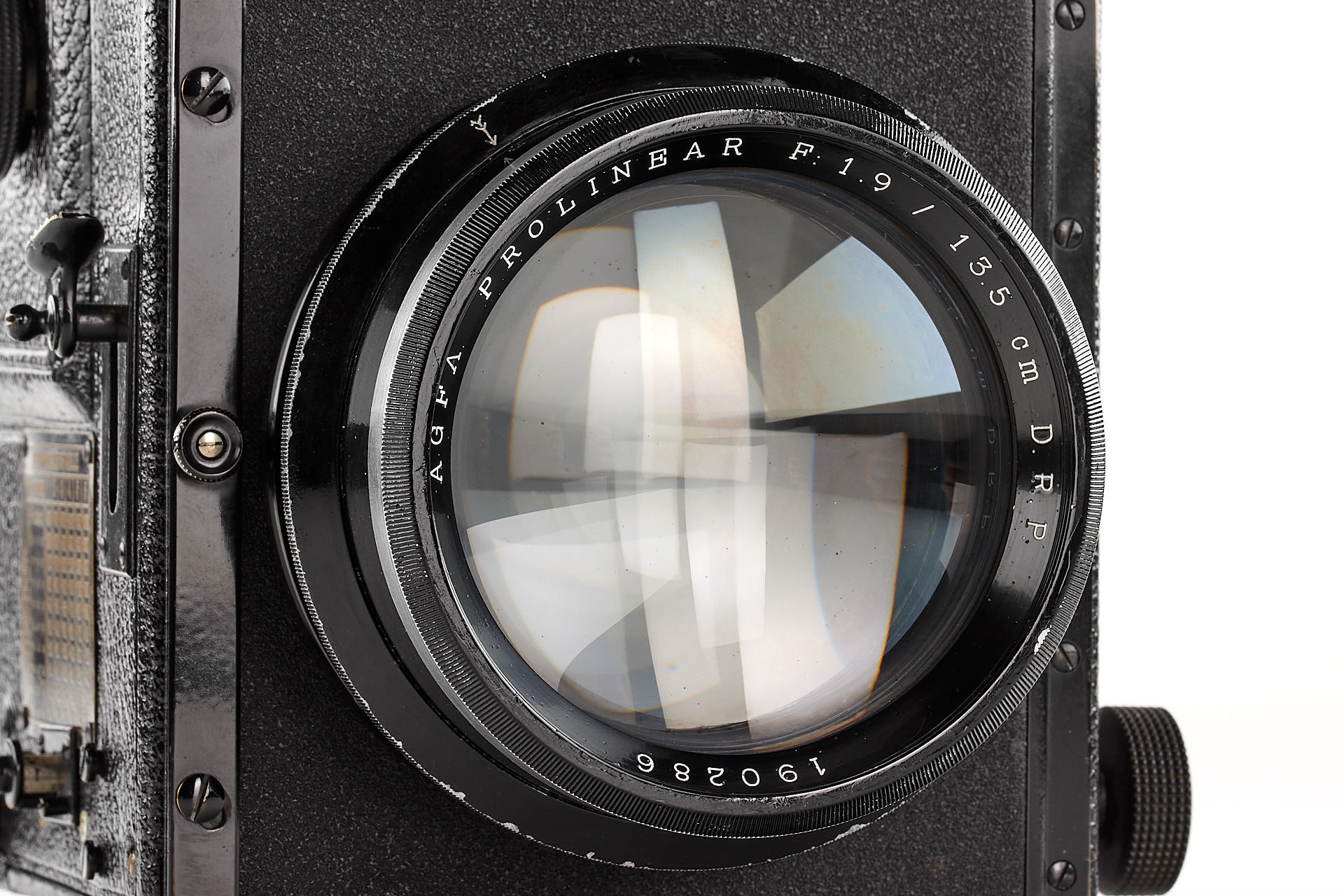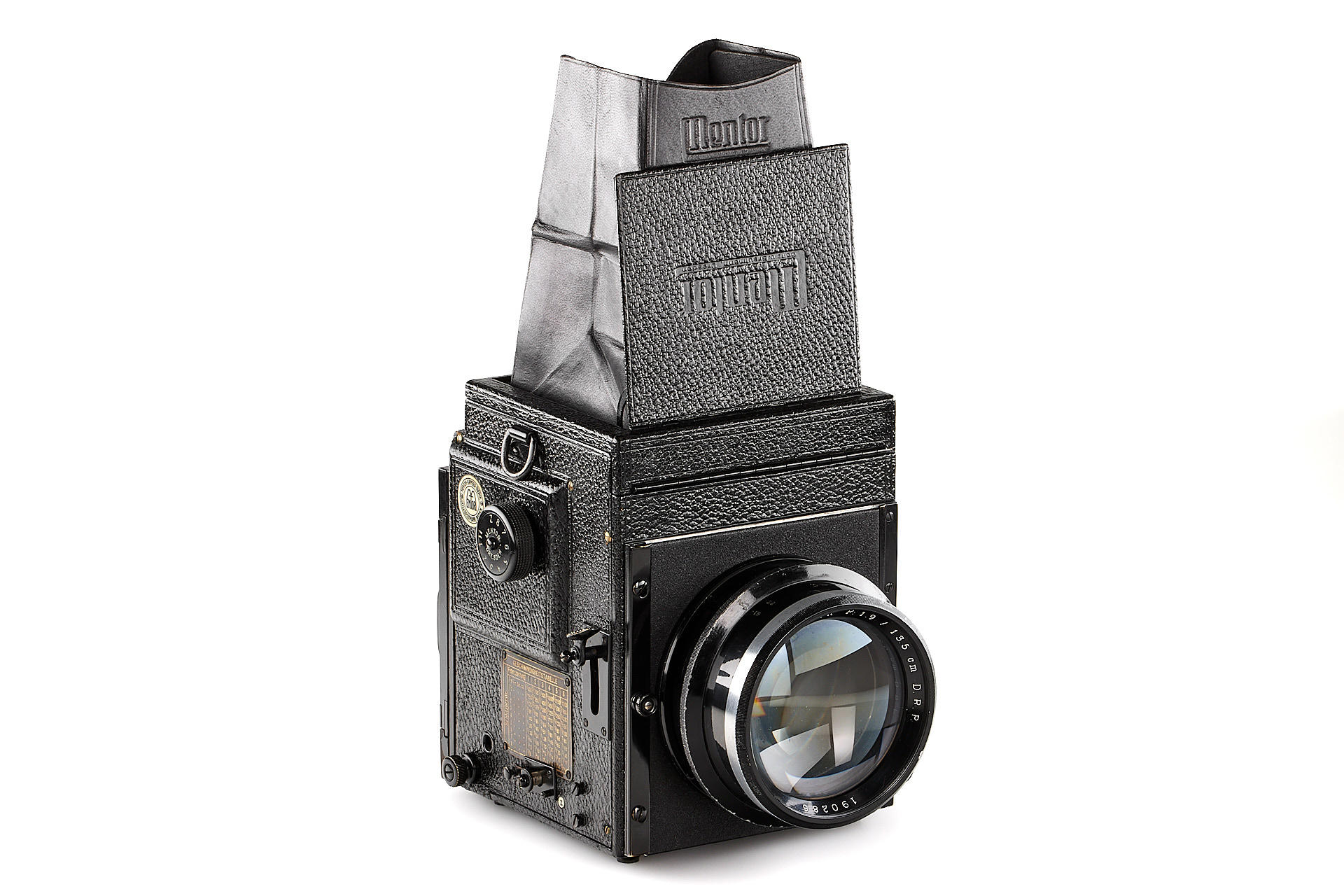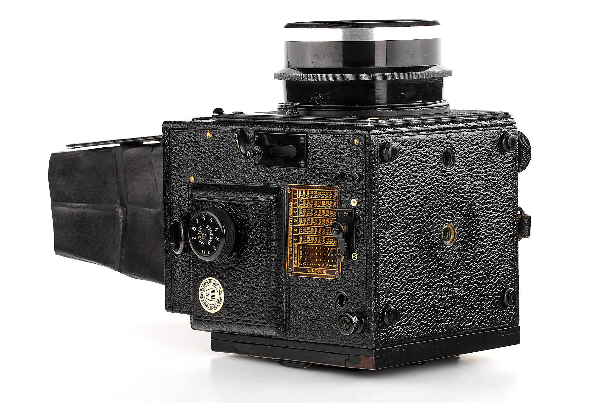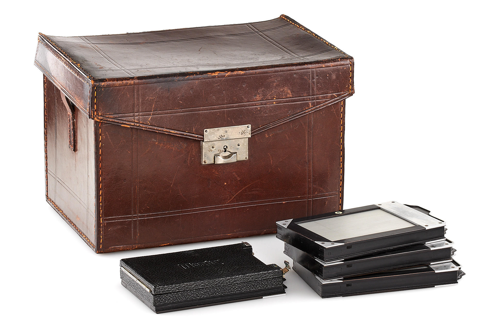extremely rare SLR camera for 6.5x9cm, produced by Mentor and distributed by Agfa Ltd. London, based on the Mentor Night Reflex with ultra-fast Rietzschel Prolinear 1.9/13.5cm no.190286, here engraved 'Agfa Prolinear', in beautiful, near-mint cosmetic condition, the shutter needs repair, together with 3x double film plate backs, 1x film magazine, 1x focusing back and the original leather case