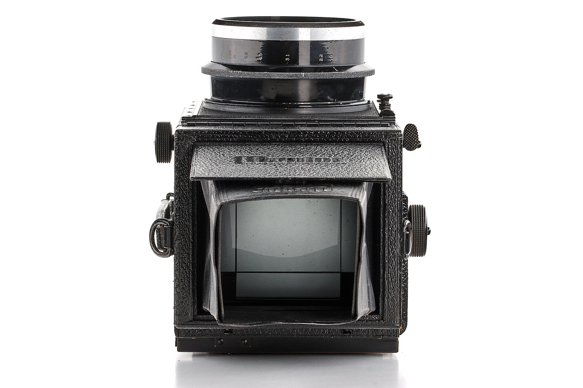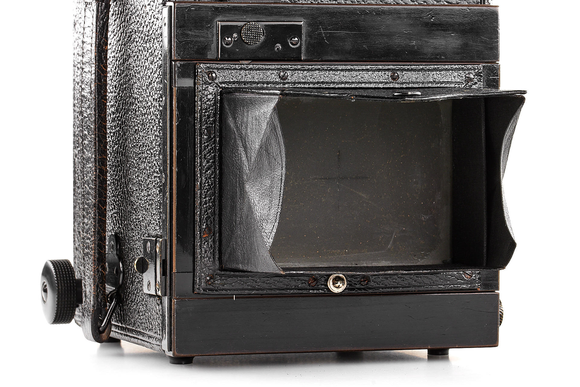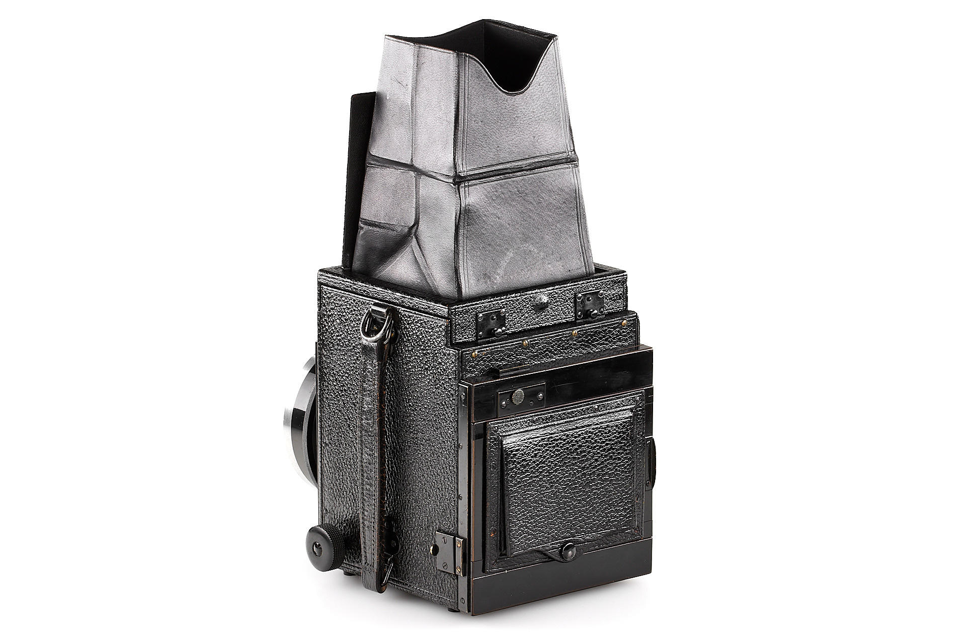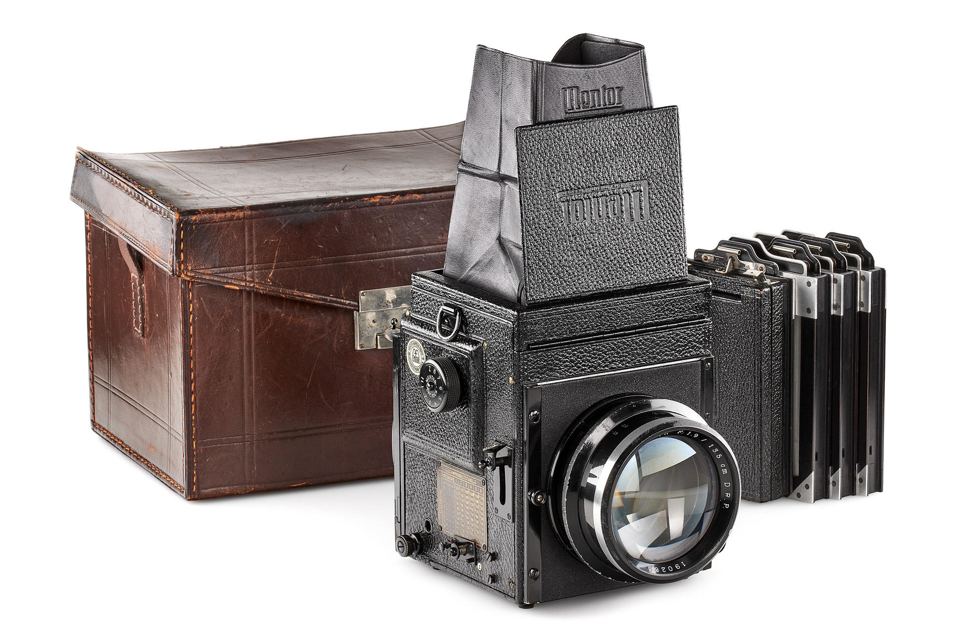 extremely rare SLR camera for 6.5x9cm, produced by Mentor and distributed by Agfa Ltd. London, based on the Mentor Night Reflex with ultra-fast Rietzschel Prolinear 1.9/13.5cm no.190286, here engraved 'Agfa Prolinear', in beautiful, near-mint cosmetic condition, the shutter needs repair, together with 3x double film plate backs, 1x film magazine, 1x focusing back and the original leather case