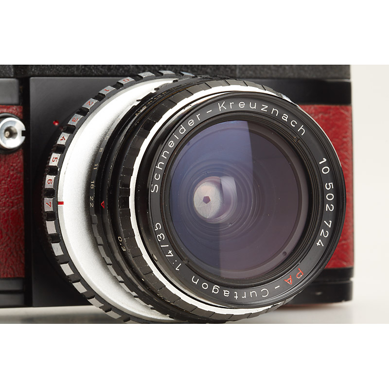 very rare 10d with red leather (official batch, only 47 cameras produced), partly black painted and black crinkle finish, with PA-Curtagon 4/35mm no.10502724 (cap)
