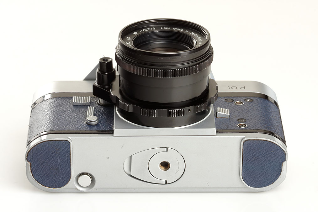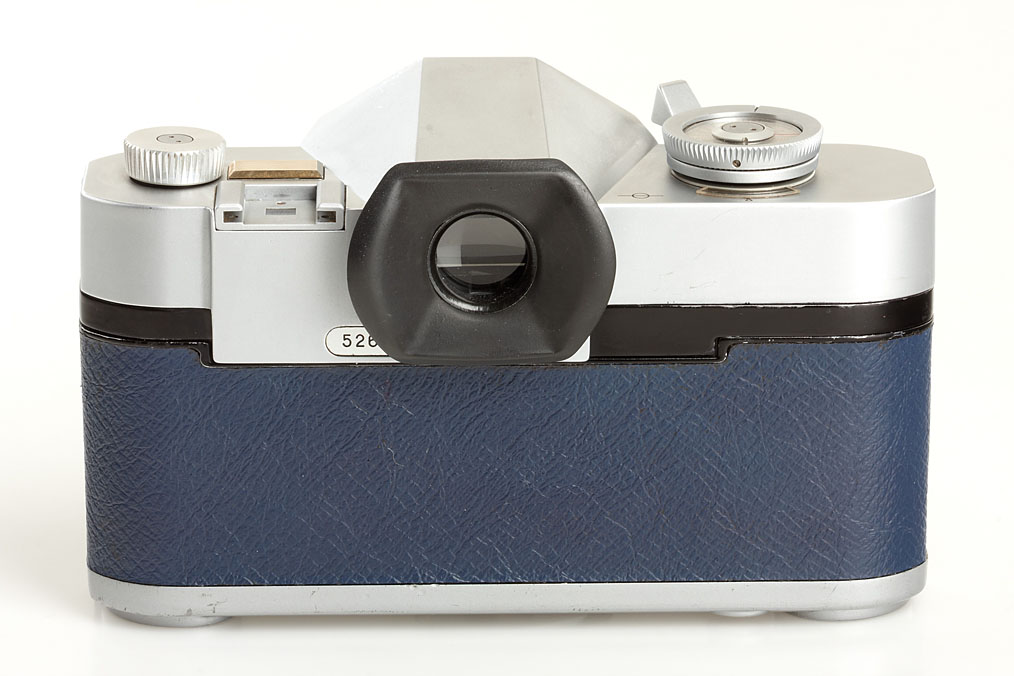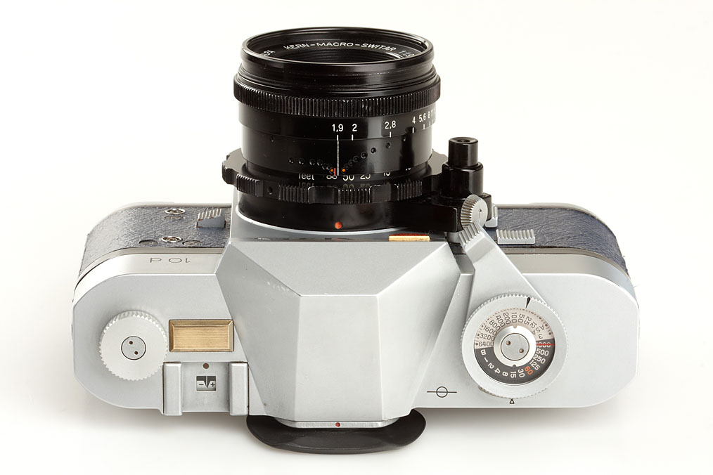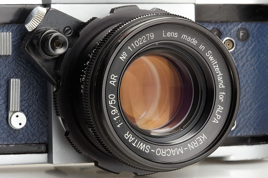 rare Alpa with blue leather covering, in good working order (meter not working) with matching all-black Kern Macro-Switar 1.9/50mm no.1102279
