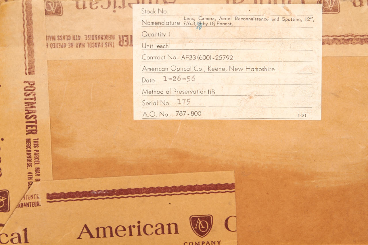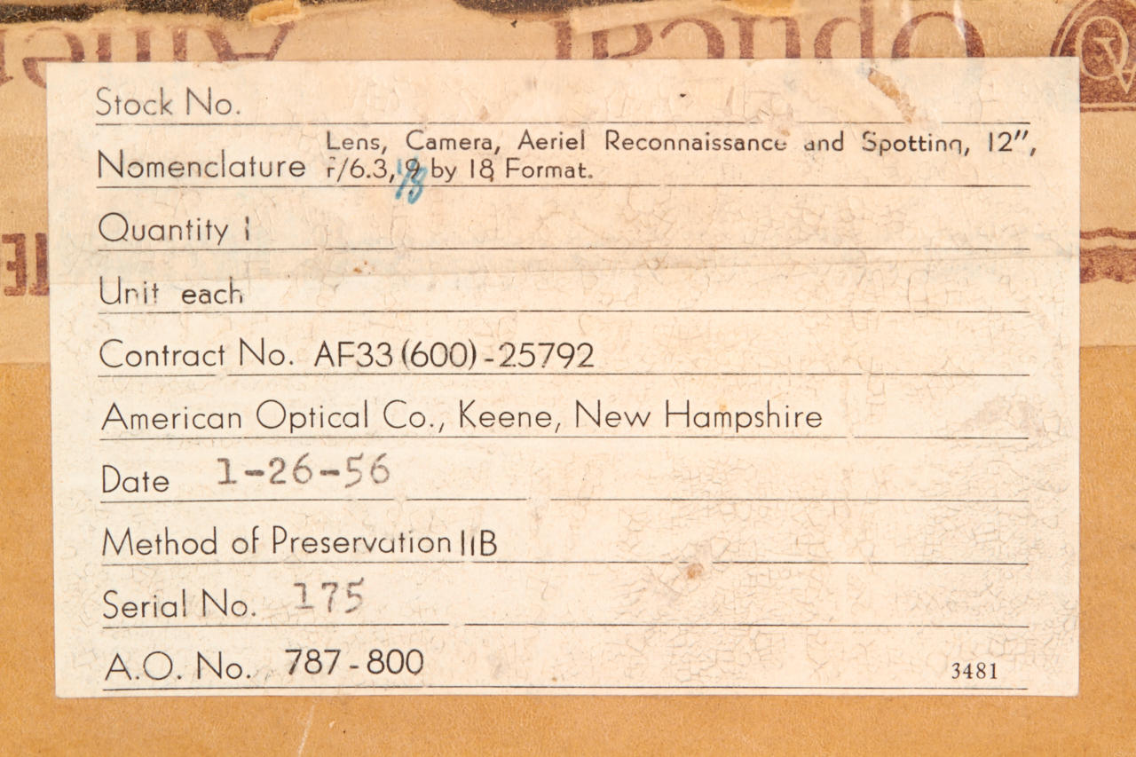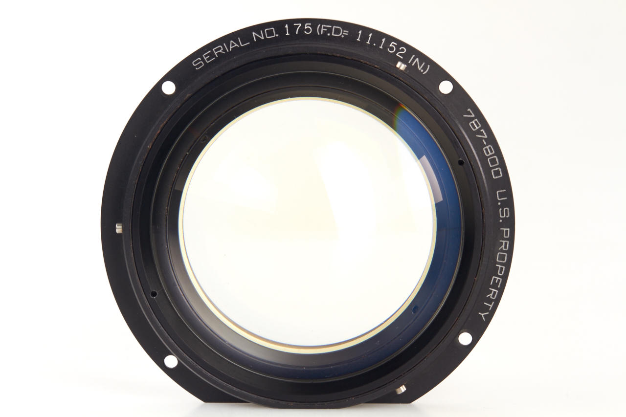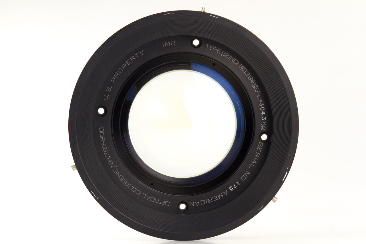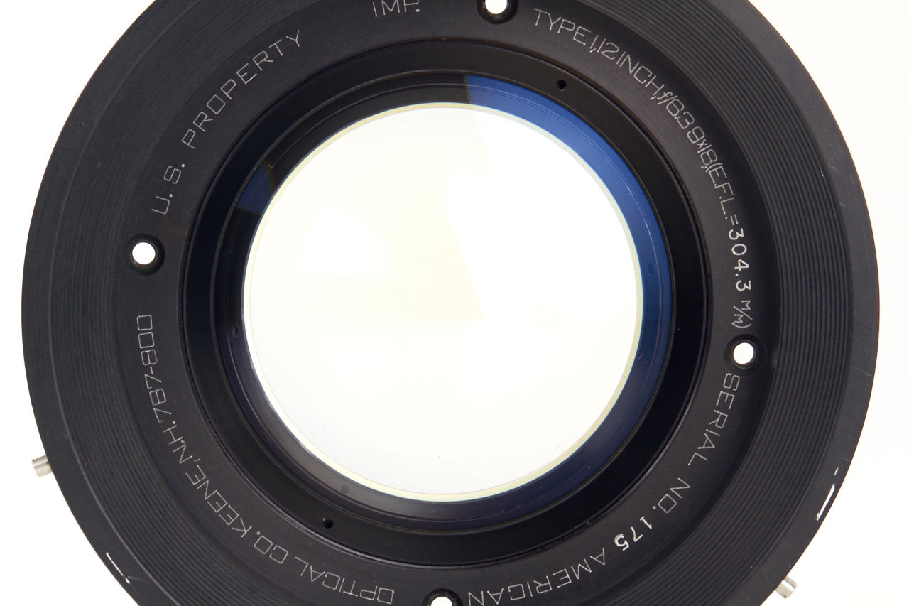 Topogon-style large format ultra wide angle lens, focal length 12" (304mm), covering 18"x18" large format, made in very small quantity for aerial photography, technical specification from the included sheet: Lens: 12 Inch s/6.3 Catalog number: 51-90-21-002 Equivalent focal length: 304.8 +- 6.0mm Back focal distance: 240.5+-6.0mm Telephoto ratio: 0.88 Front operating aperture: 166.5mm Rear operating aperture: 168.4mm Film size covered: 9x18 inches One half angular coverage 40.0° Front clearance angle: 40.5° max. Rear clearance angle: 37.5° max. Applicable military specification: MIL-L-7236A Number of lens elements: 5 including vignetting correction filter, the lens is in like new condition, both front and rear elements have original caps, two filters (red and yellow), maker's box