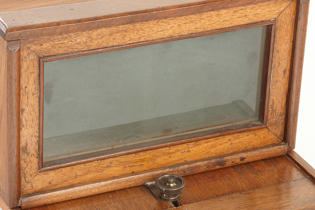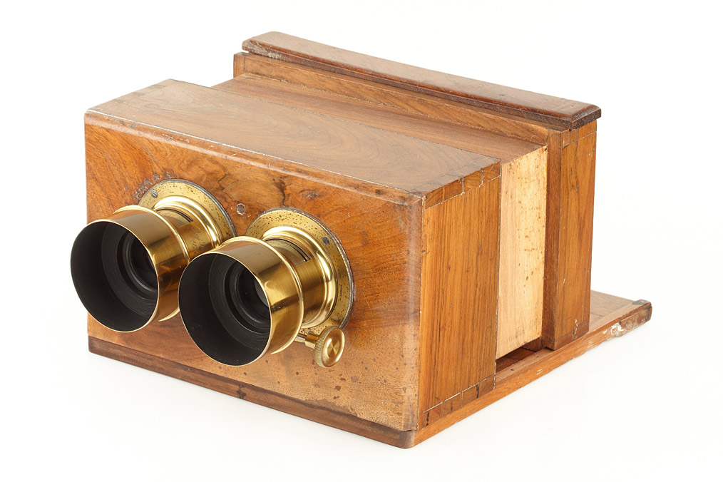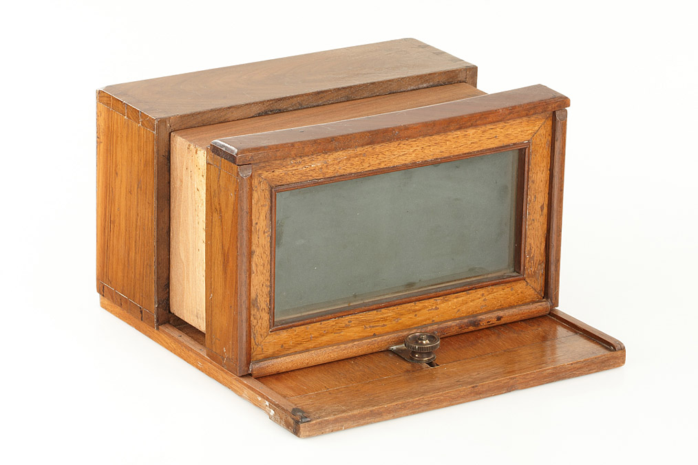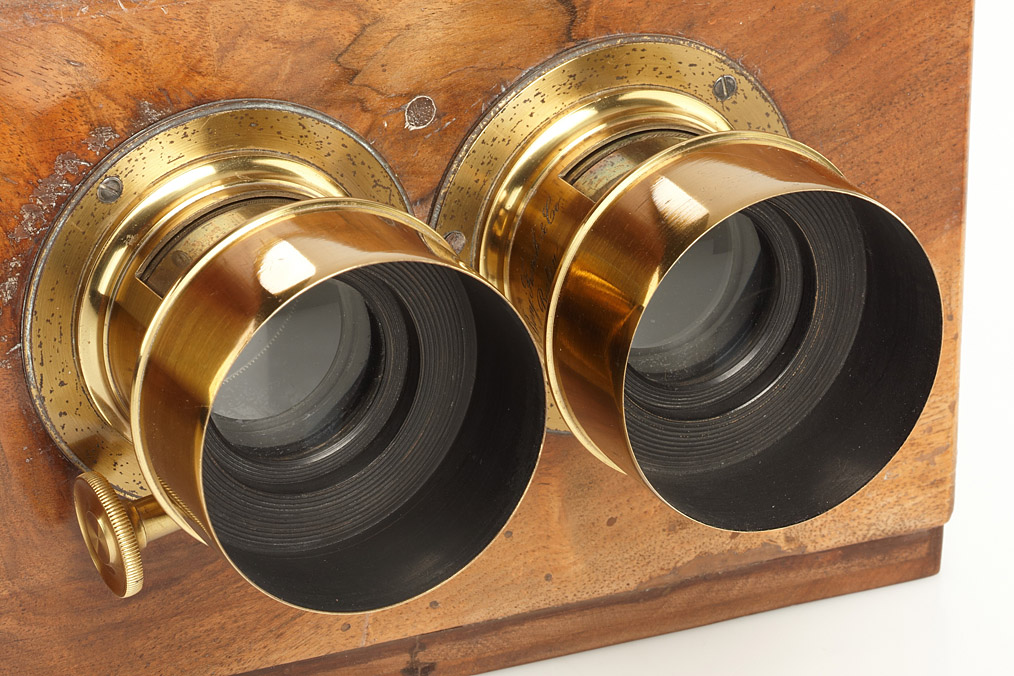 for 9x18cm plates, polished wood body, with a pair of Benj. French & Co Boston brass lenses for waterhouse stops with rack and pinion focusing, an early American sliding box stereo camera in good condition