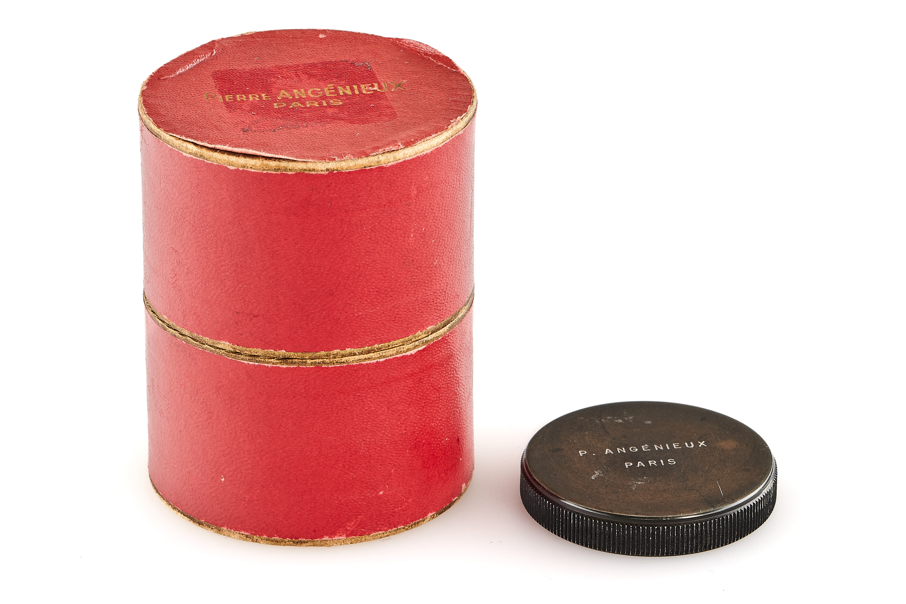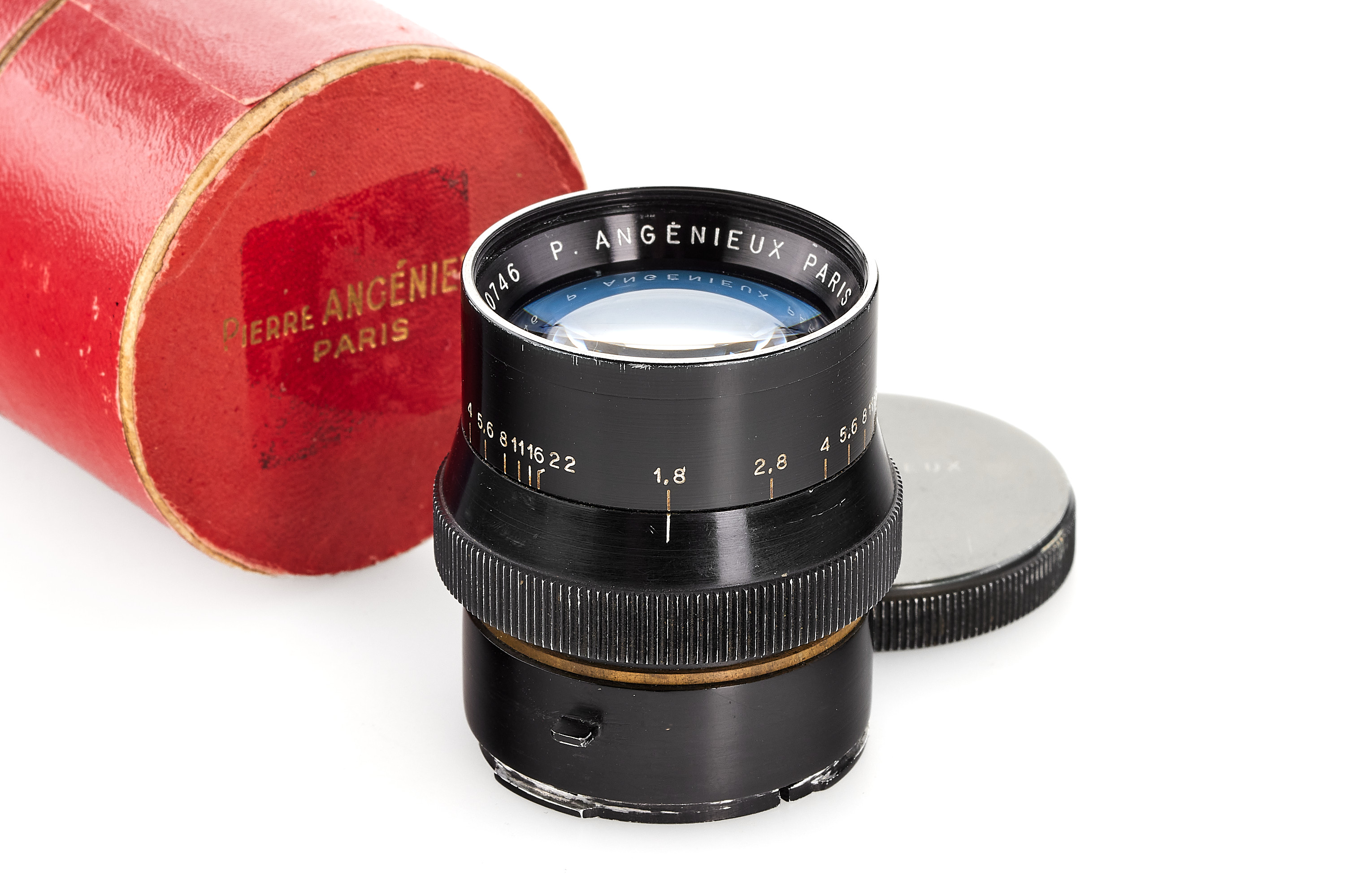 Sought-after and early Angénieux lens in very rare original Contax mount, in very good condition, coated optics showing a light haze and few blemishes, with front cap and red maker's box.