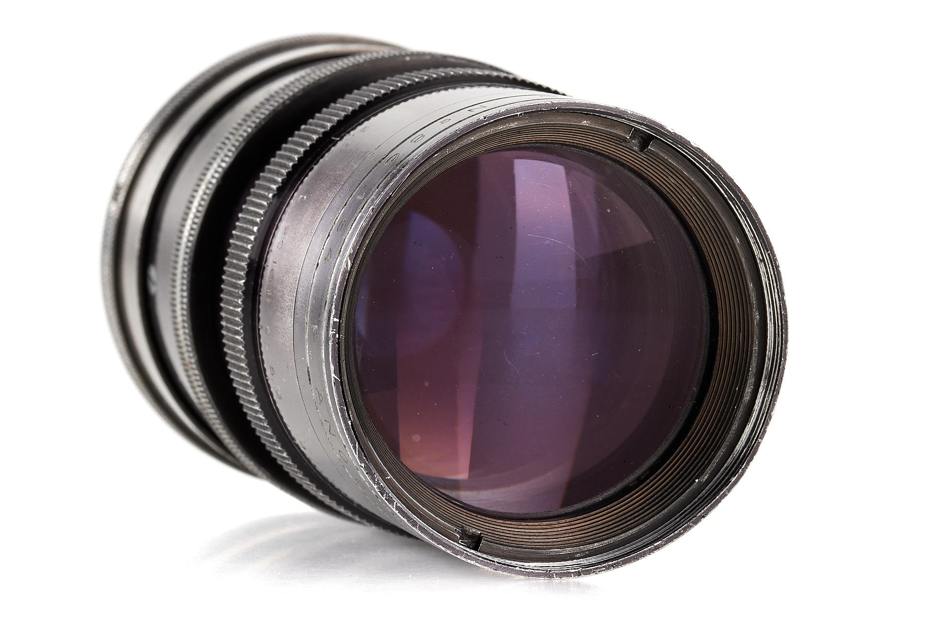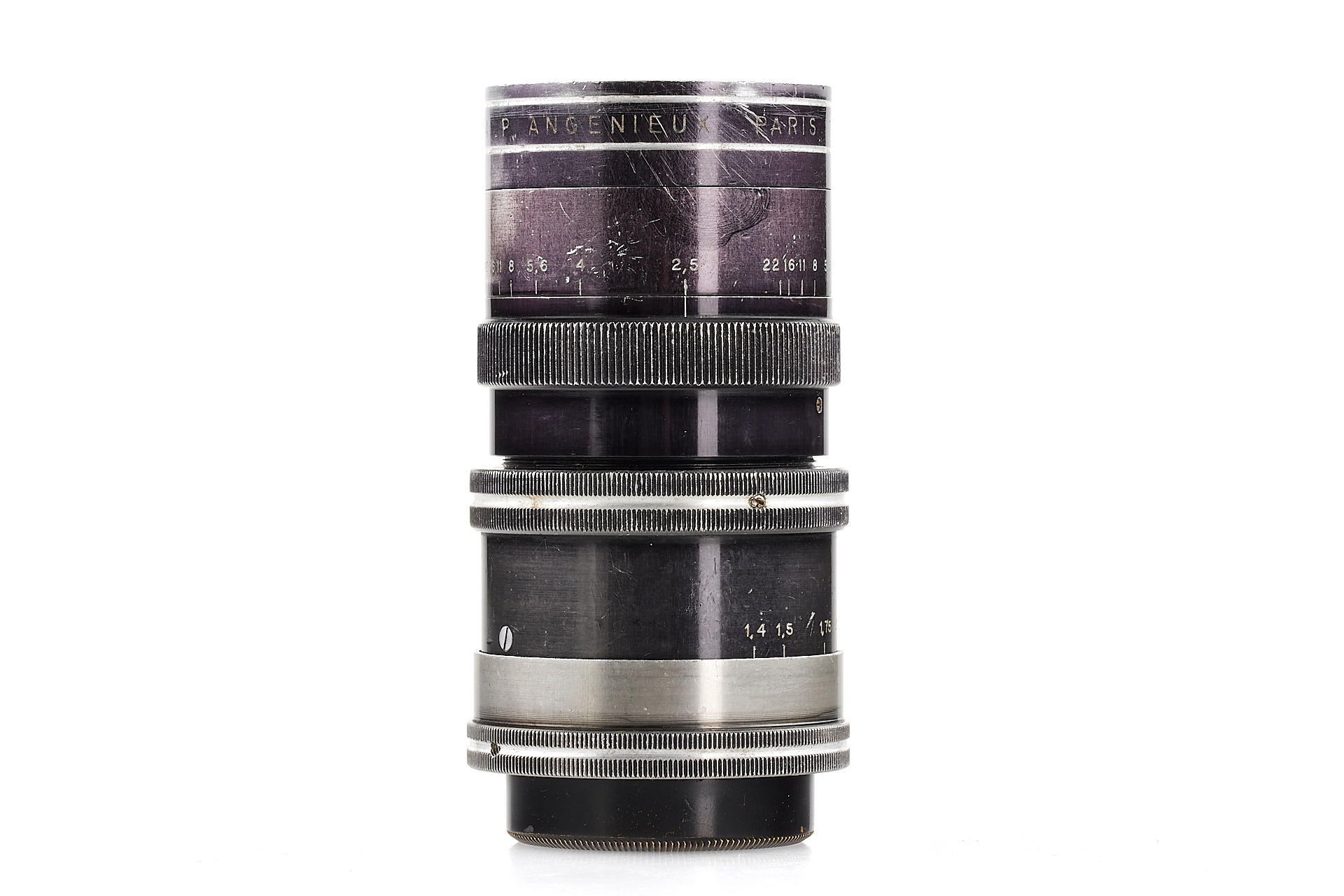 sought after Angénieux lens in original rangefinder coupled M39 mount, in good condition, coated optics showing some cleaning marks and a light haze, with original hood (cond. B-) and rear cap