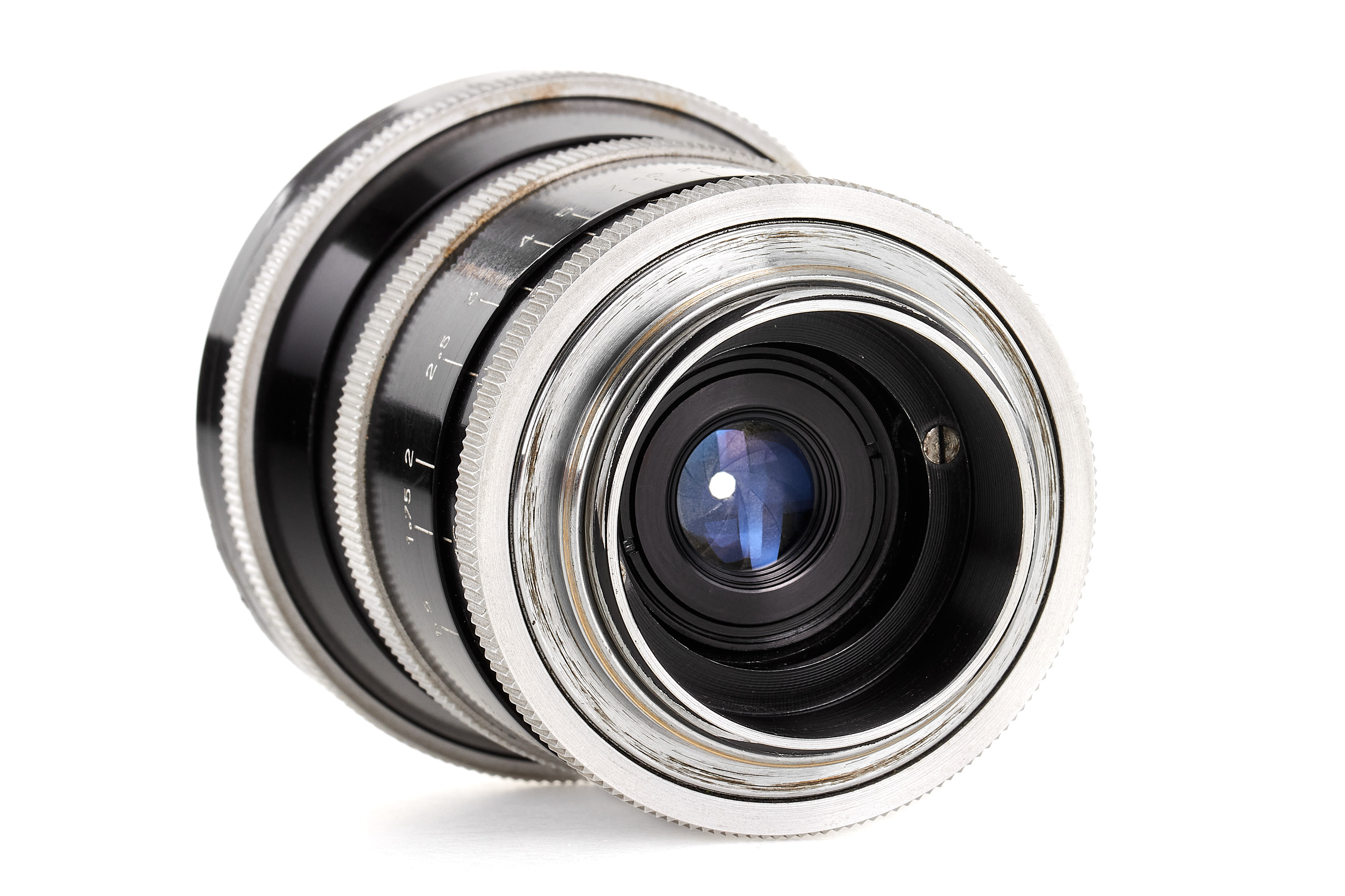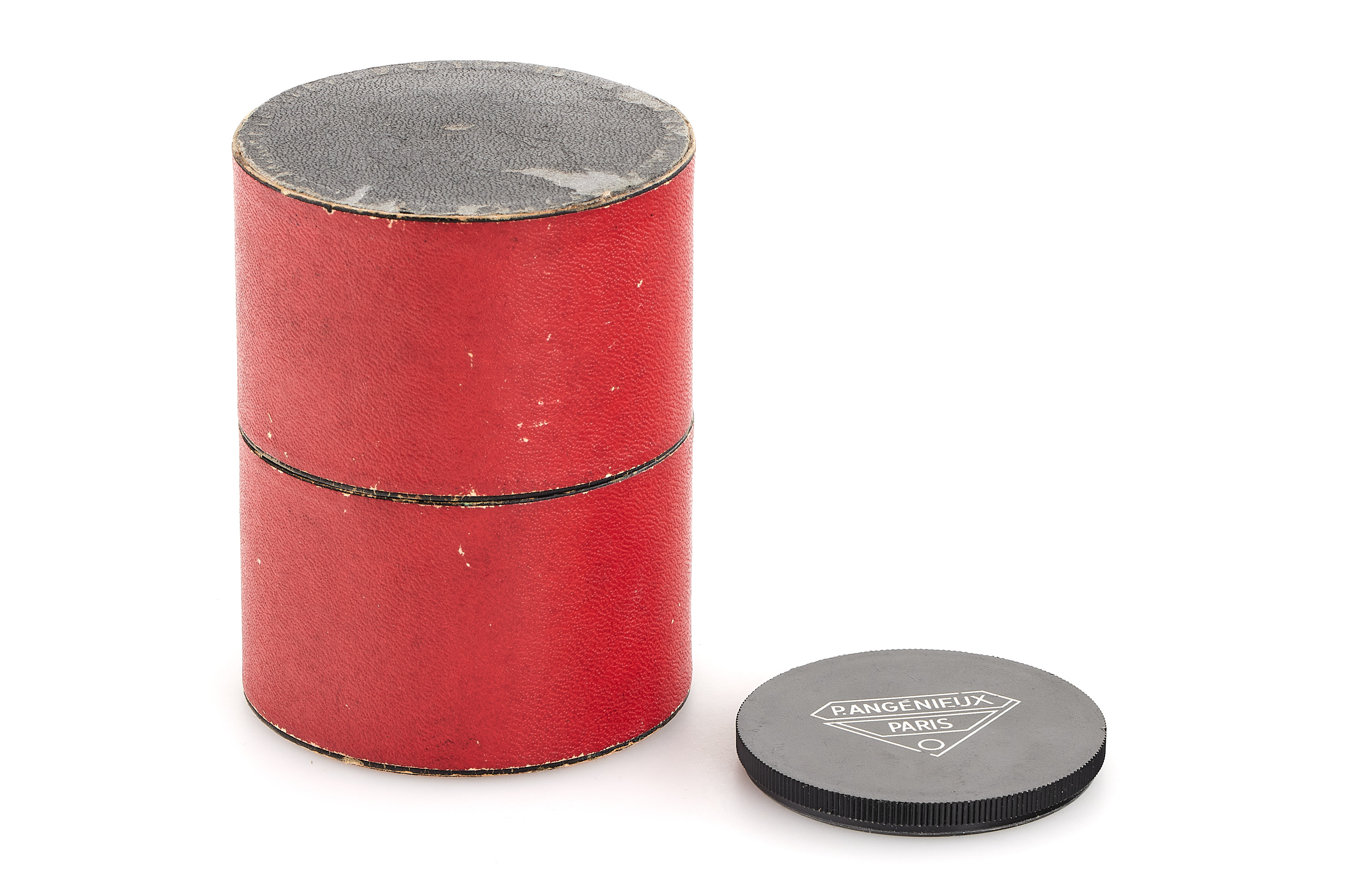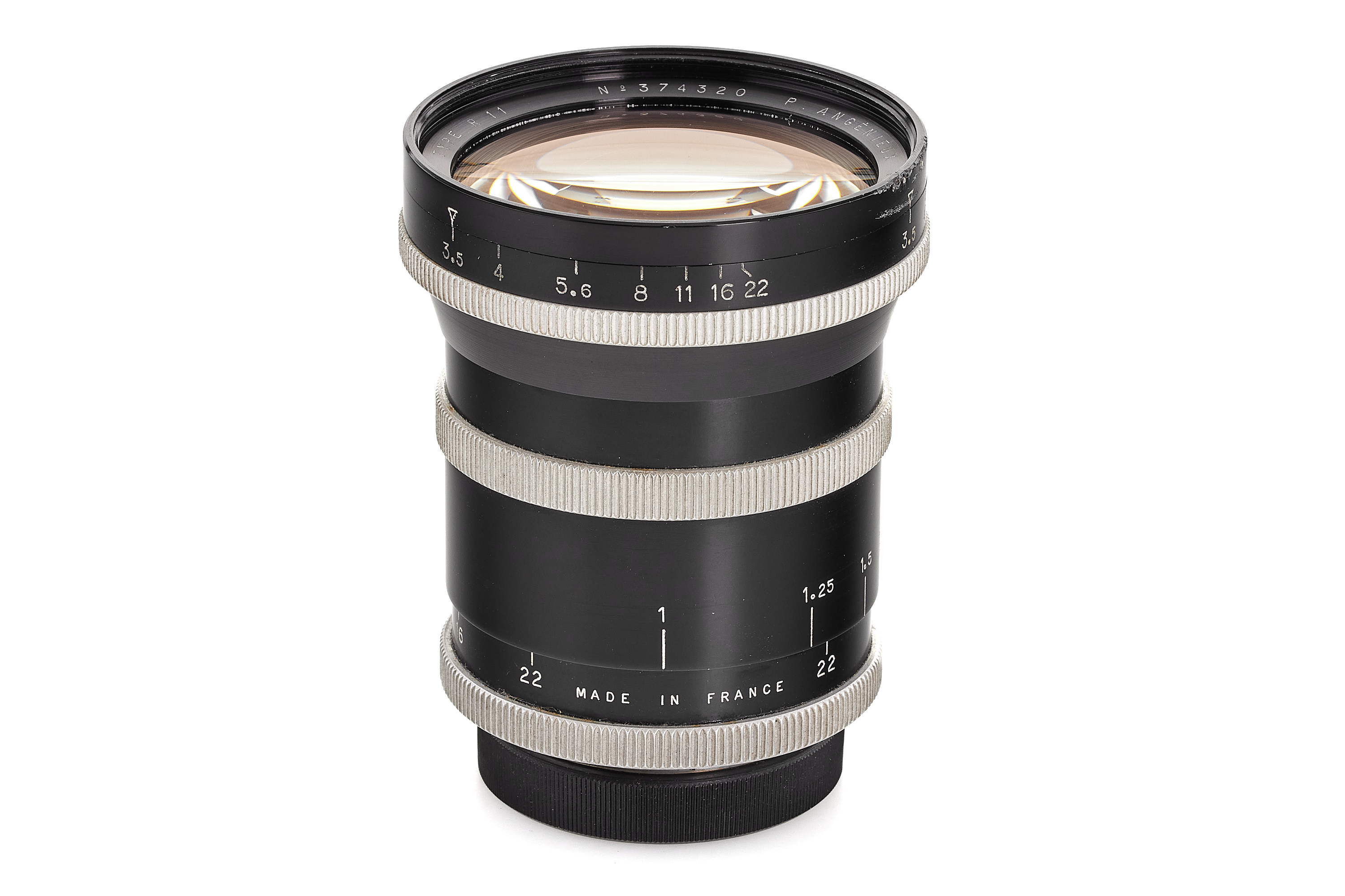 A rare Angénieux lens in original Leica M39 mount, rangefinder-coupled, in very good condition, including caps and matching maker's box.