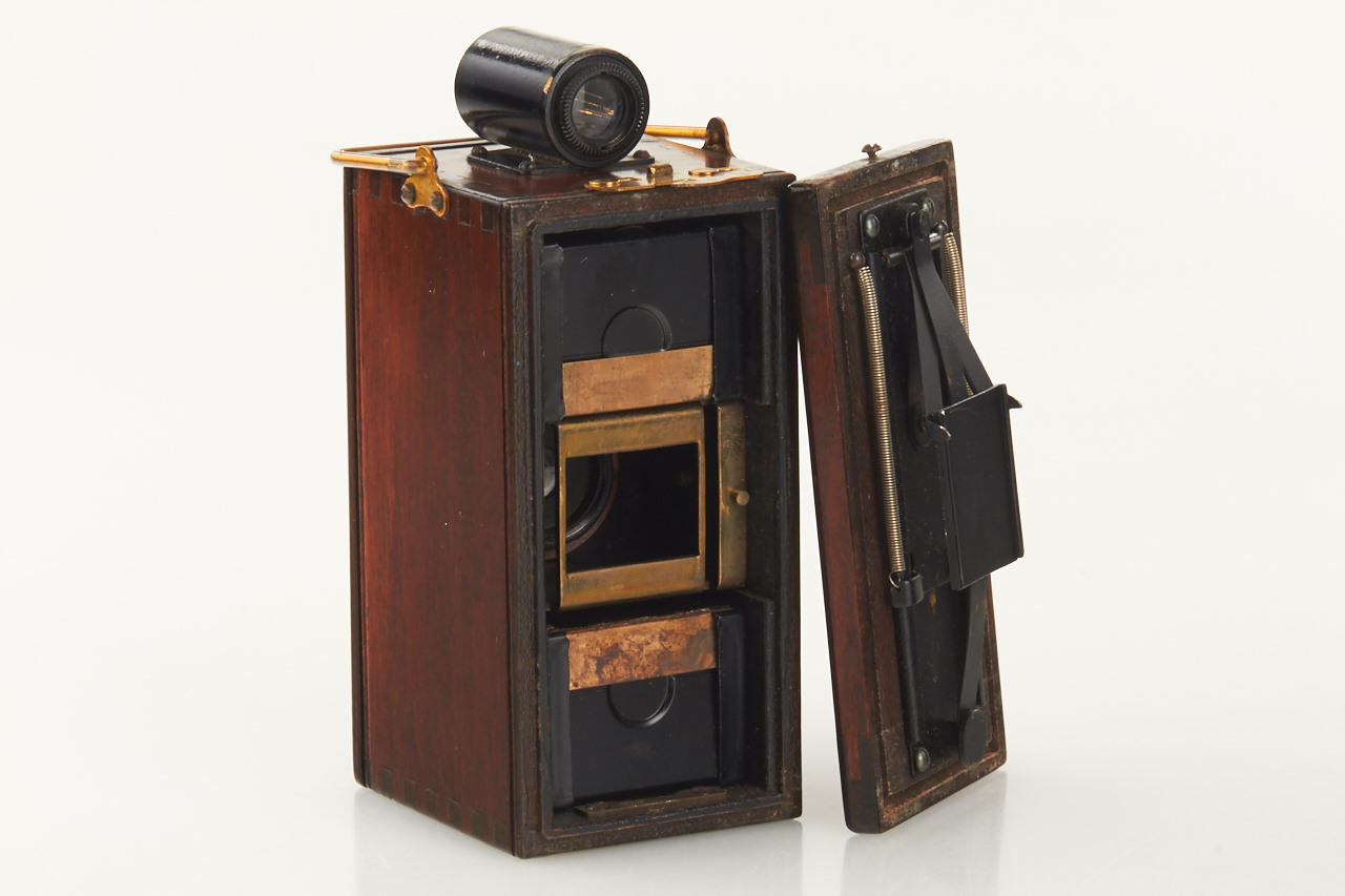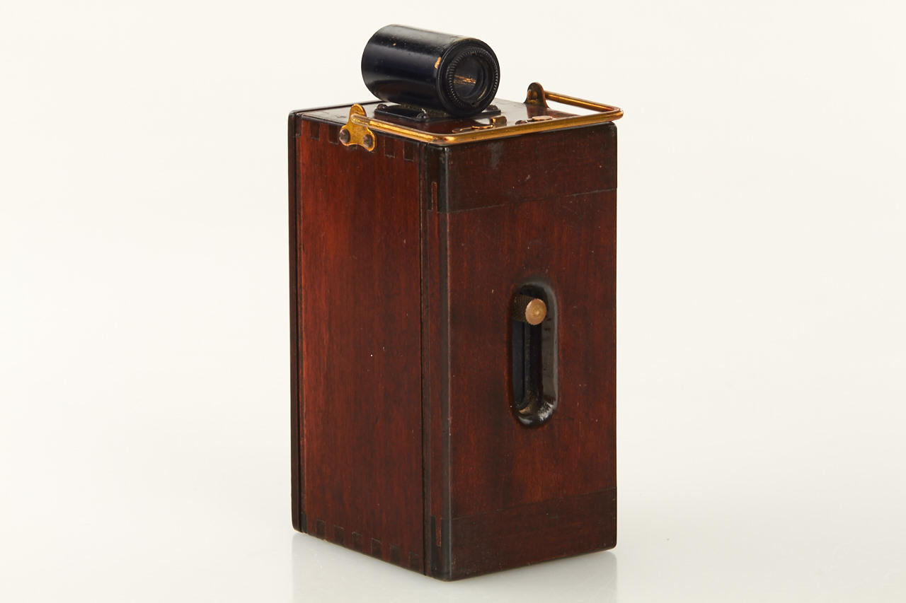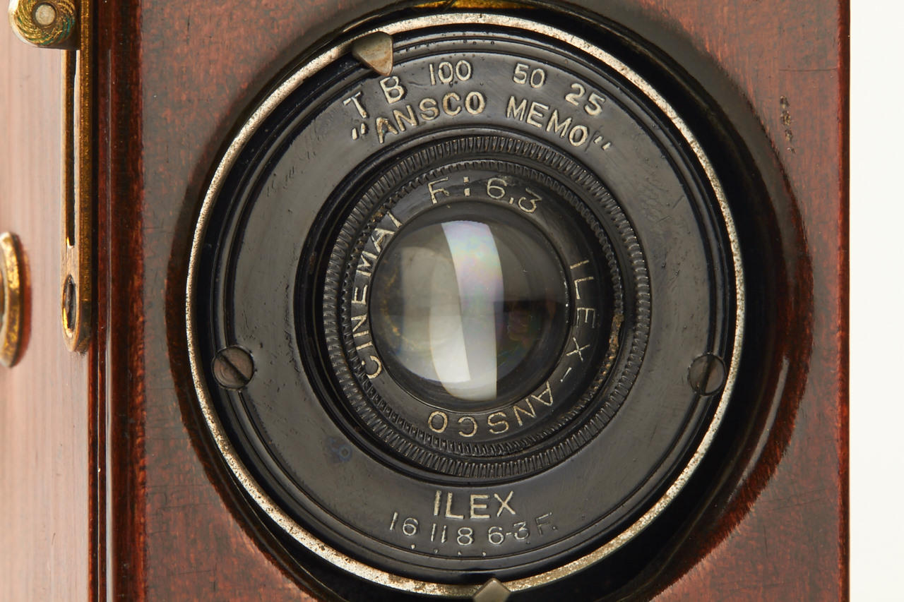 35mm camera for 50 18x23mm exposures, included two special film cassettes, very rare version with polished wooden body, Ansco Cinemat F:6,3 lens in working Ilex shutter