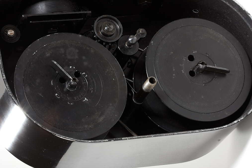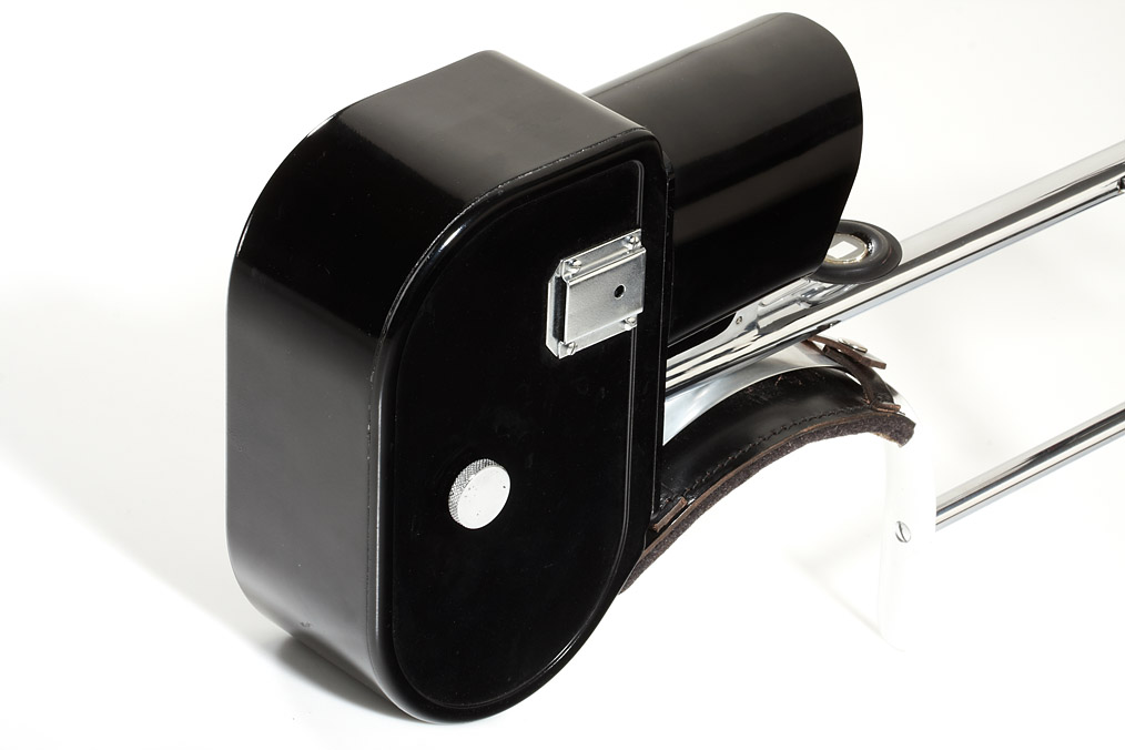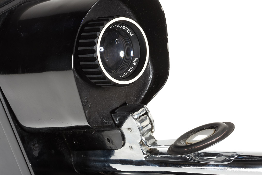 rare Swedish identification camera for 35mm film on 15m spools, with rapid wind system and frame counter, the camera is mounted on a leather padded shoulder support with a plastic covered handle, in front of the lens a hinged mask which is swivelled in when a picture is made and a metal framework which operates as a spacer and a supporting stand. The specific purpose of the camera is unknown, but it is evident that it was intended to take a large series of standardised images. In very good and working condition, with three pairs of Kodak spools and in the original outfit case.