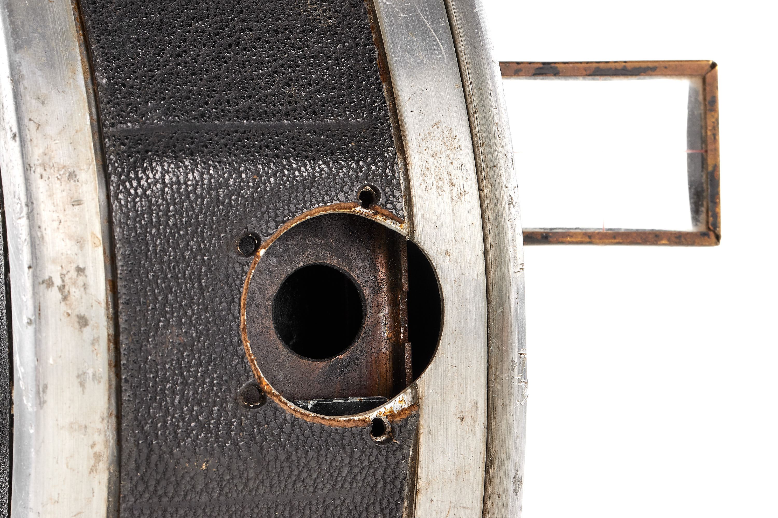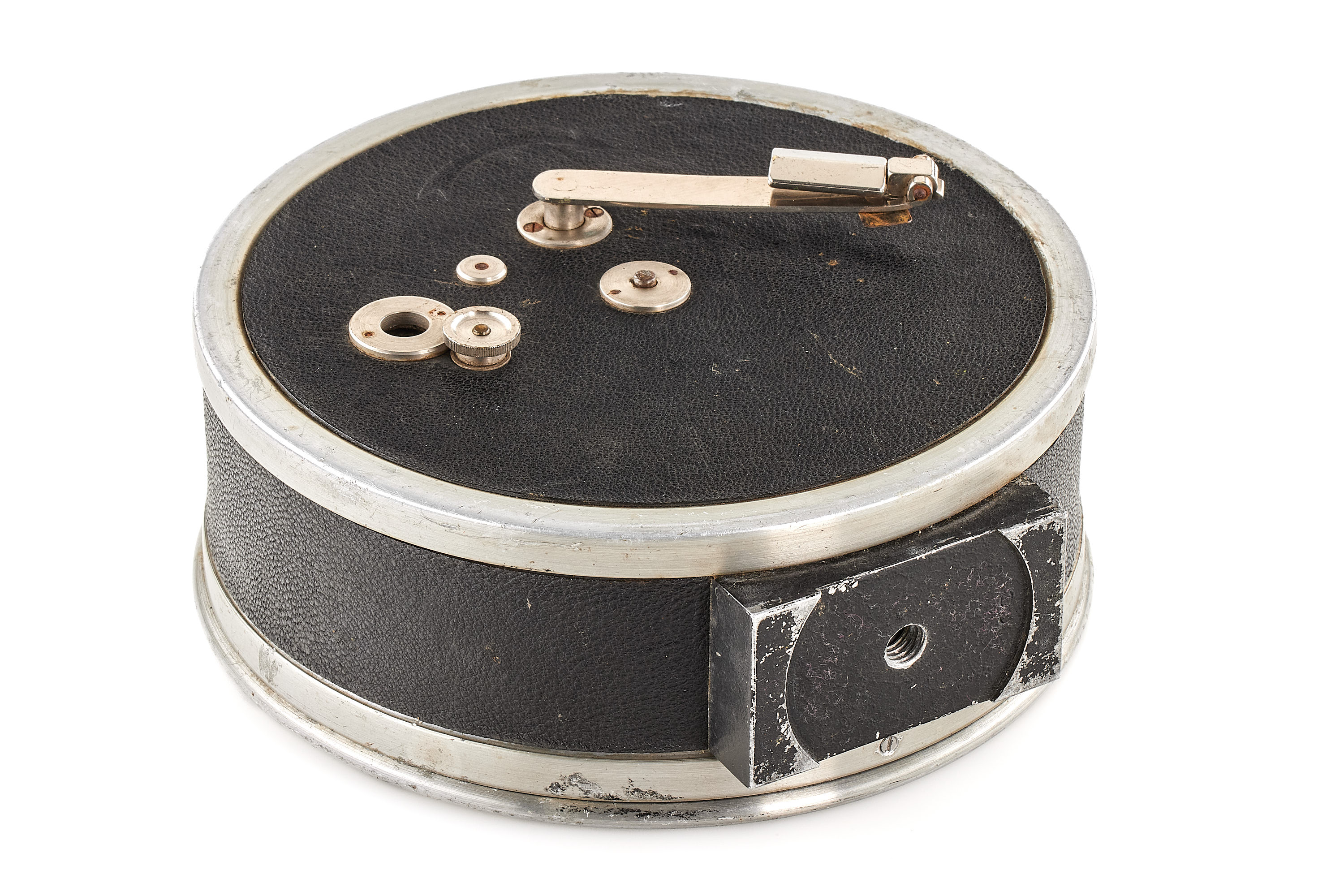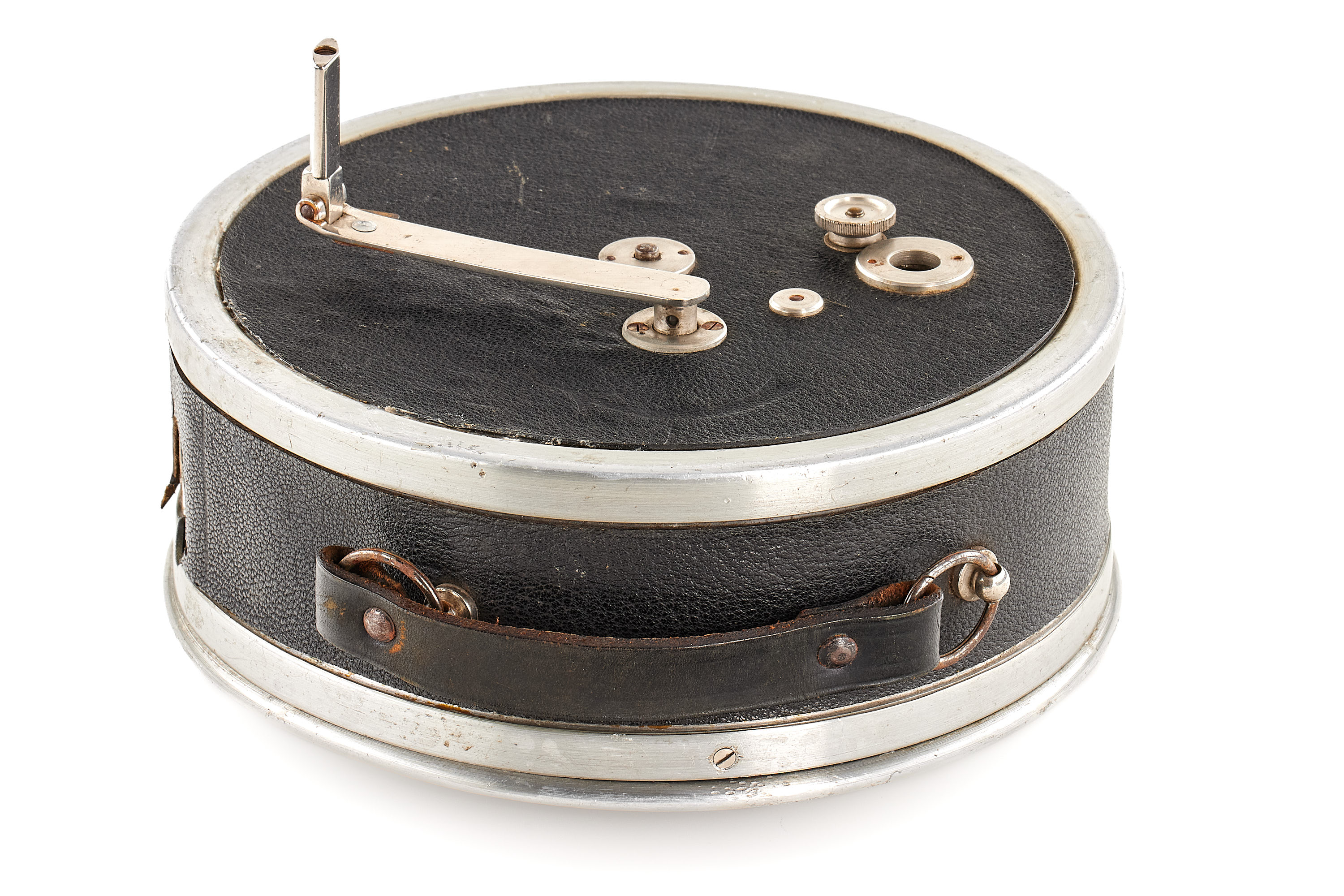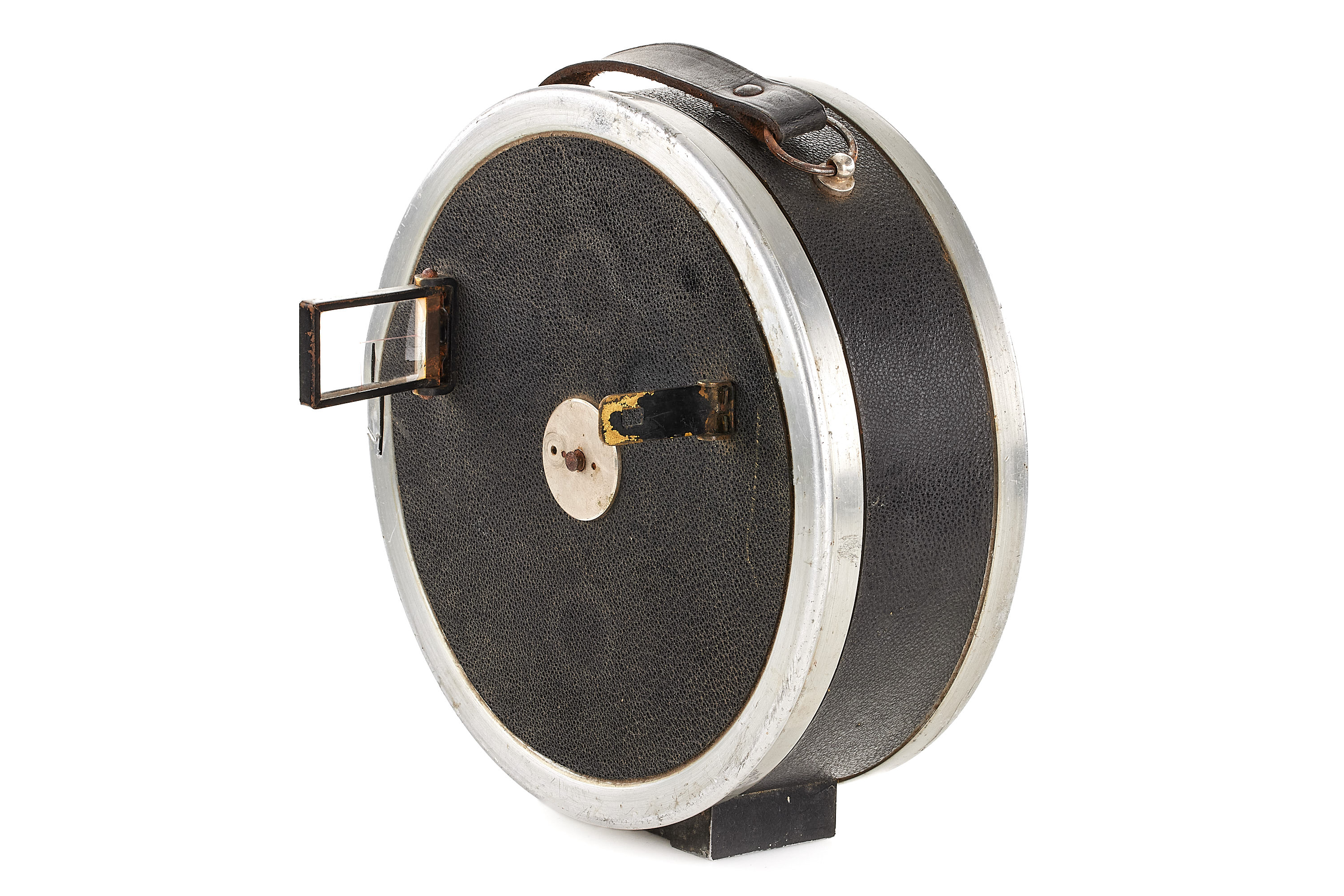 Extremely rare first type 35mm ARRI film camera, hand-cranked drum-shaped aluminium body and folding Newton finder, in good condition and working order, very early serial number 8, matching number on the cover, the lens is missing.