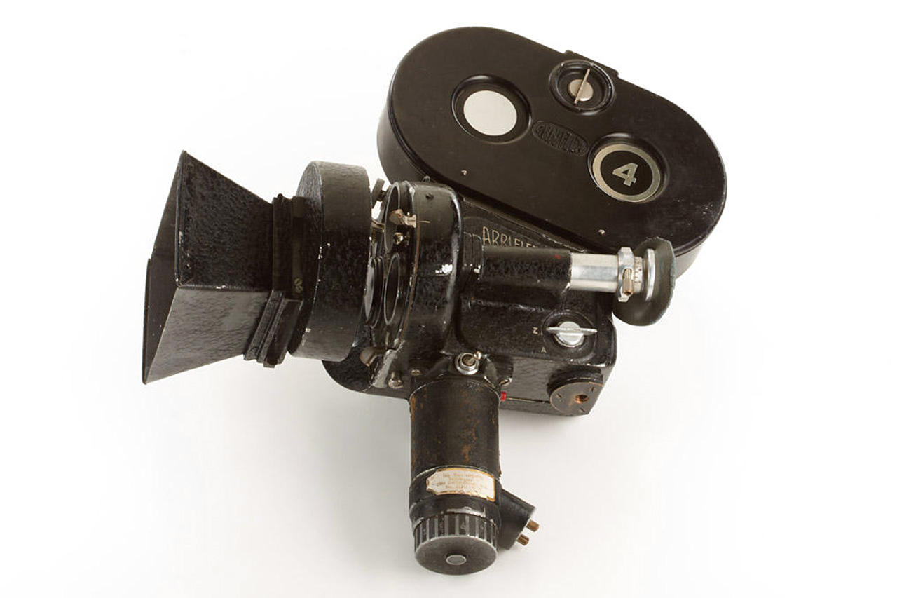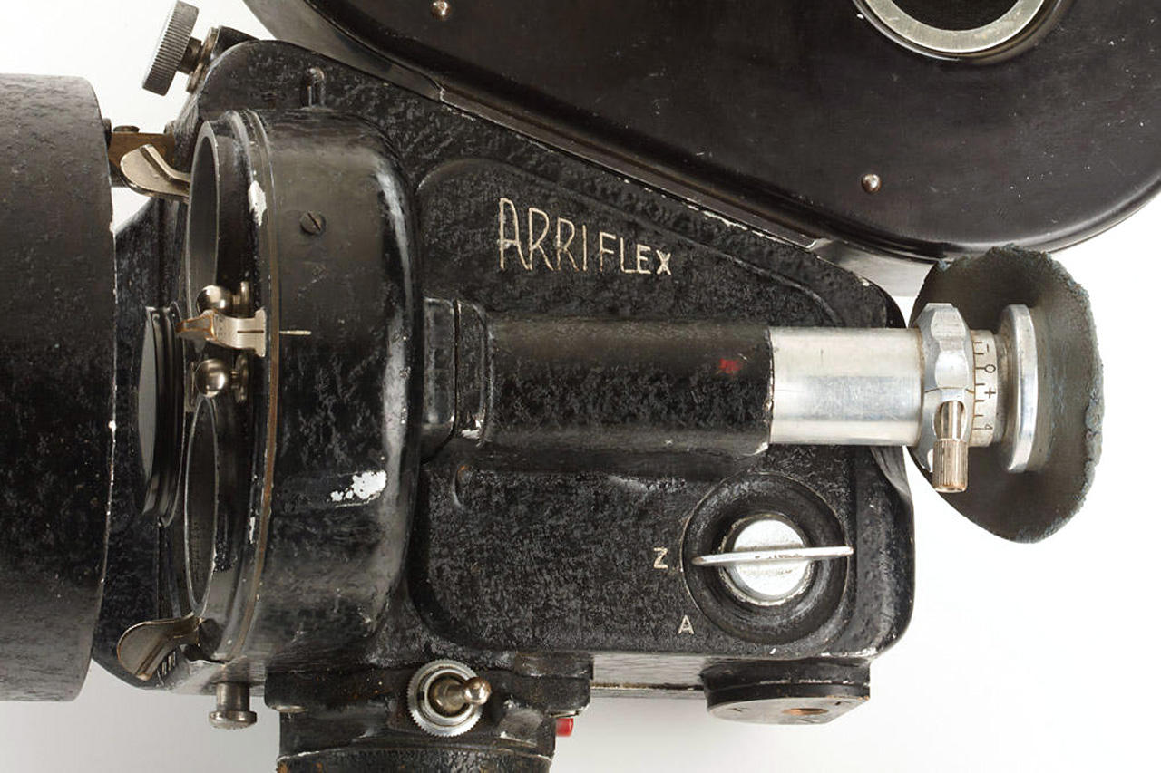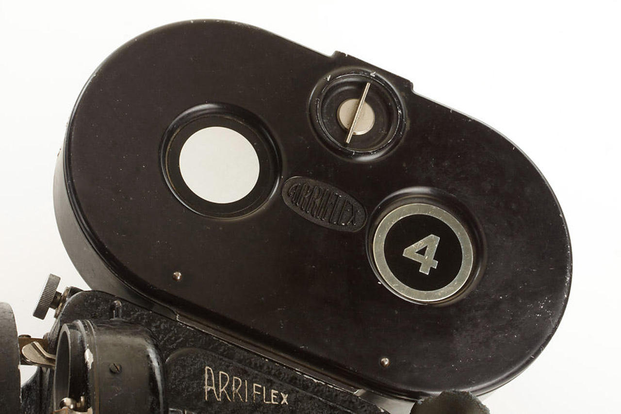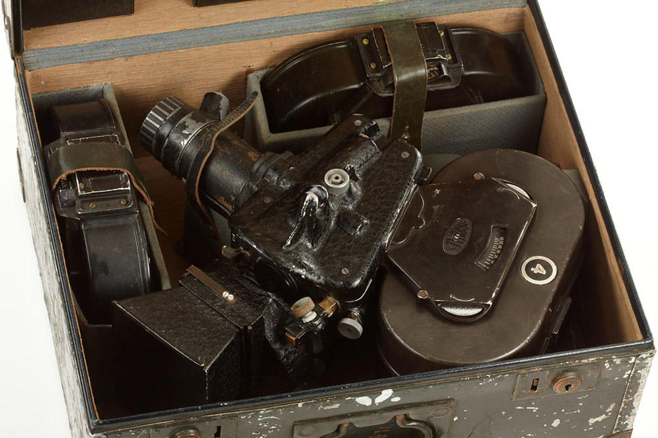 Arriflex 35 in the original olive Wehrmacht outfit box, including the matte box and 4 x 60m magazines. The camera has never been restored and is in original used condition, its shows all the early features like the square matte box holder and the film gate made of Pertinax (an early synthetic material). It seems that the set was prepared for the rough field service since it is marked inside the tap door: "Kamera und zugehörige Kassetten sind kältefest bis -50° C, daher keinesfalls schmieren!" (The camera and its magazines are cold-resistant up to -50°C - do not use grease!). The original motor is substituted by a later model. Also included is a rare ARRI Bakelite bayonet cover.