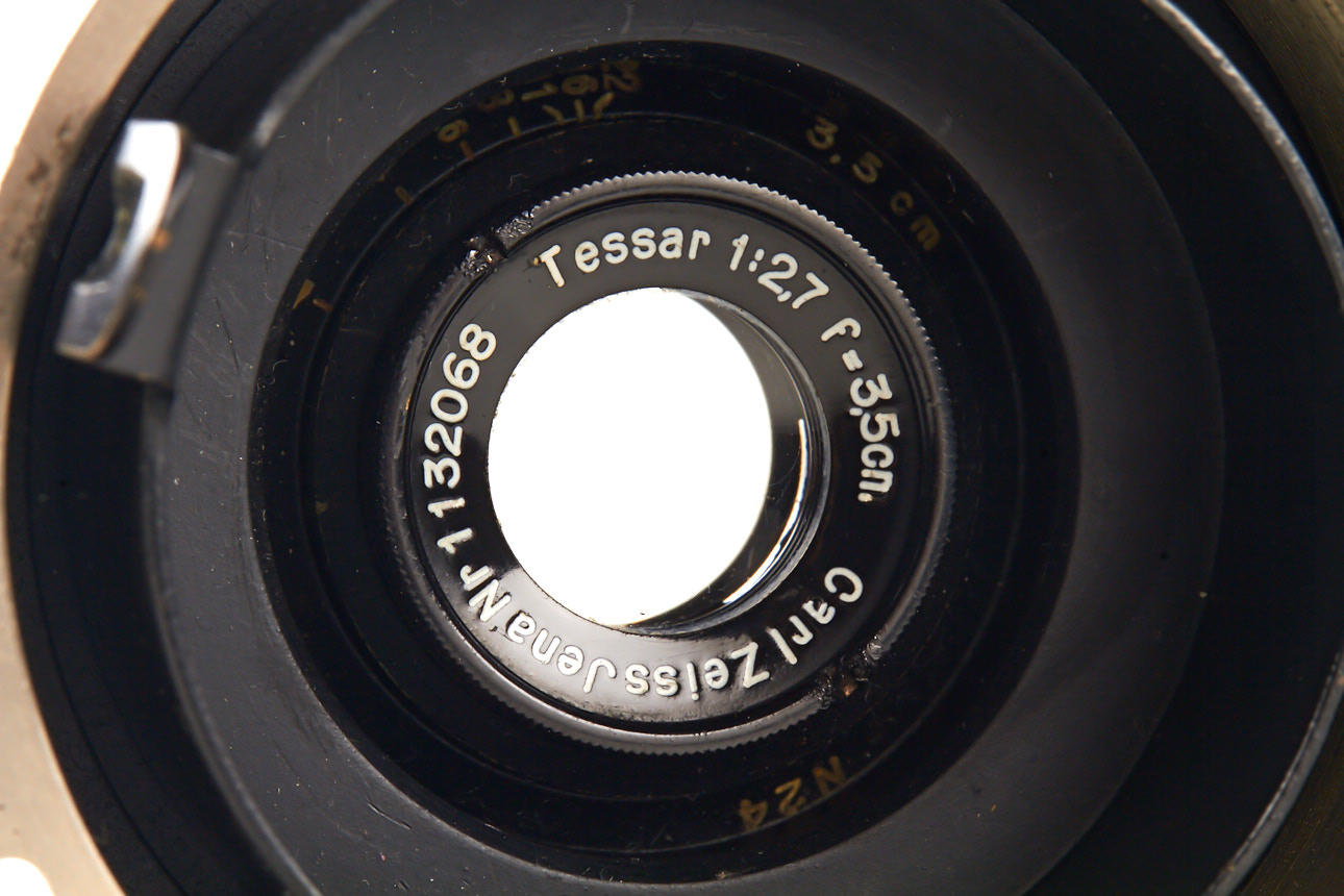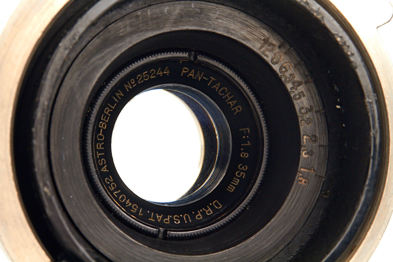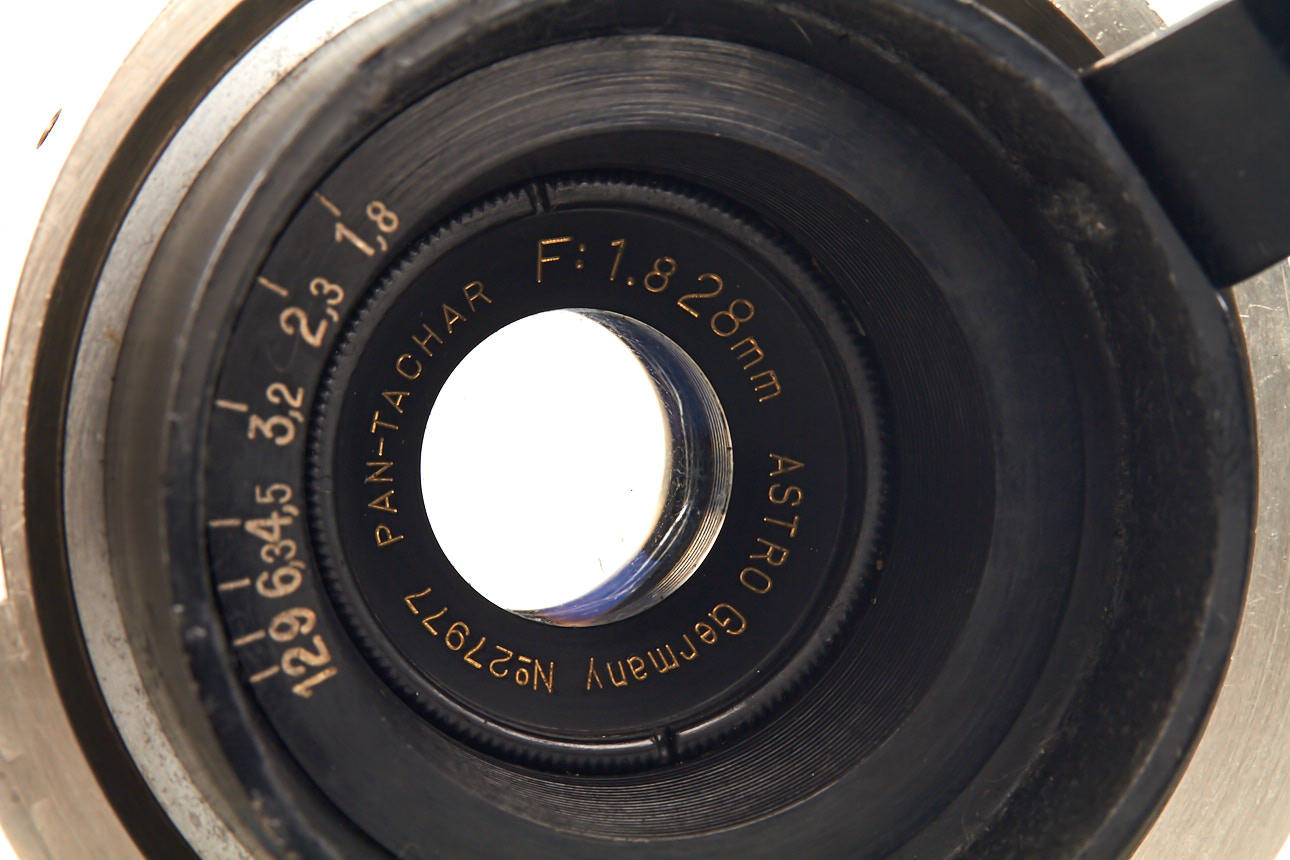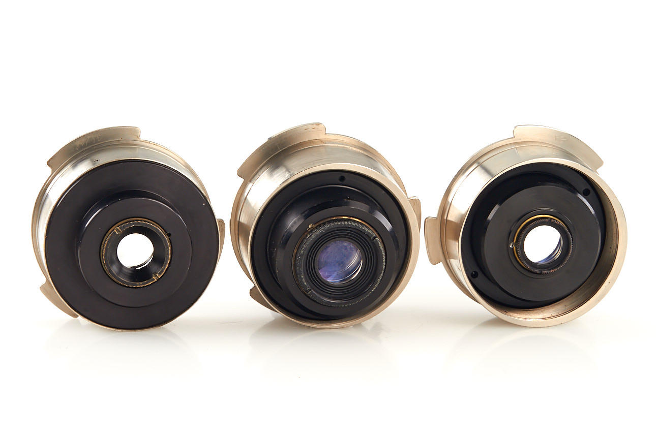 lot of three lenses in Debrie mount: (1) Pan-Tachar 1.8/28mm no.27977 (slight cleaning marks on front element), (2) Pan-Tachar 1.8/35mm no.25244 (good optics), (3) Tessar 2.7/3.5cm no.1132068 (minimal cleaning marks on front element)