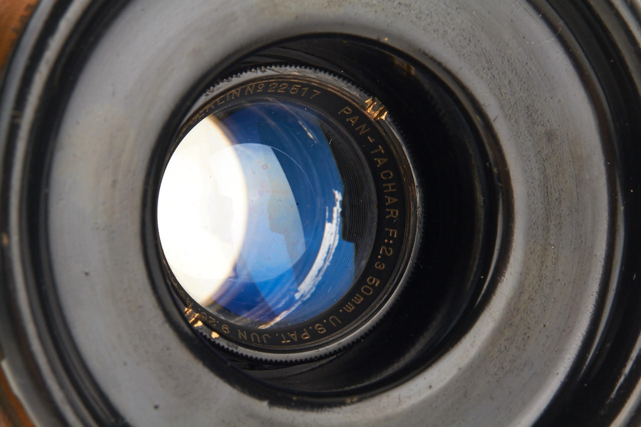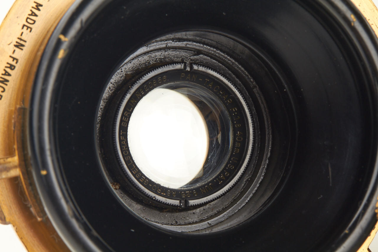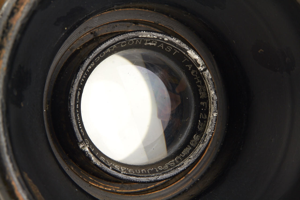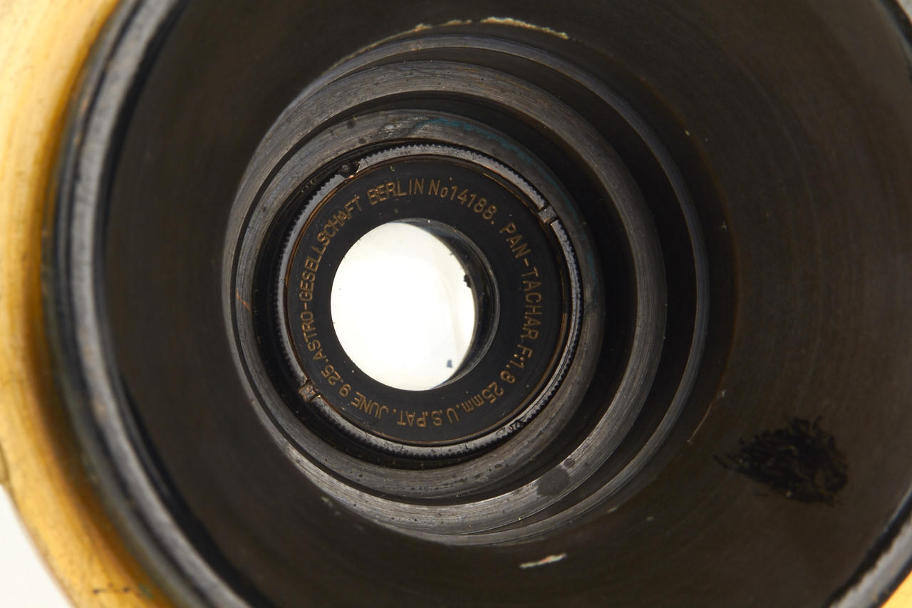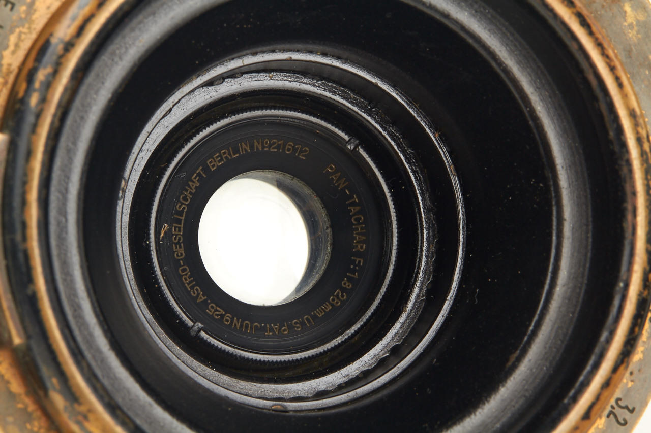 set of 5 Astro Berlin lenses and one Schneider lens in Debrie Parvo mount: (1) Pan-Tachar 1.8/25mm no.14188, (2) Pan-Tachar 1.8/28mm no.21612, (3) Pan-Tachar 1.8/40mm no.20856, (4) Pan-Tachar 2.3/50mm no.22517, (5) Contrast-Tachar 2.3/50mm no.5047, (6) very rare Schneider Xenon 2.3/12.5cm no.1810799, in wooden case, all lenses with good to very good optics