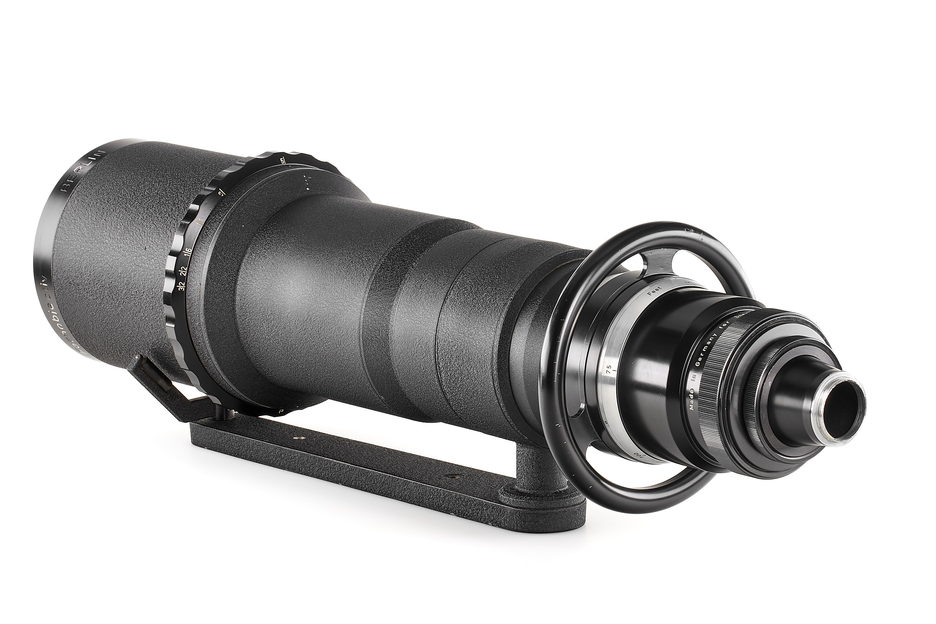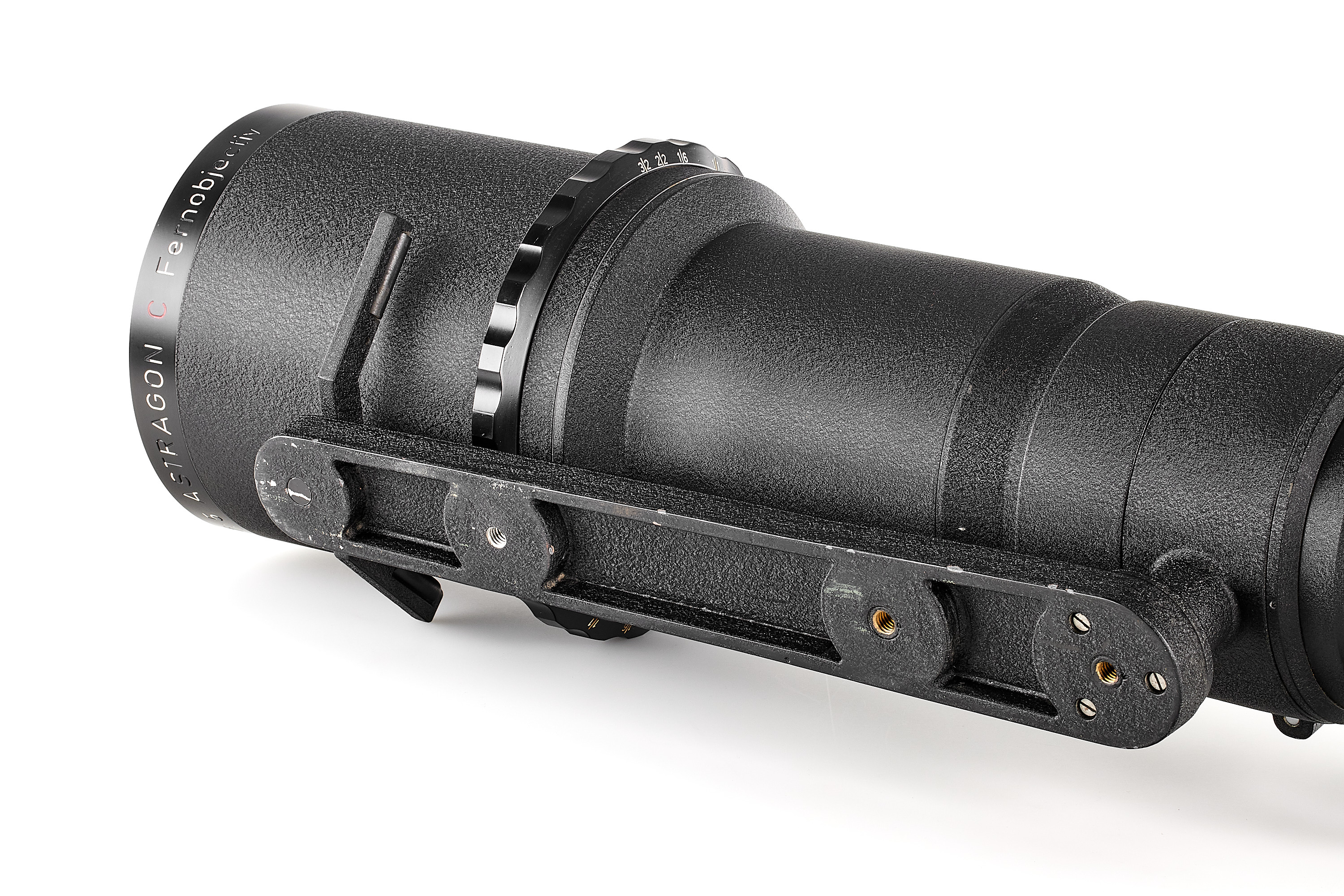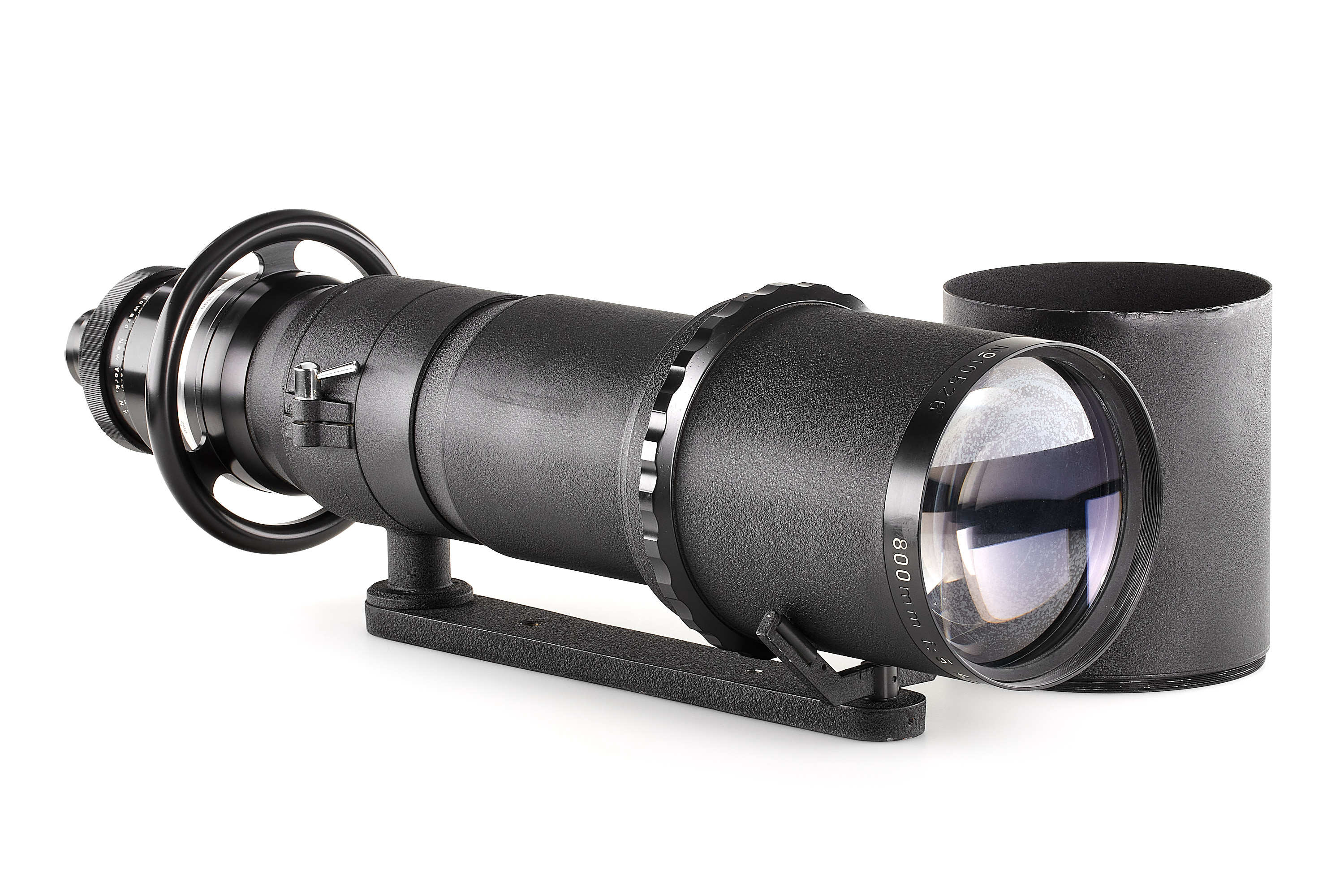 An impressive Astro telephoto lens in good condition (some repaint on the hood), optics showing some haze and focusing a bit hard. Typical for Astro large focusing wheel. Total length 99cm.