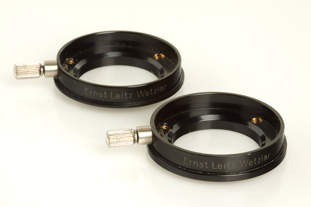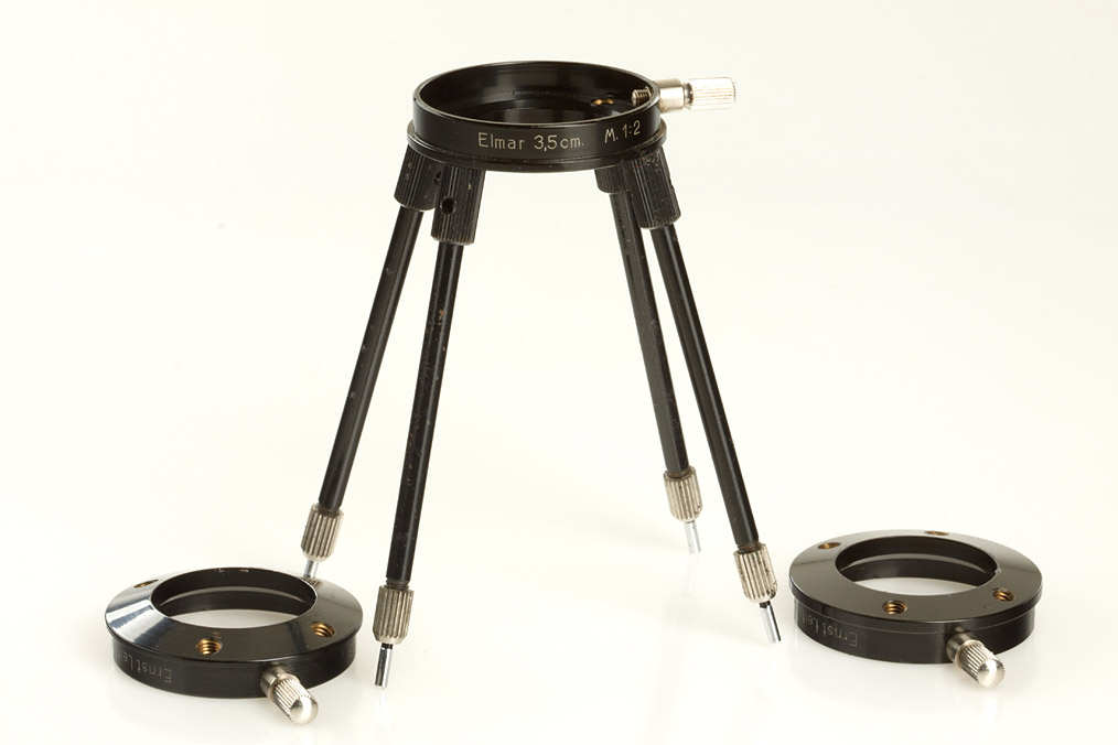 very rare auxiliary device for use with 3.5cm Elmar, with all 3 clamping rings, engraved: M. 1:1,5 Elmar 3.5cm, M. 1:2 Elmar 3.5cm, M. 1:3 Elmar 3.5cm, all in original early maker's box