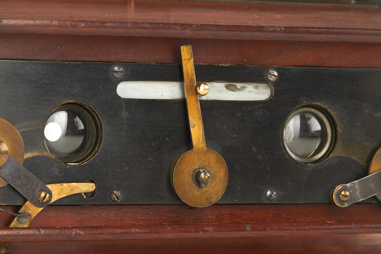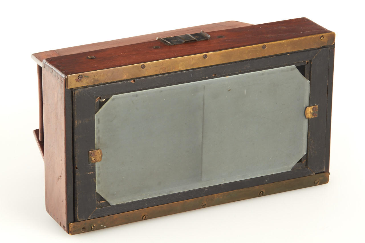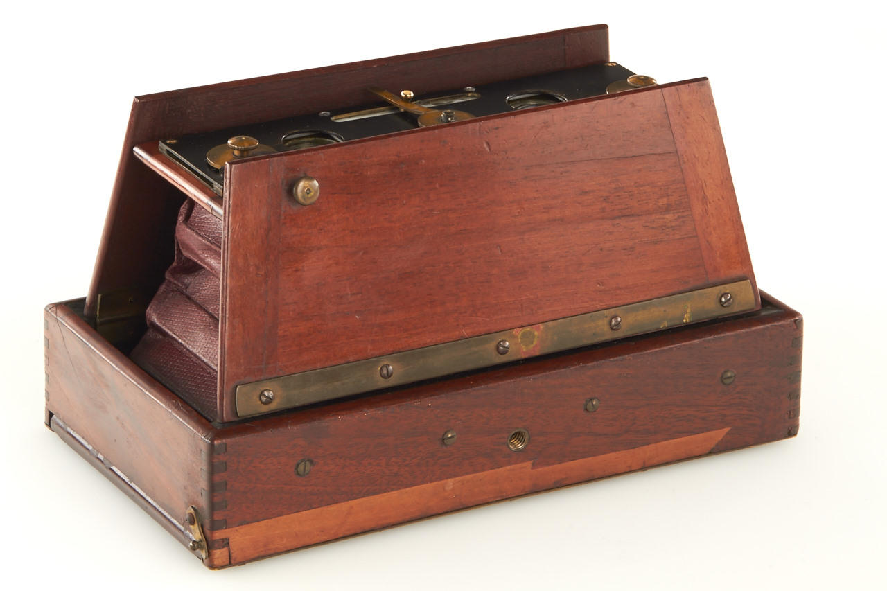 9x18cm, red bellows, strut camera with "doors", walnut construction with brass fittings, two Aplanat lenses, brass lens board with variable guillotine shutter, focusing screen back, without viewfinder, very rare camera with some repair on base