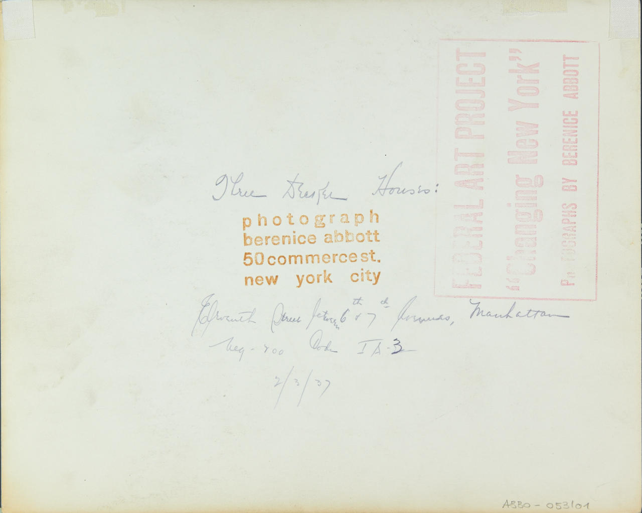 Vintage silver print 20,3 x 25,4 cm Titled, dated and annotated (incl. neg. no and image code) by the photographer in pencil on the reverse, Federal Art Project “Changing New York” stamp and “commerce st.” studio stamp on the reverse PROVENANCE Collection Kaspar M. Fleischmann