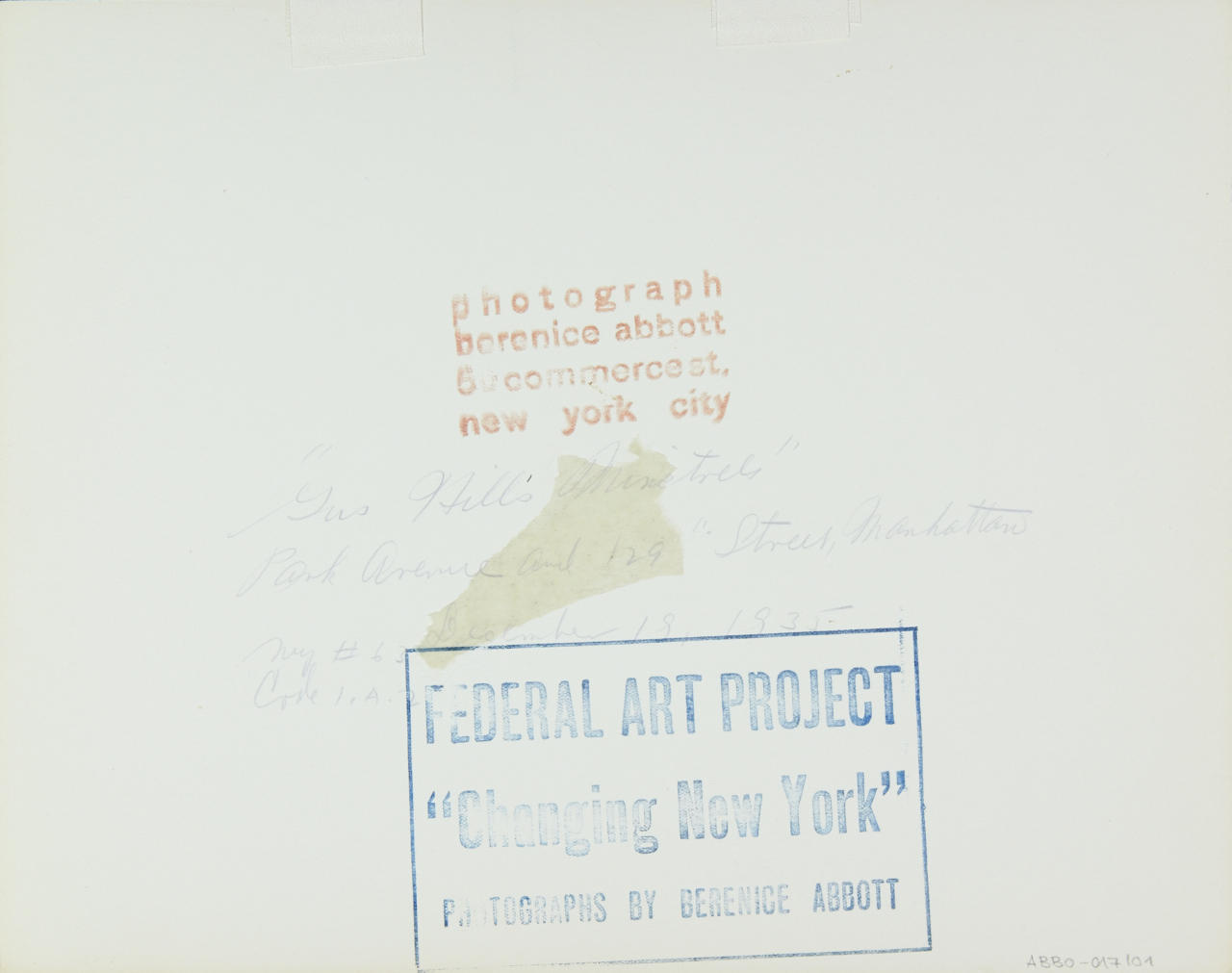 Vintage silver print 20 x 25,8 cm Titled, dated and annotated (incl. neg. no and image code) by the photographer in pencil on the reverse, Federal Art Project “Changing New York” stamp and “commerce st.” studio stamp on the reverse PROVENANCE Collection Kaspar M. Fleischmann LITERATURE Berenice Abbott, Changing New York, New York 1939, p. 170; Museum of the City of New York, Berenice Abbott. Changing New York, 1997, pl. 8 (North of 59th Street chap.).