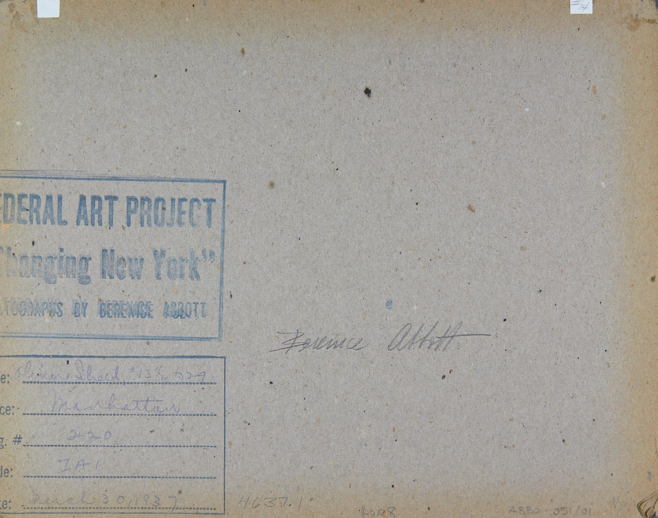 Vintage silver print, mounted on original cardbaord 18,5 x 24 cm Signed by the photographer in pencil on the reverse, titled, dated and annotated (incl. neg. no and image code) by her in pencil in the Federal Art Project “Changing New York” stamp PROVENANCE Collection Kaspar M. Fleischmann LITERATURE Museum of the City of New York, Berenice Abbott. Changing New York, 1997, pl. 17 (Lower East Side chap.).