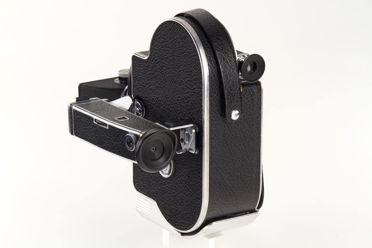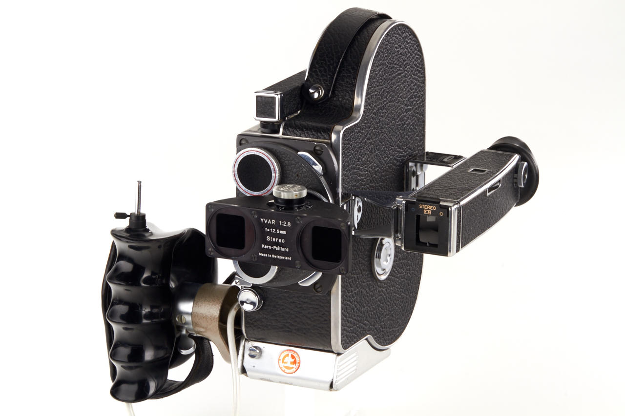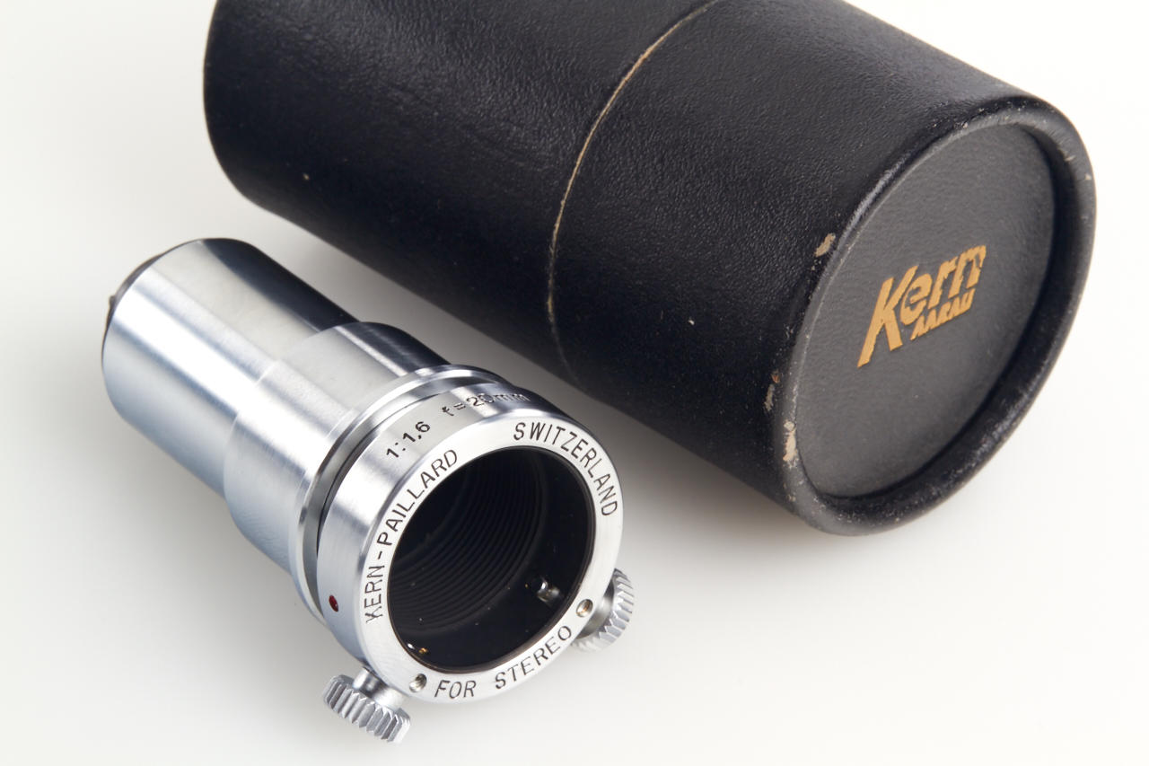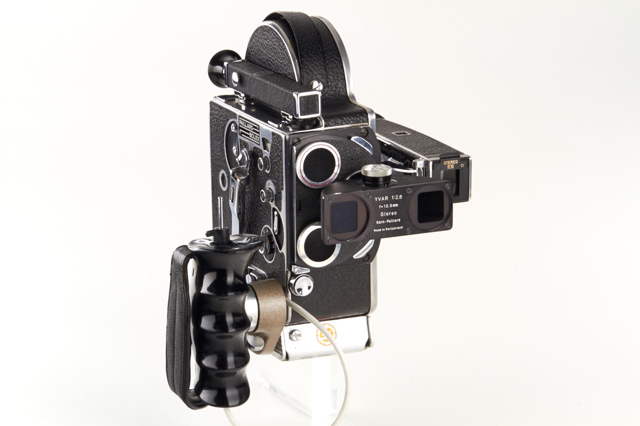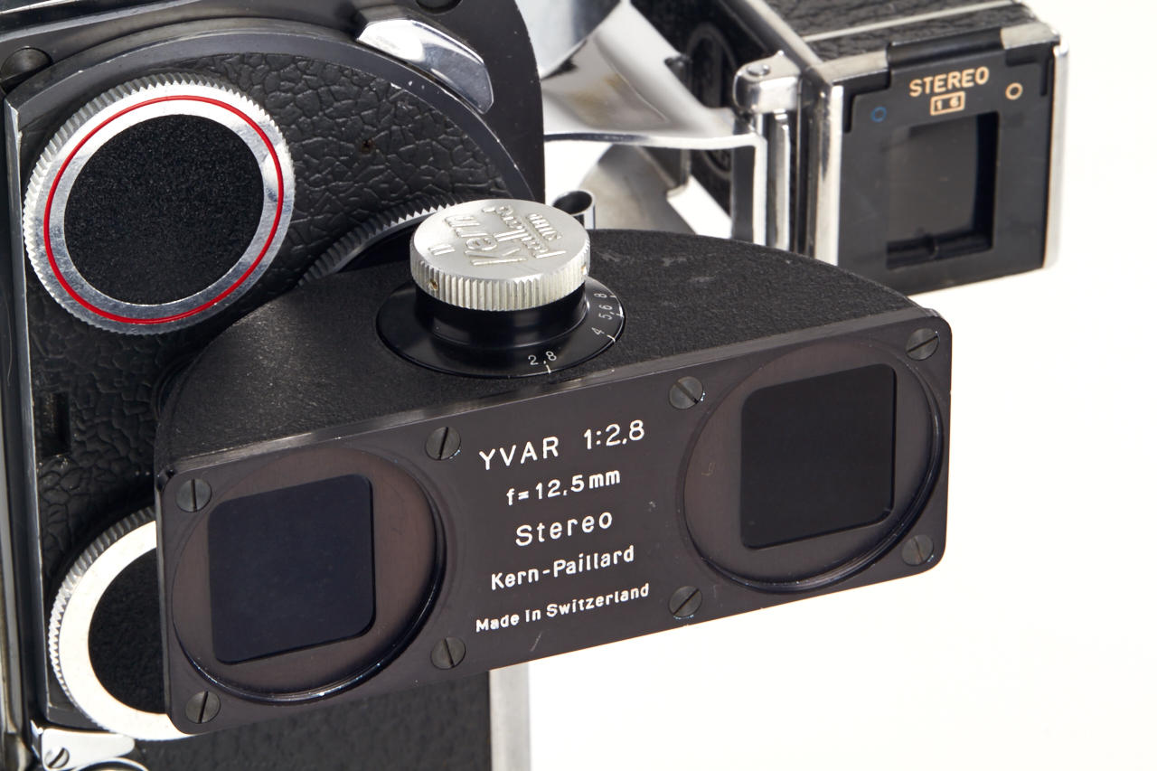 rare set including Kern-Paillard Stereo attachment Yvar 2.8/12.5mm (perfect lenses, caps), attached special Stereo finder and release grip, with Kern Stereo projection lens 1.6/20mm with maker's box - all in very fine and working condition