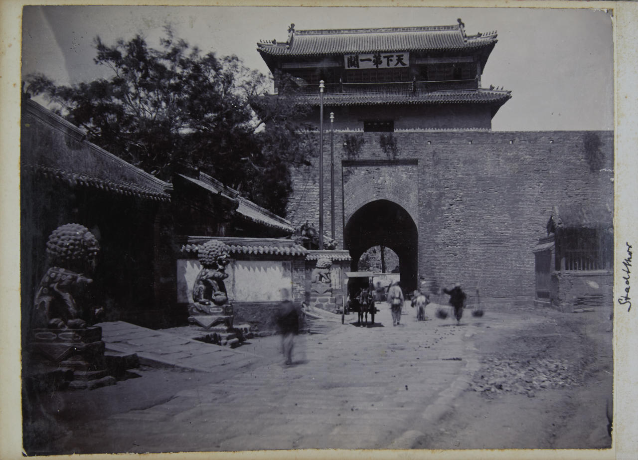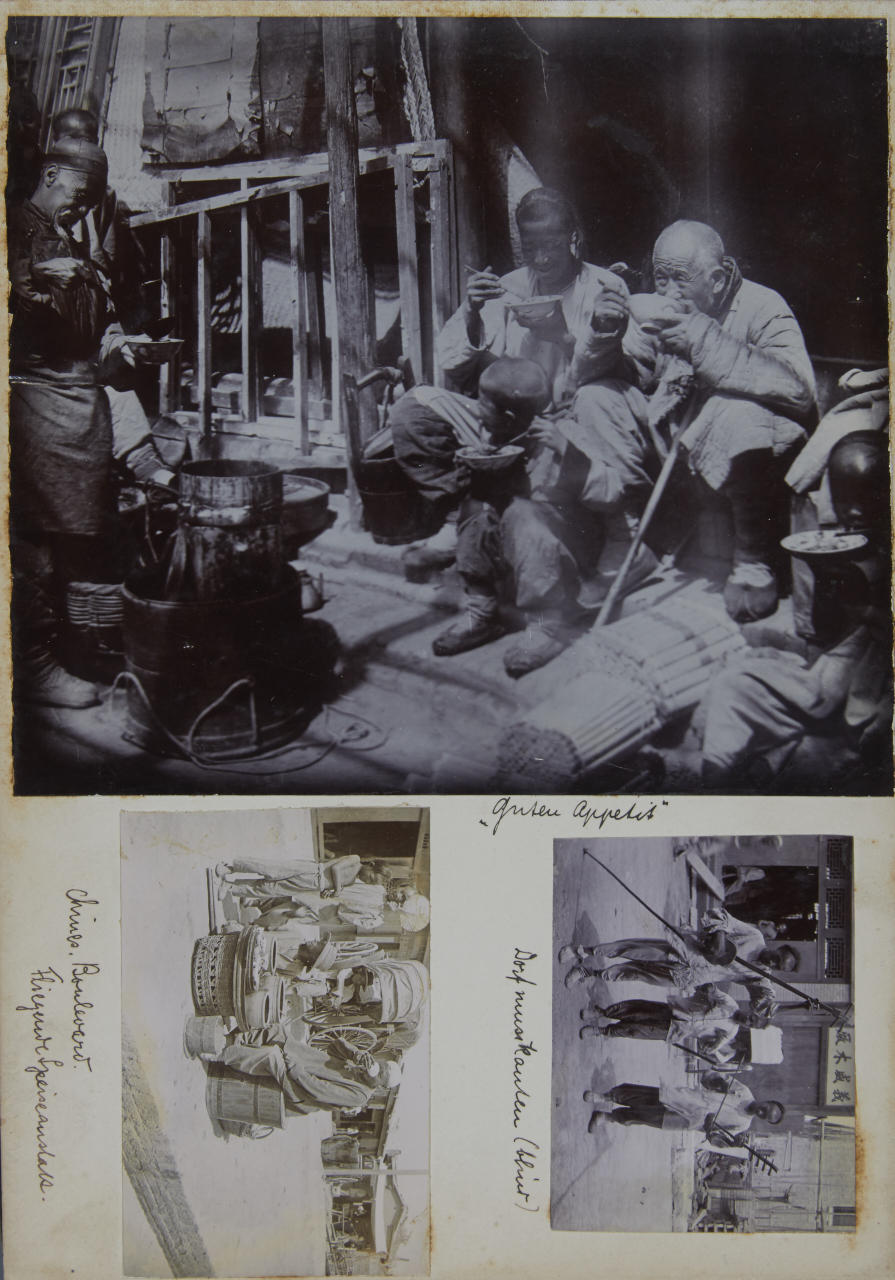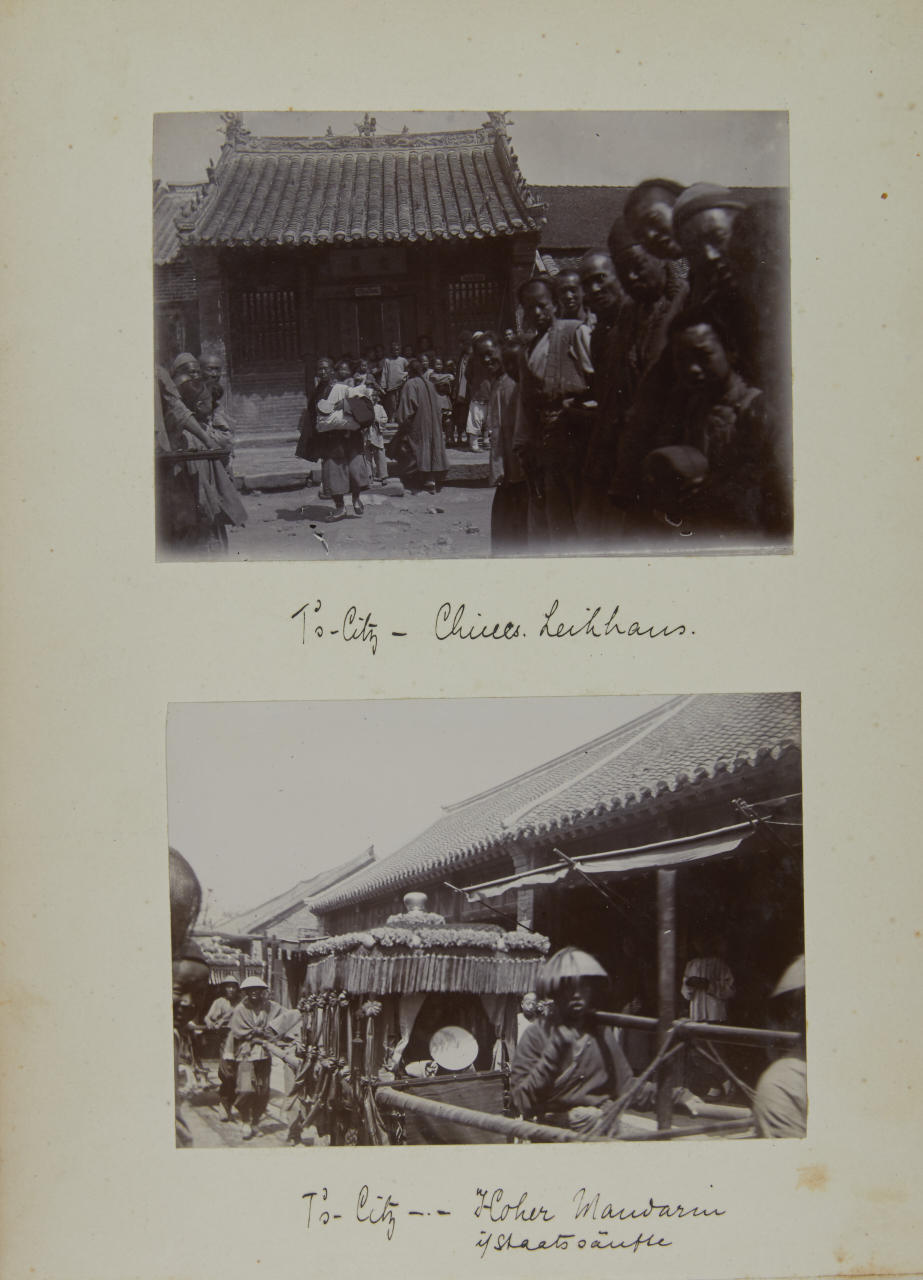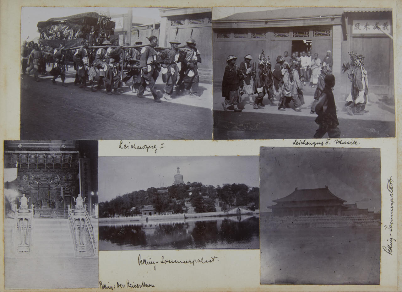 - 1 lacquer album (c. 20 x 28 cm) containing c. 90 collodion prints, the prints are mounted inside on the original cardboard pages sizes vary: majority 12 x 8 cm or 12 x 18 cm most of the images are annotated by the photographer in ink on the mount - 44 loose vintage silver prints, each c. 20 x 25 cm, the majority annotated in pencil and with numeric stamp and Po-Keh-Printing-Peking stamp on the reverse - accompanied by 1 small album with images of Beijings Temple of Heaven (24 gelatin silver prints, each c. 8 x 10 cm) and a couple of post cards