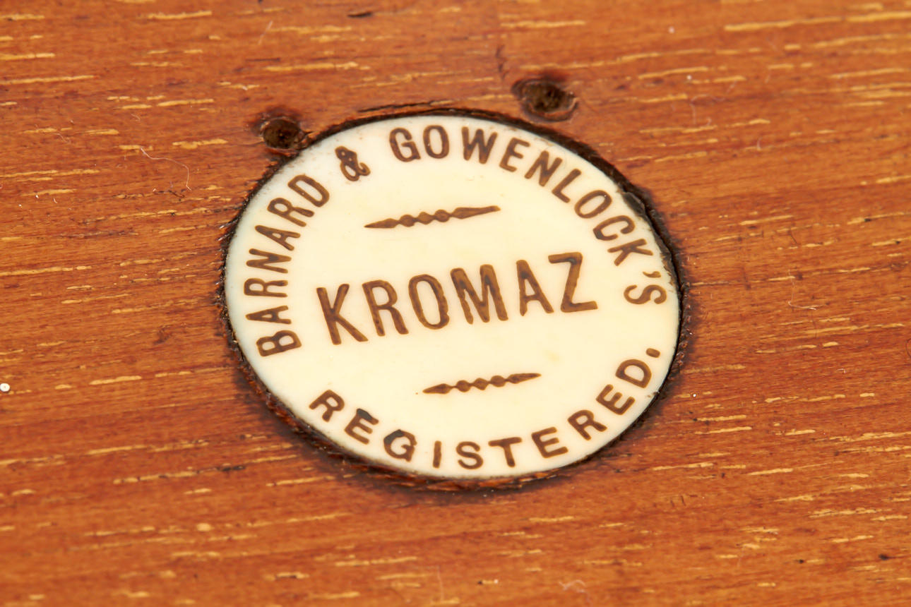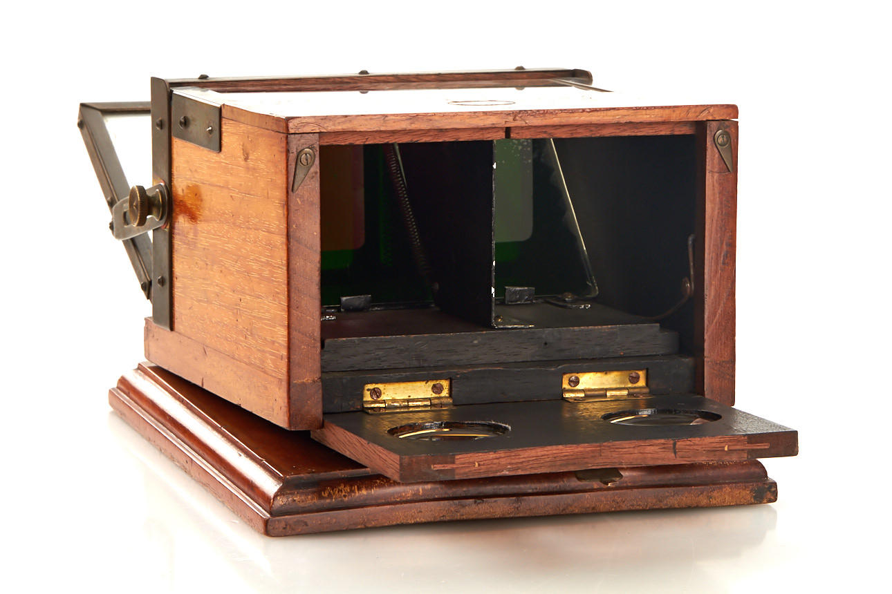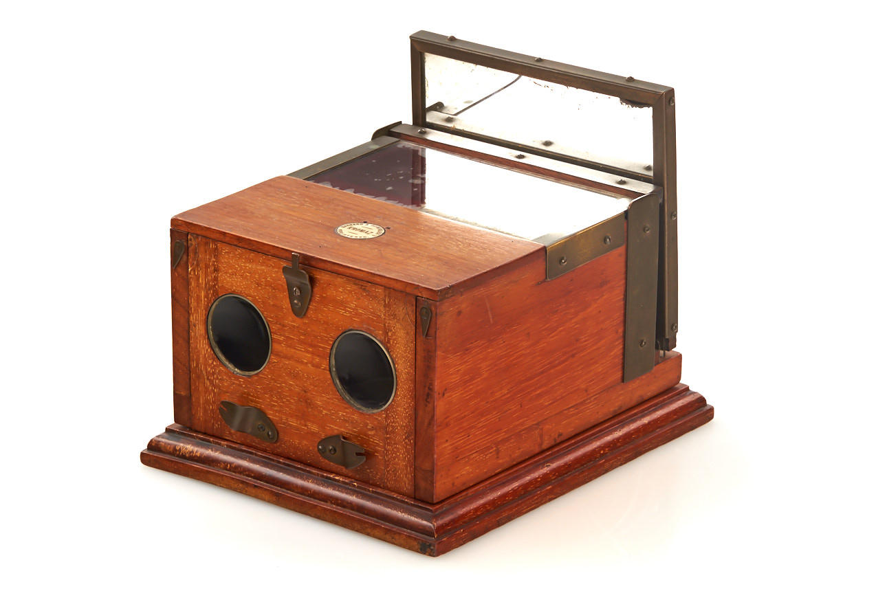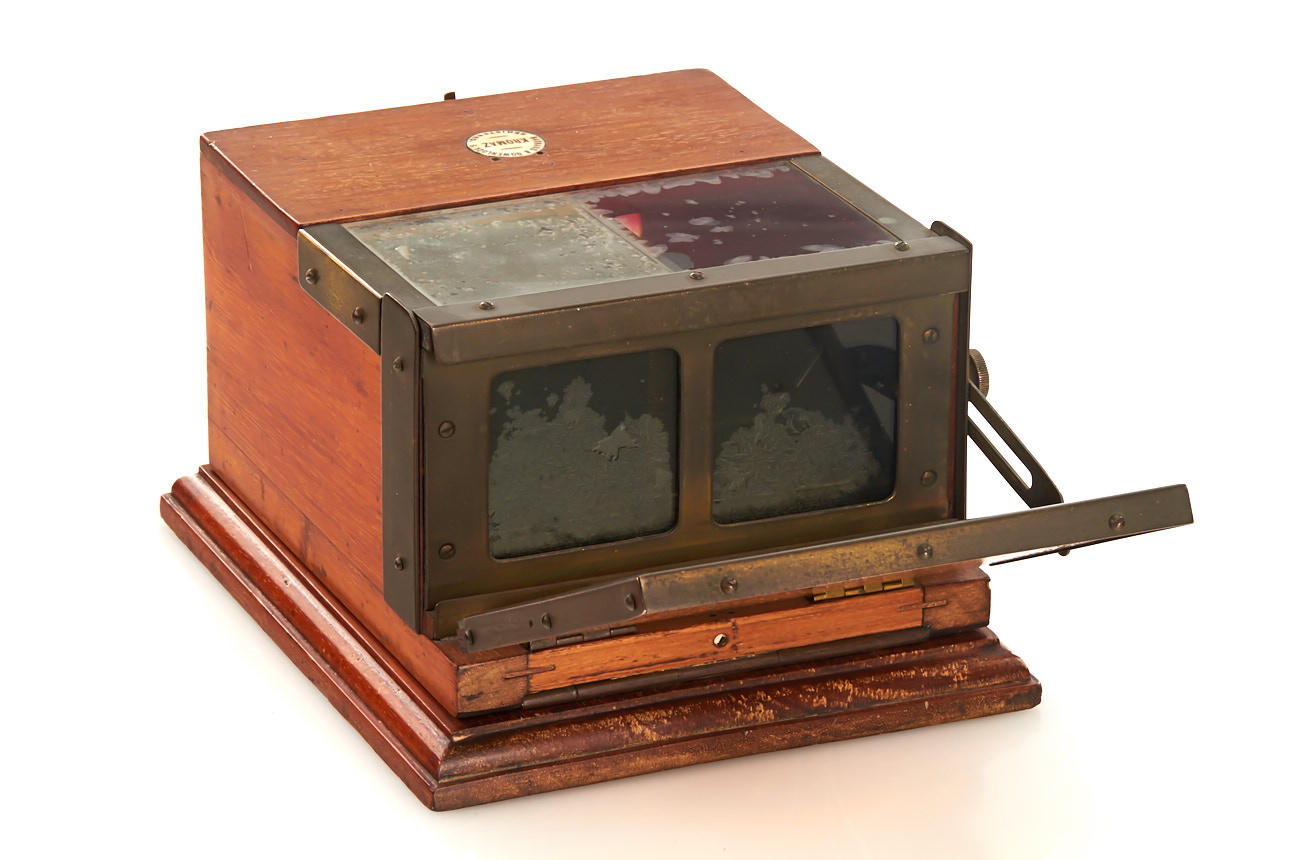 rare mahogany stereoscope viewer with three filters (red and blue side-by-side and green below), in very good original condition, filters partially corroded. The Kromaz system patented in England in the late 1890s was a rival to Ives's Kromskop. The system of filters was arranged in such a way that the stereoscopic colour-separation transparencies were laid on a viewer similar in appearance to the Kromskop viewer but in a single step, with label: 'BARNARD & GOWENLOCK'S KROMAZ REGISTERED', very rare, only a few are known to exist