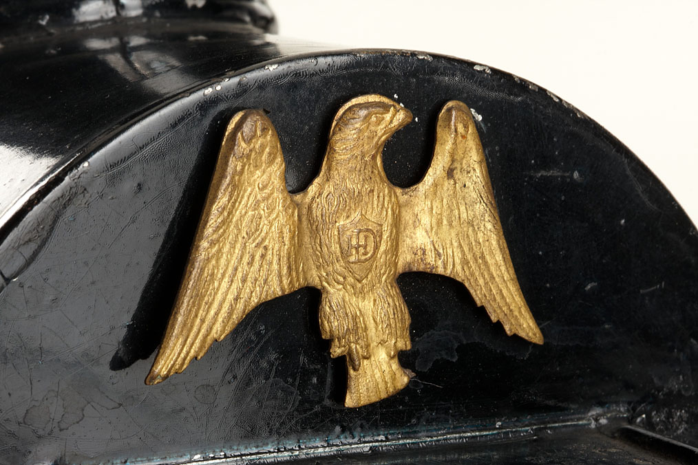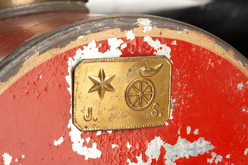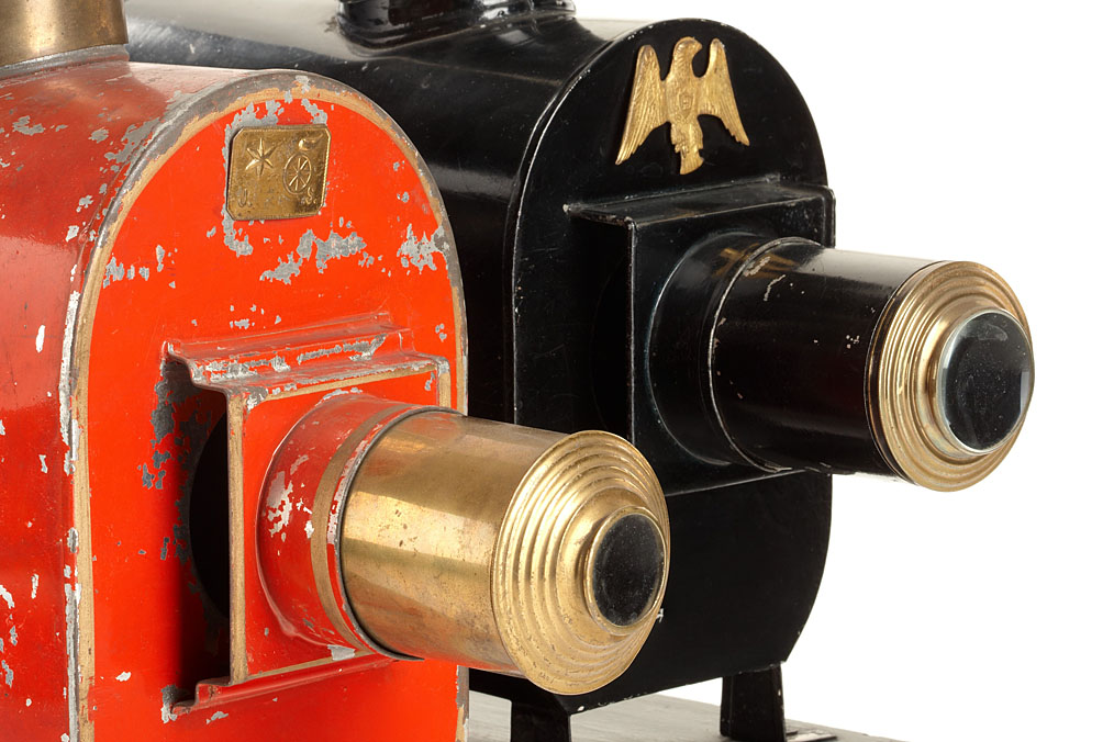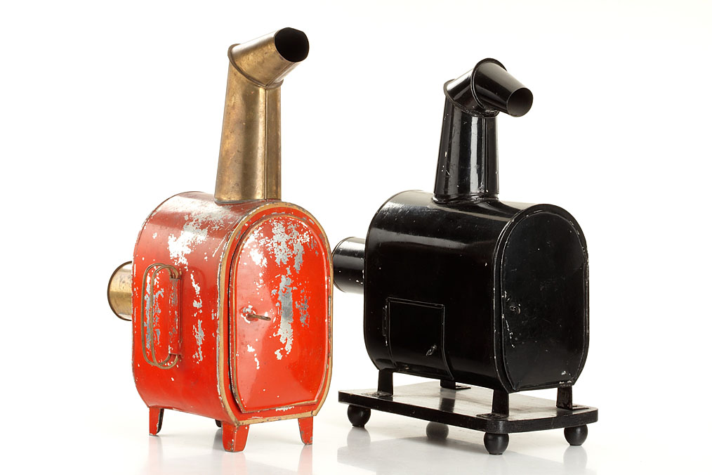 two classical barrel-shaped lanterns, (1) made by Jean Schoenner of Nuremberg in c. 1880, red painted tin body with gilded lining, the lens and the chimney are made of brass, handle made of bound wire on the left side, embossed makers label on the front, some wear otherwise in nice original condition, height: 35cm, (2) black painted barrel-shaped lantern mounted on a wooden panel, presumably German and almost identical with the Schoenner 'Fassmodell no 200-2006' from 1890, gilded makers label in shape of an eagle with the monogram 'HD', wonderful original condition, complete with the original lens and petroleum burner. An exceptionally well preserved lantern! Height: 34mm